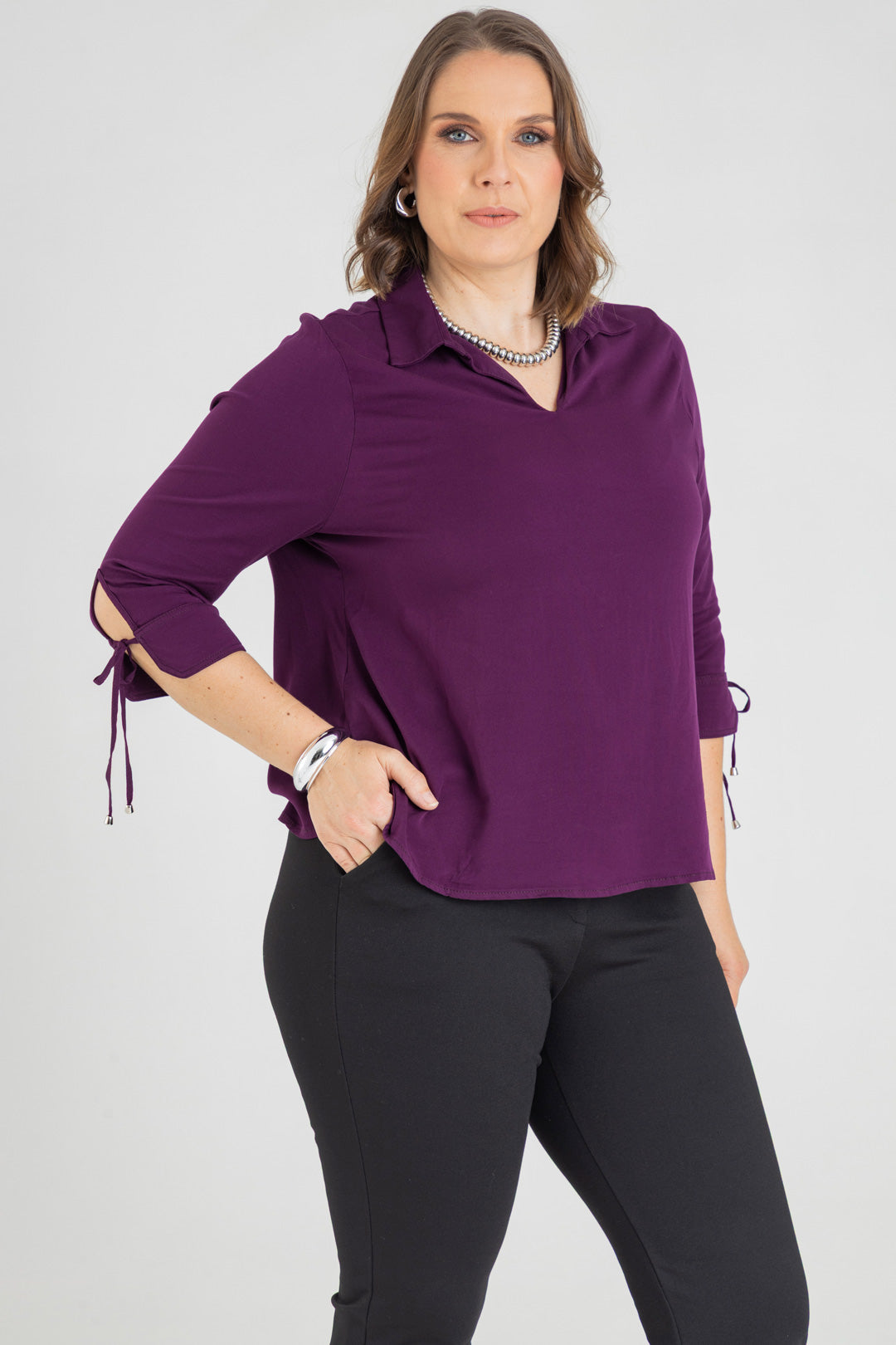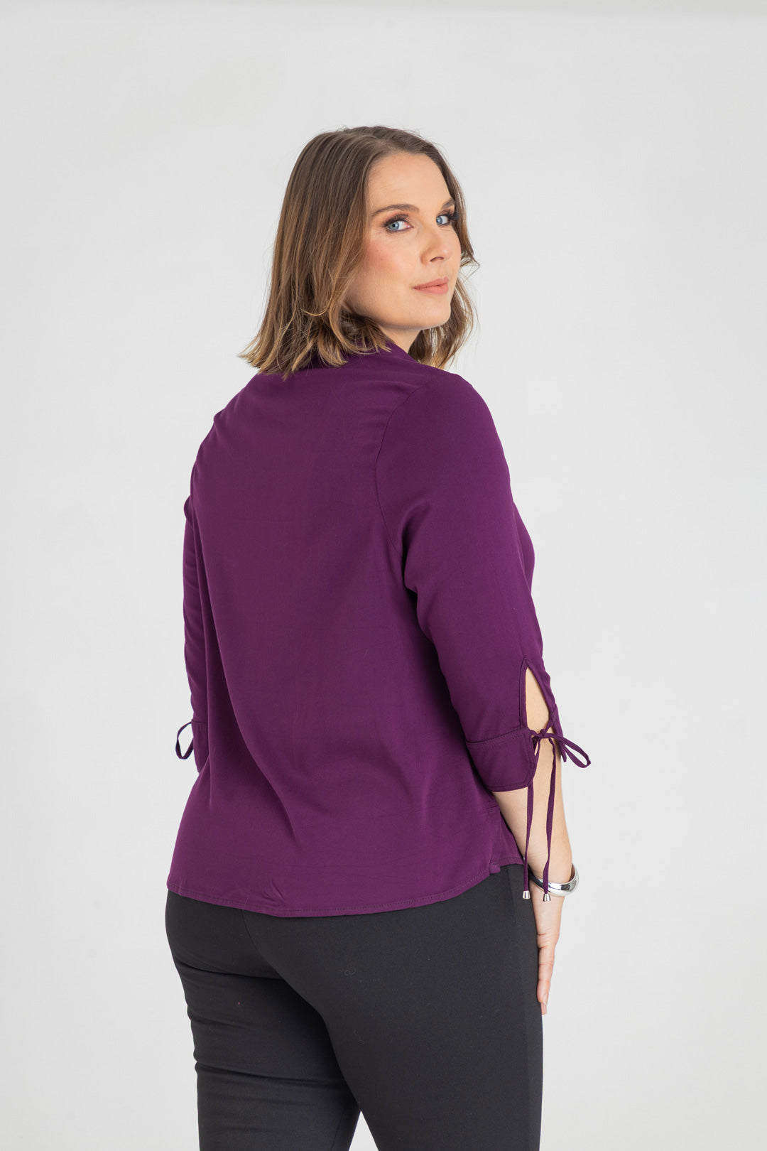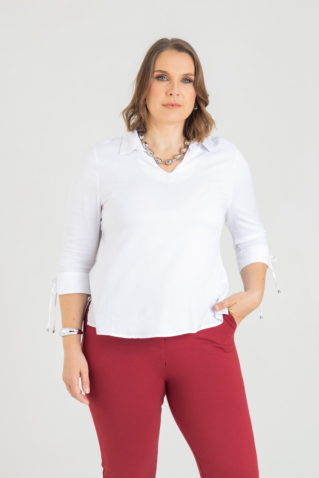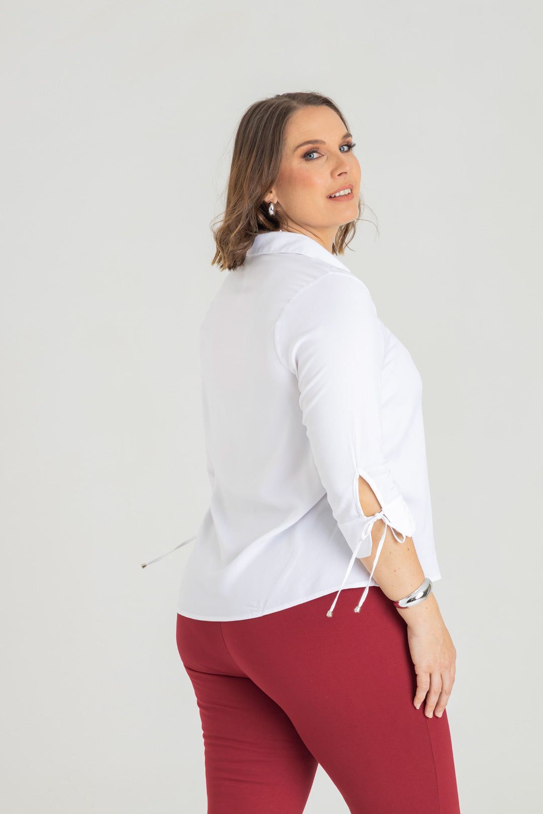Blusa con cuello camisero y abertura en escote, manga 3/4 con abertura y tiras para moño. Elaborada en Rayón twill spx.