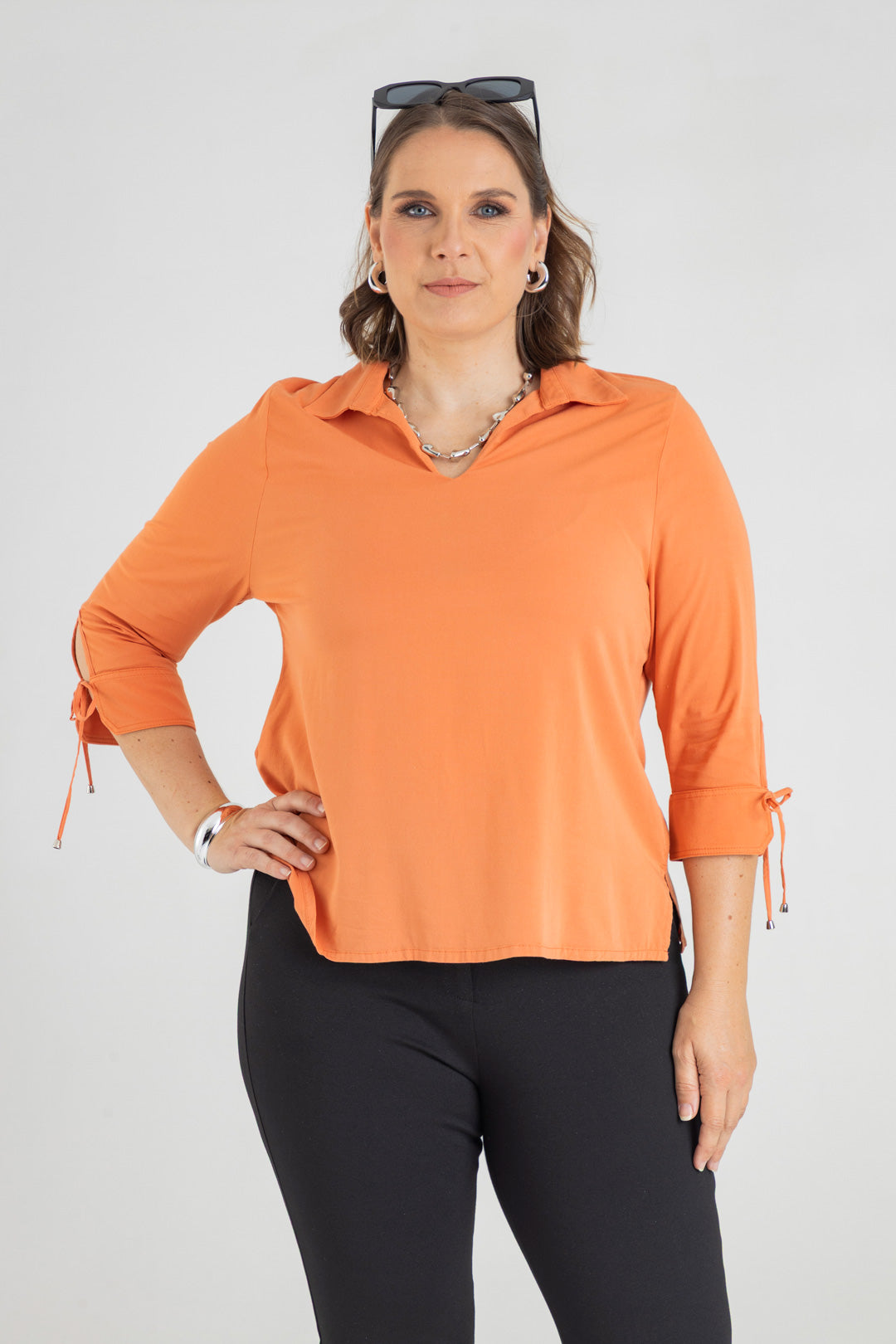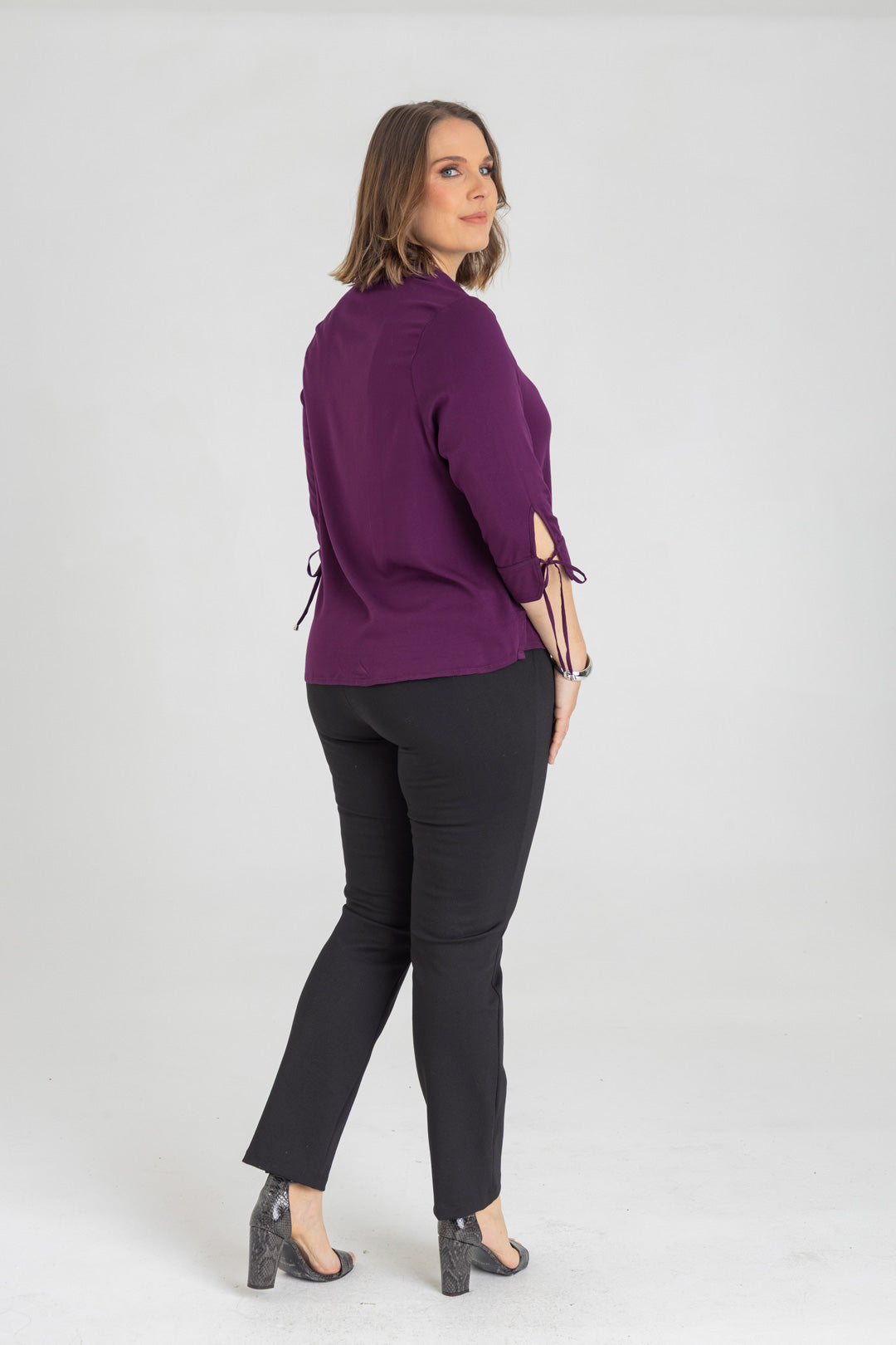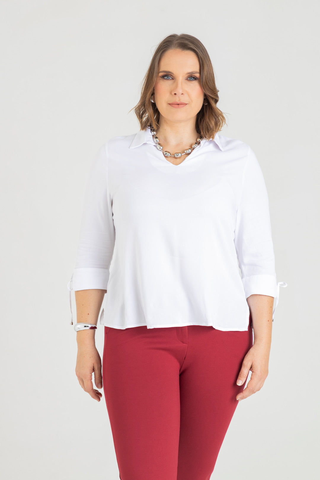 Blusa con cuello camisero y abertura en escote, manga 3/4 con abertura y tiras para moño. Elaborada en Rayón twill spx.