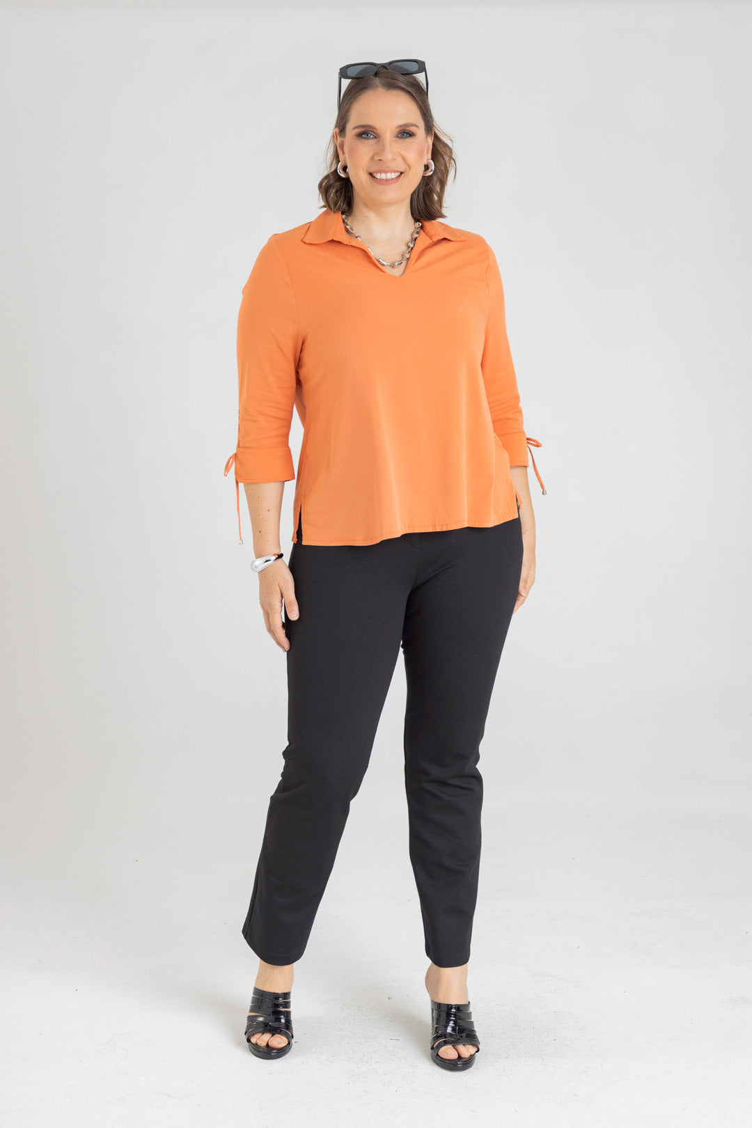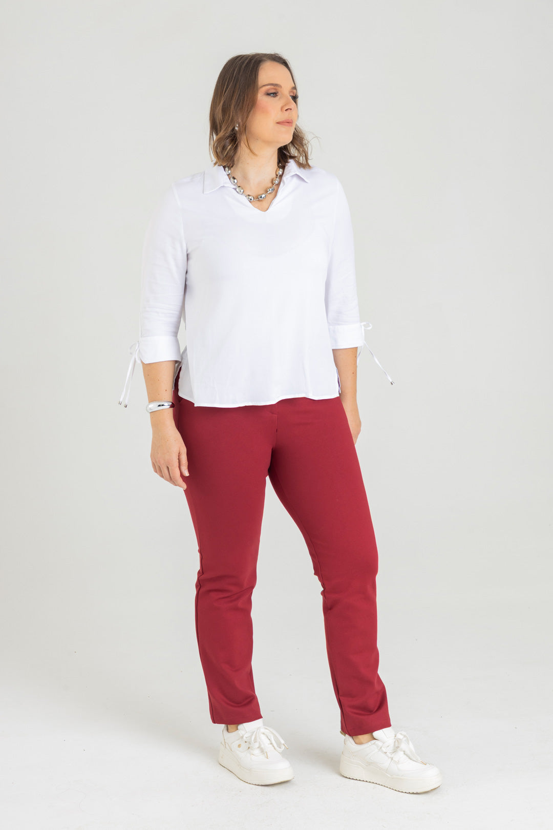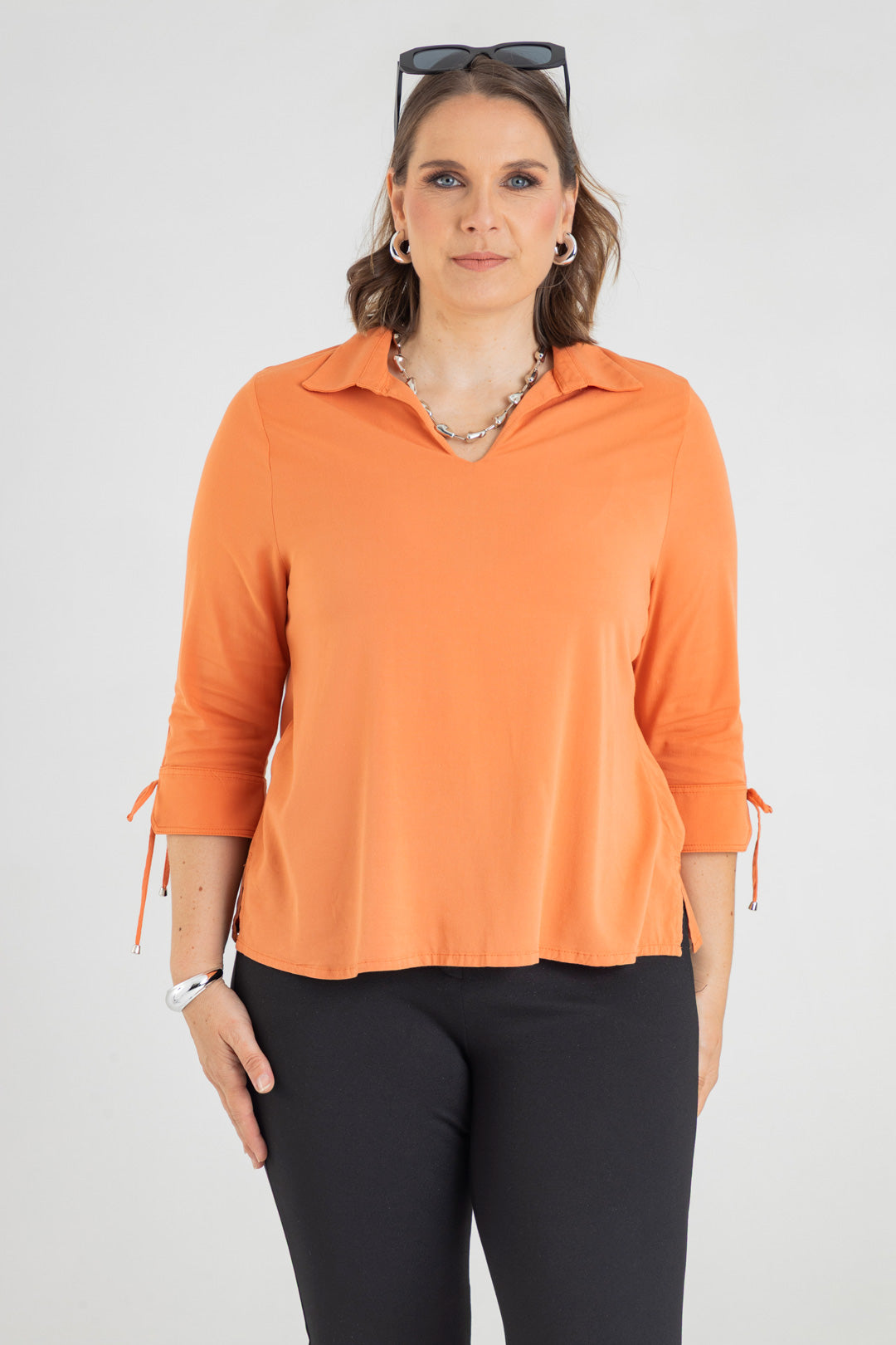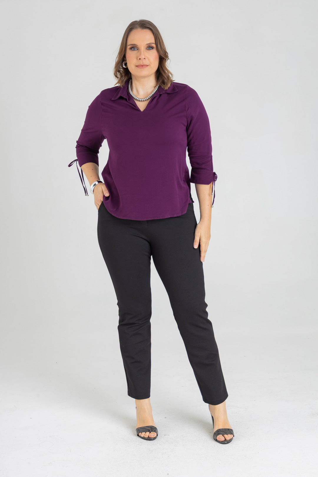 Blusa con cuello camisero y abertura en escote, manga 3/4 con abertura y tiras para moño. Elaborada en Rayón twill spx.