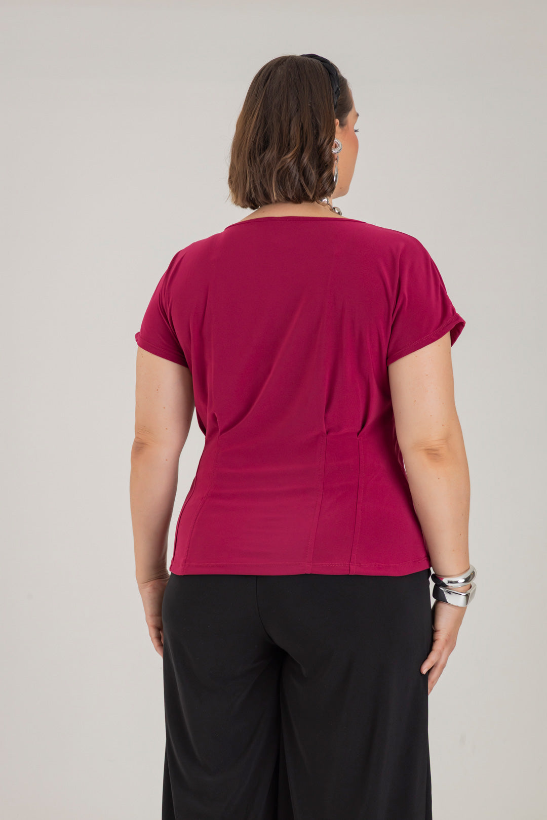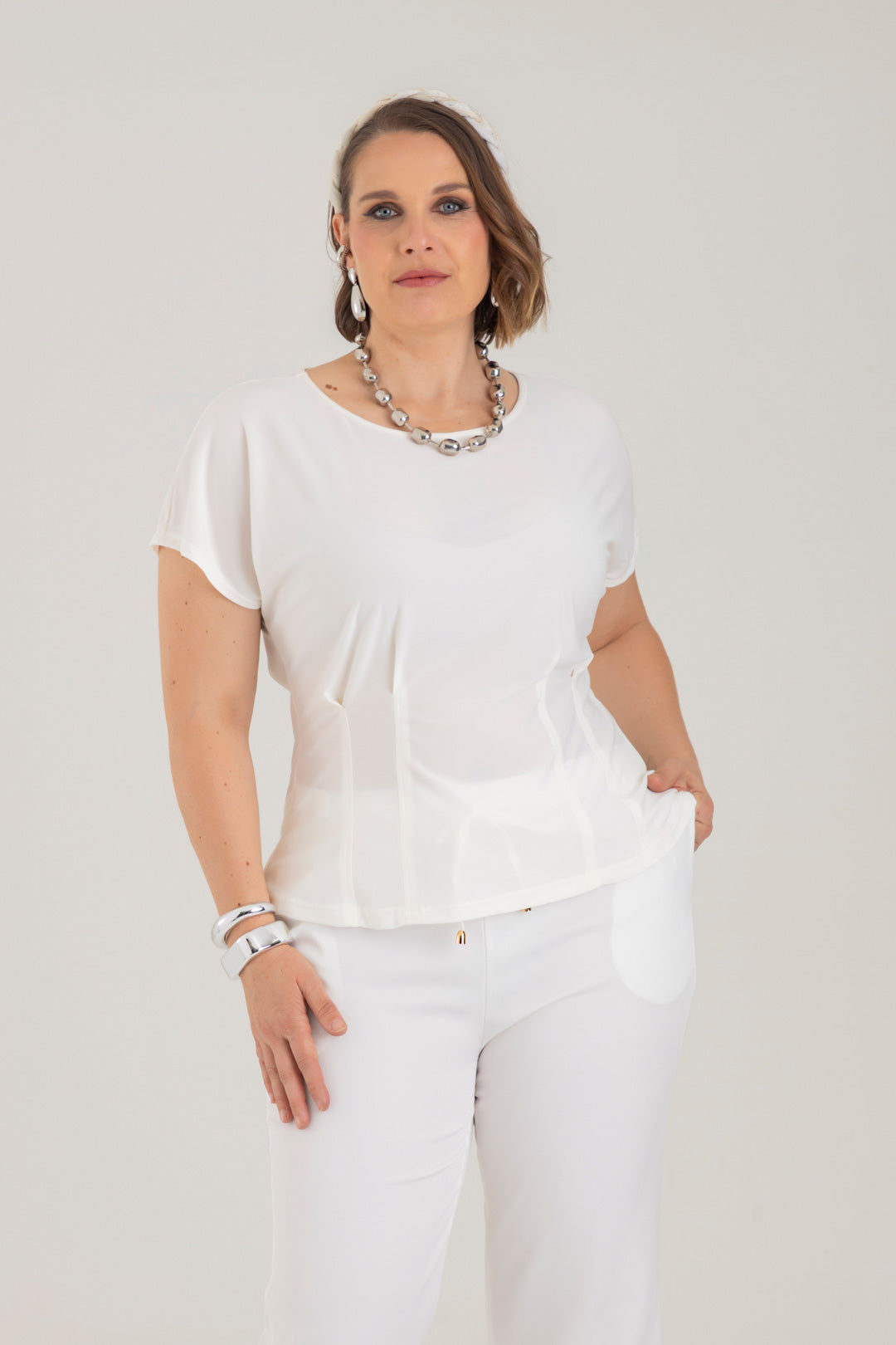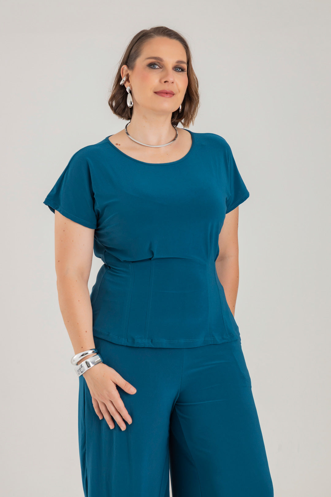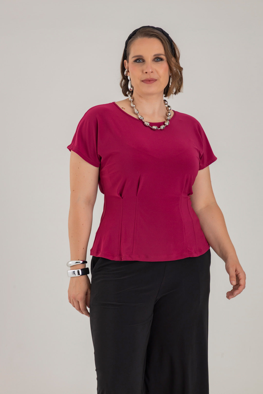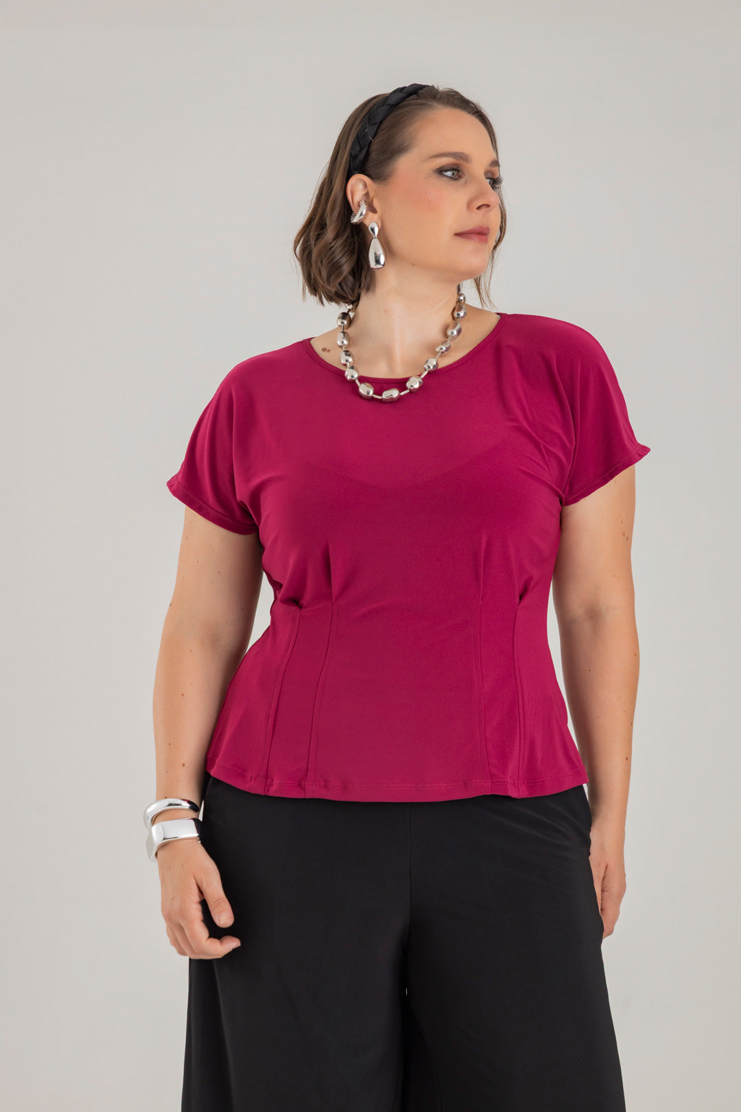 Blusa cuello redondo con manga incorporada y detalle de pinzas. Elaborada en Acetato fondo entero.