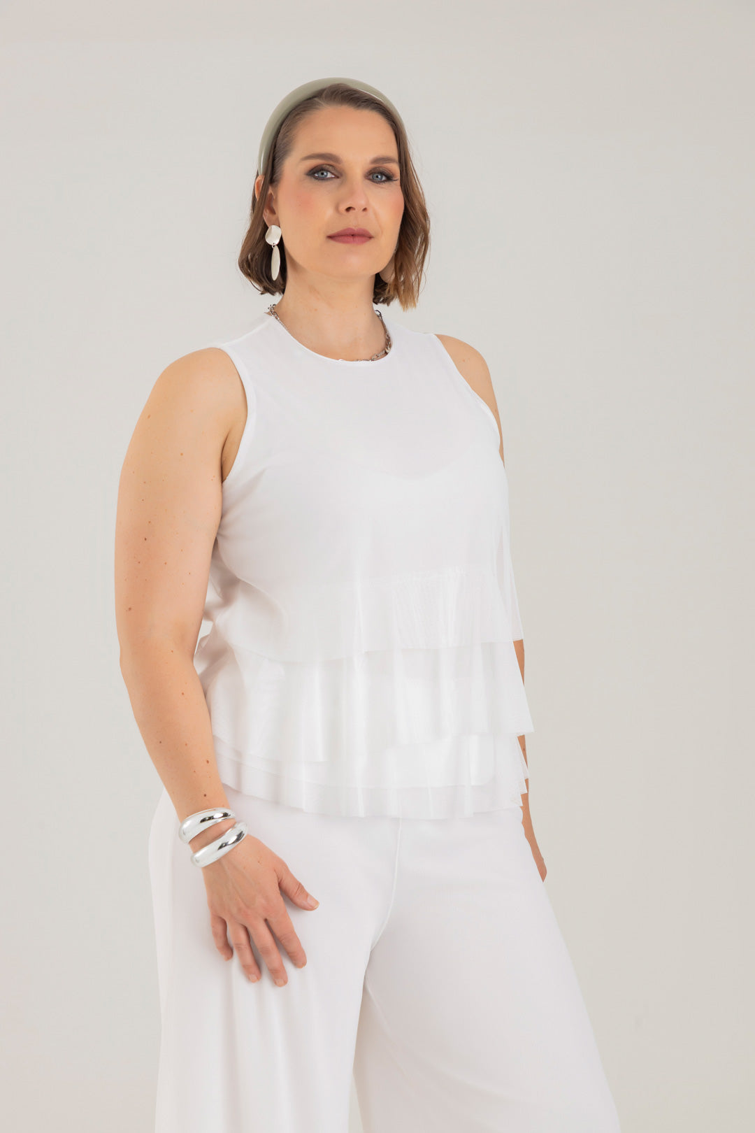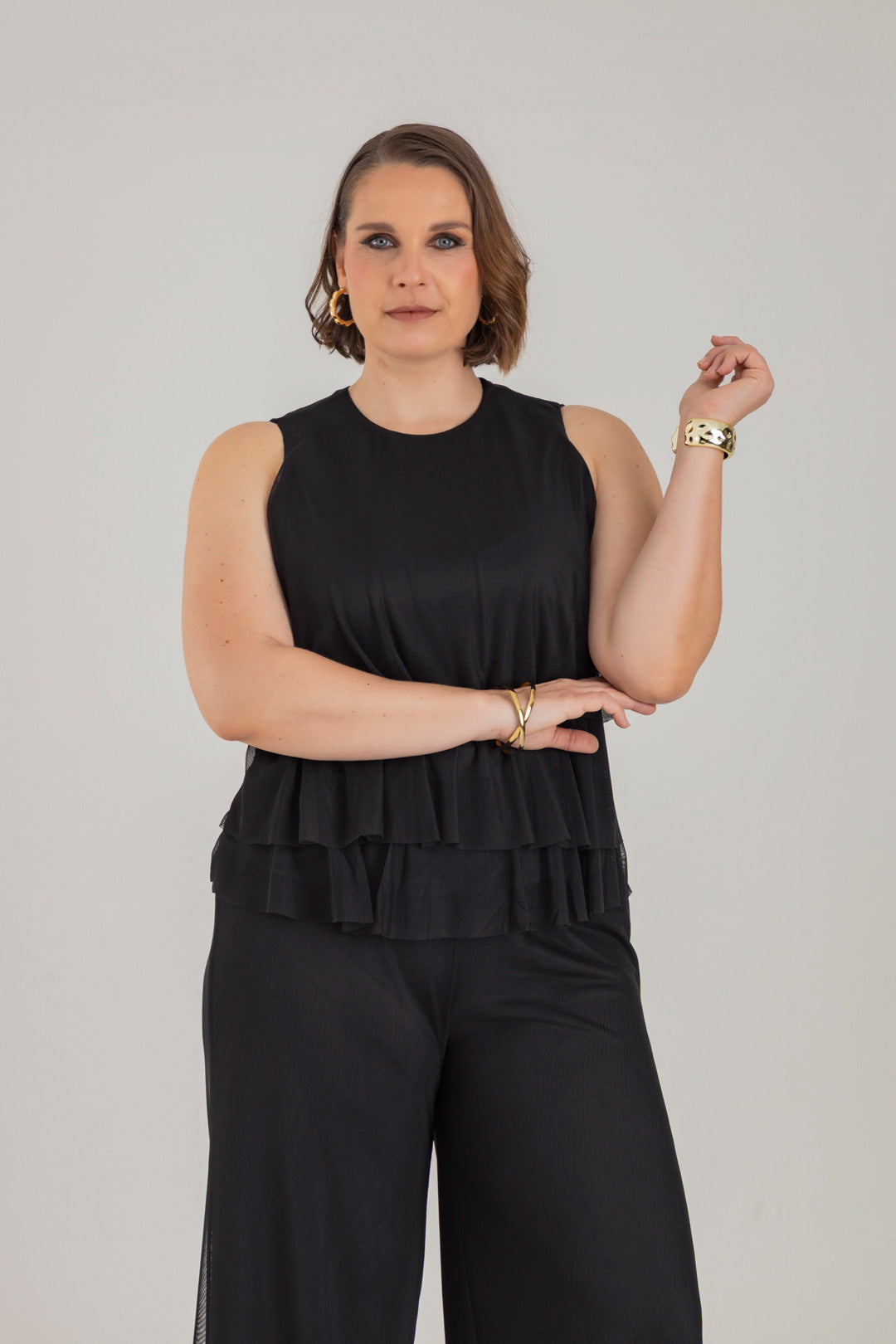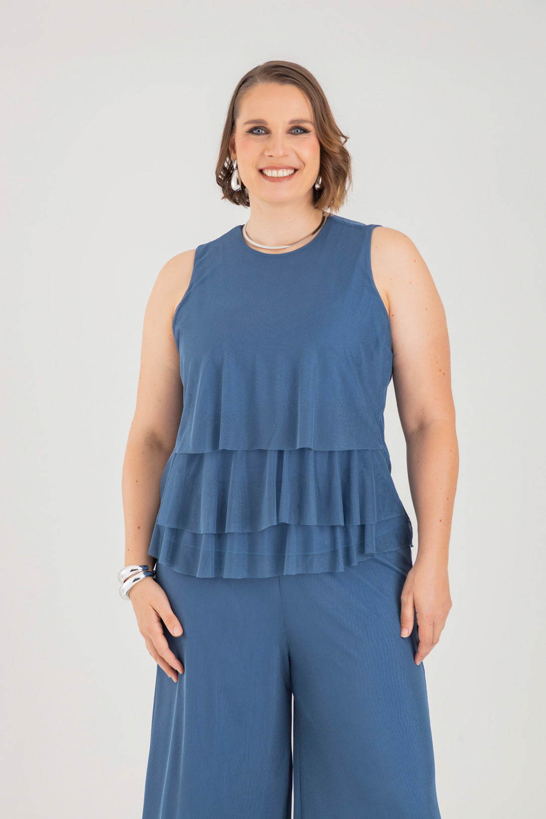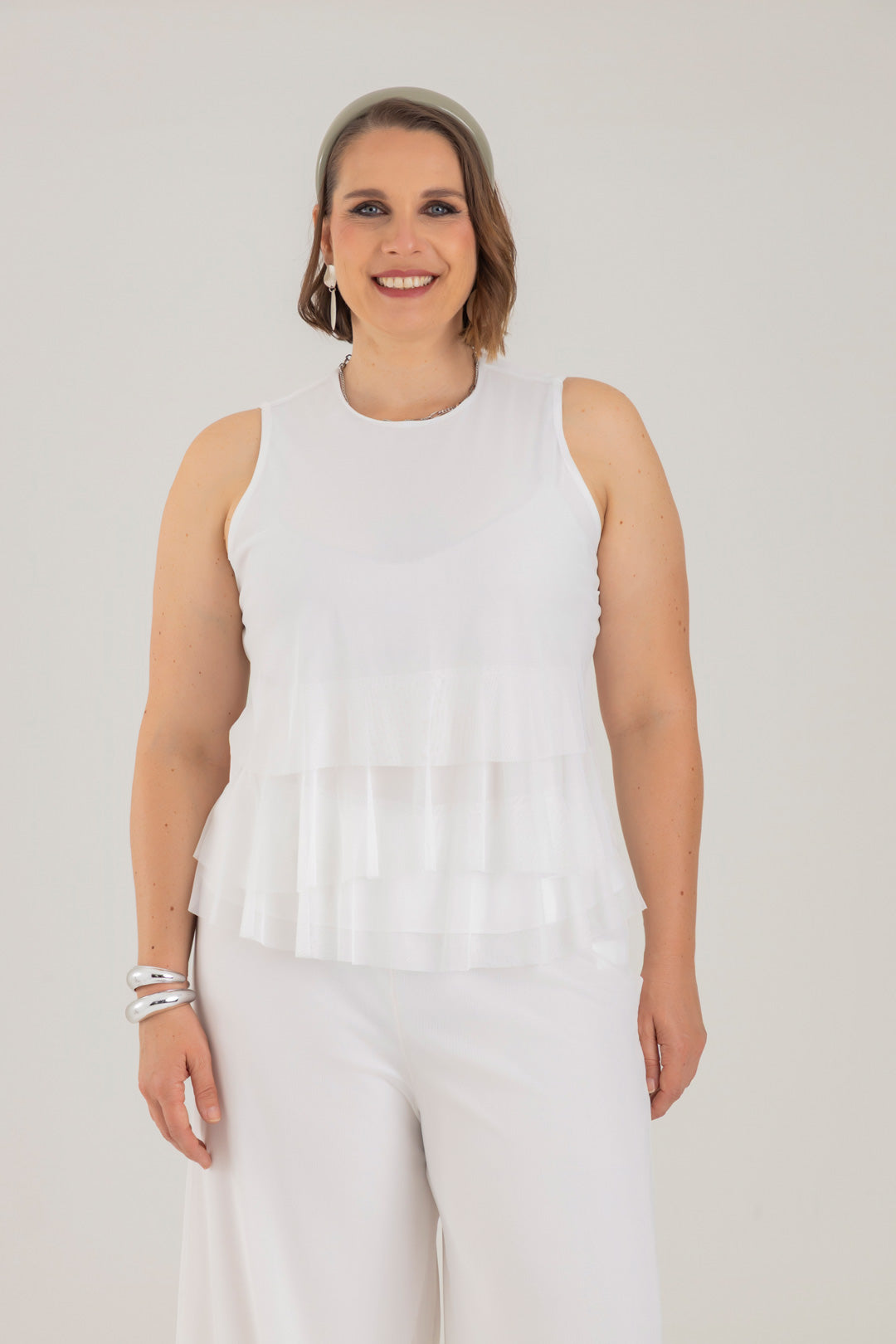 Blusa en capas con escote redondo. Elaborada en Mallatex fondo entero.