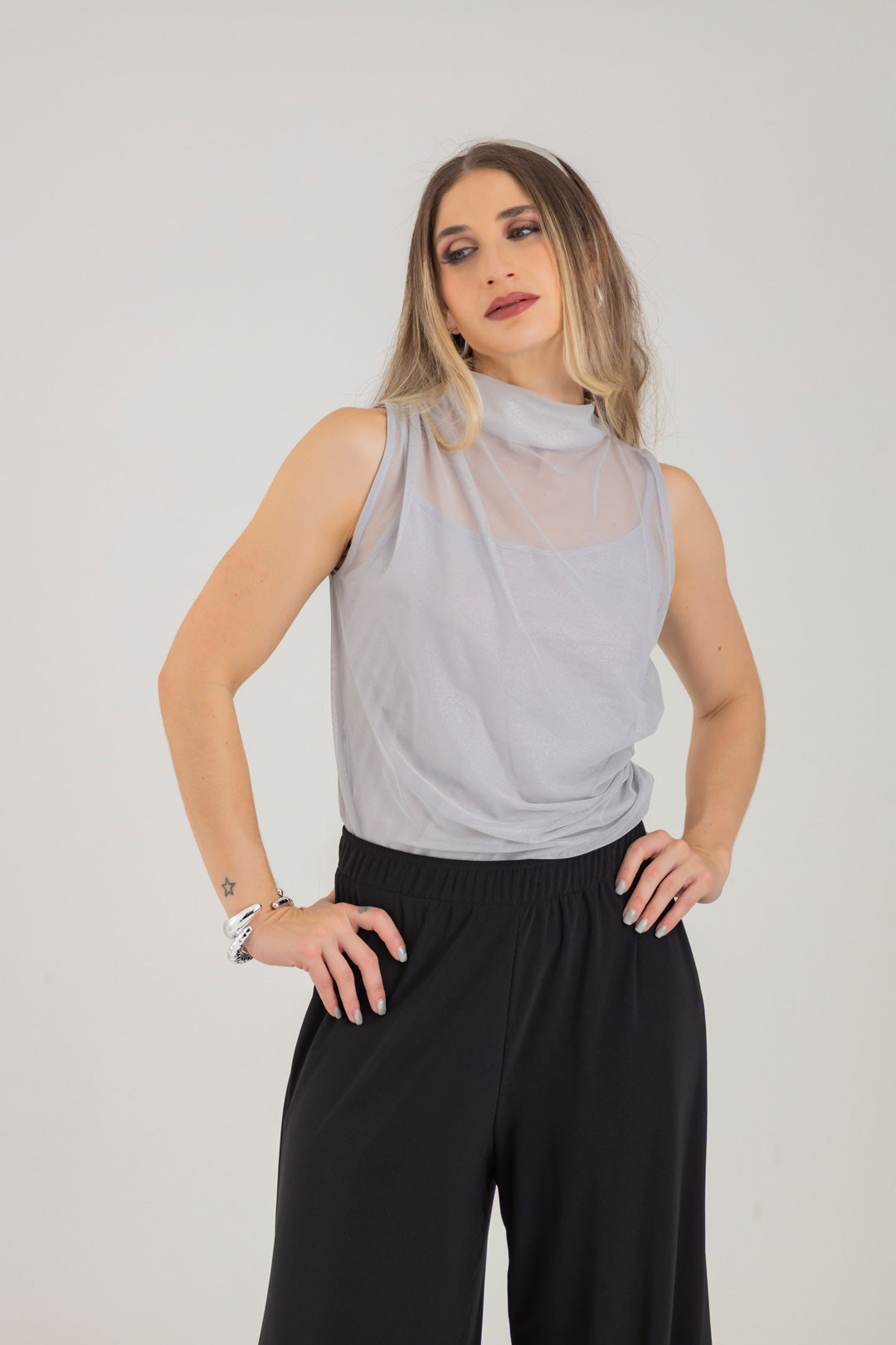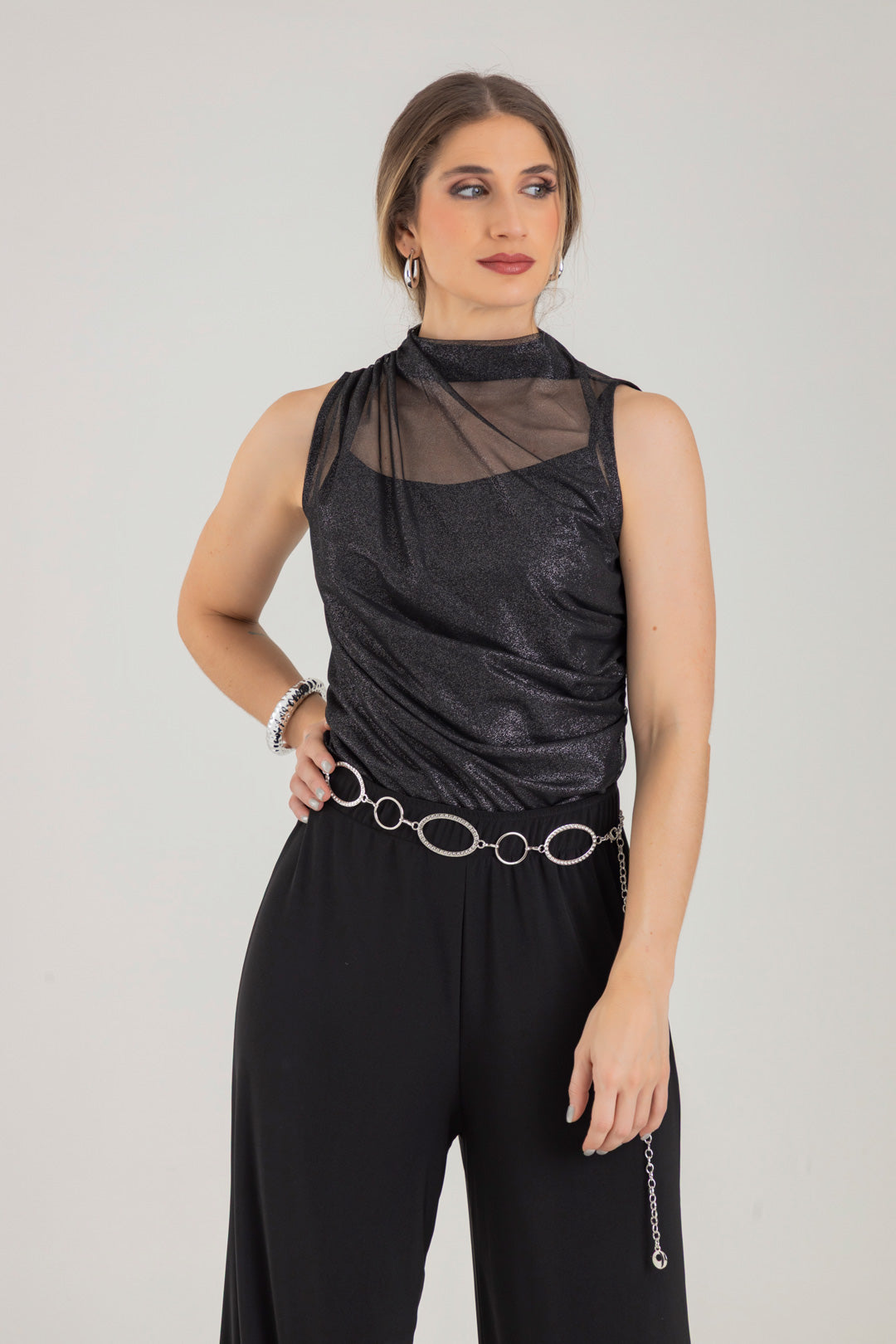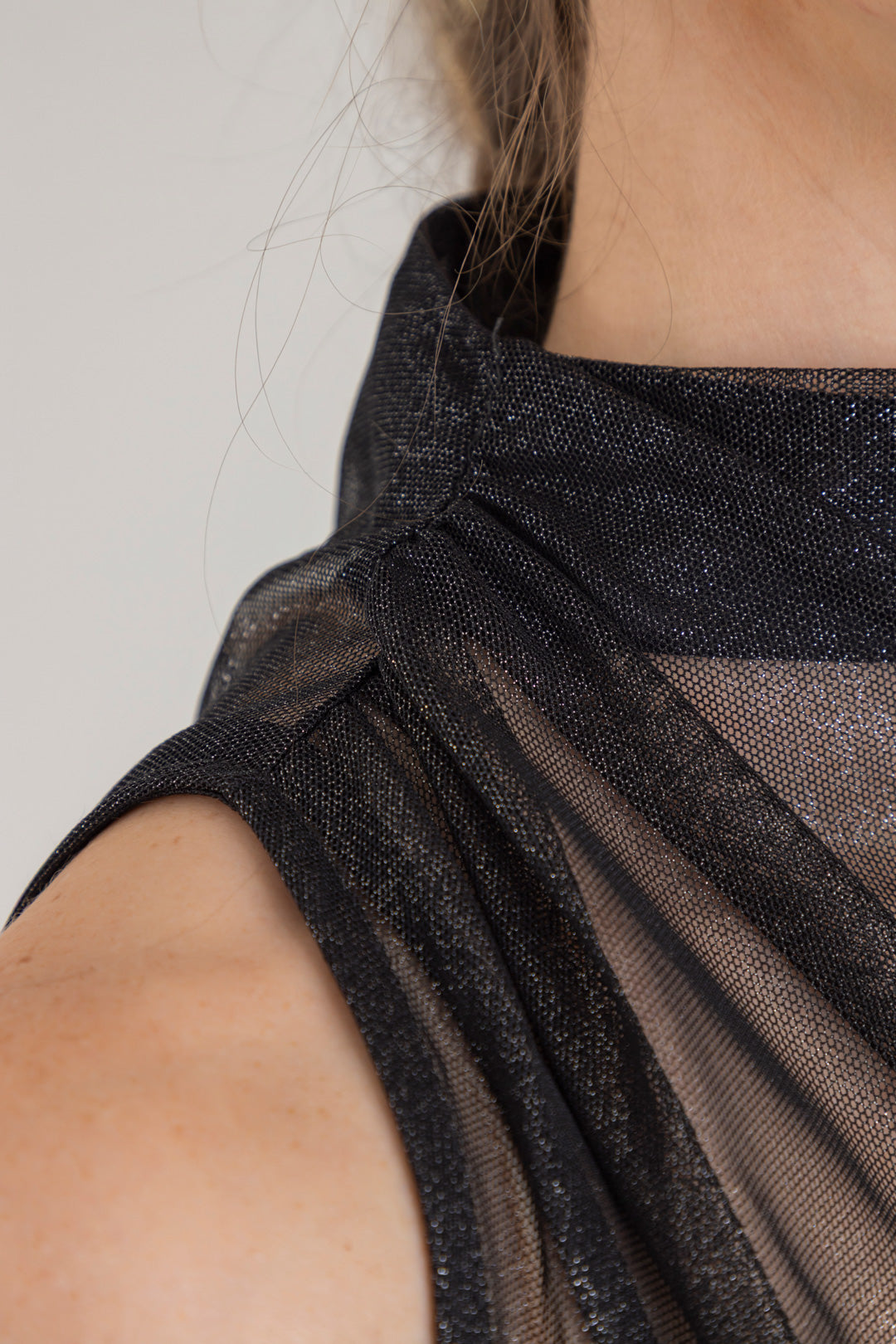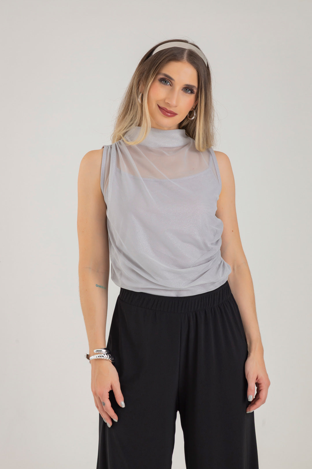 Blusa escote ojal, con detalle de recogido en hombro y costado. Elaborada en Mallatex con foil.