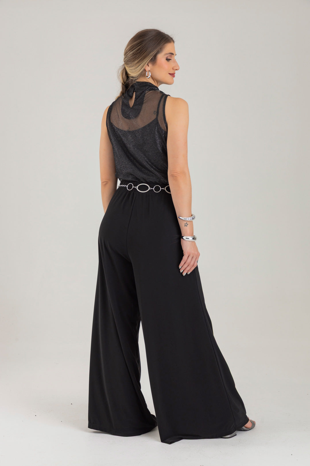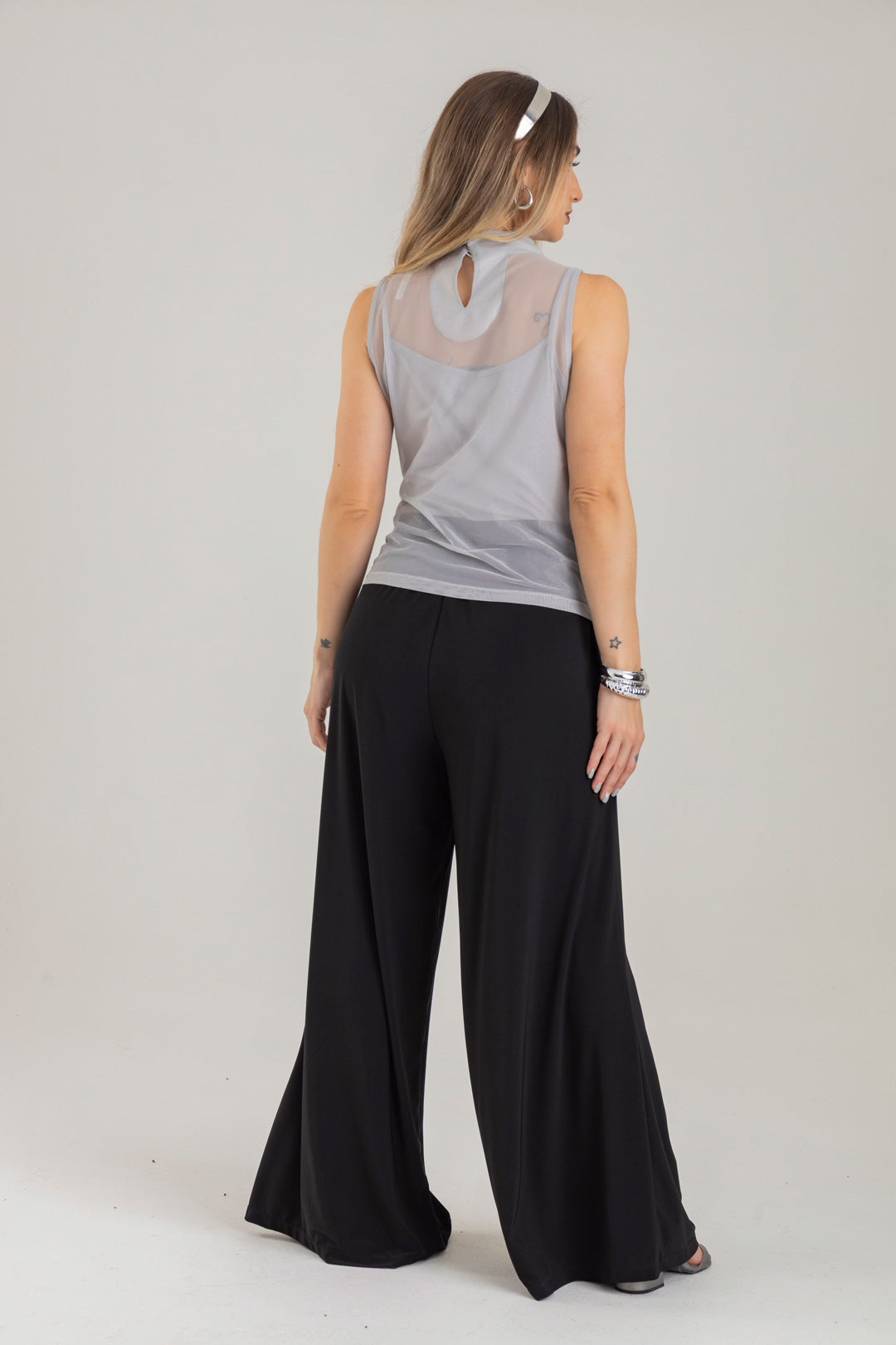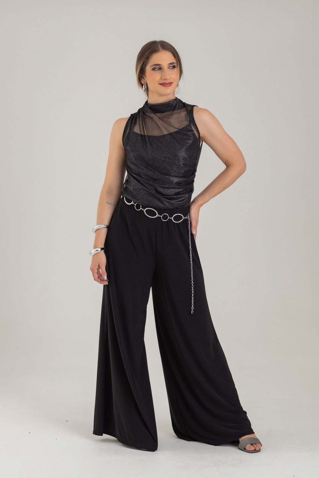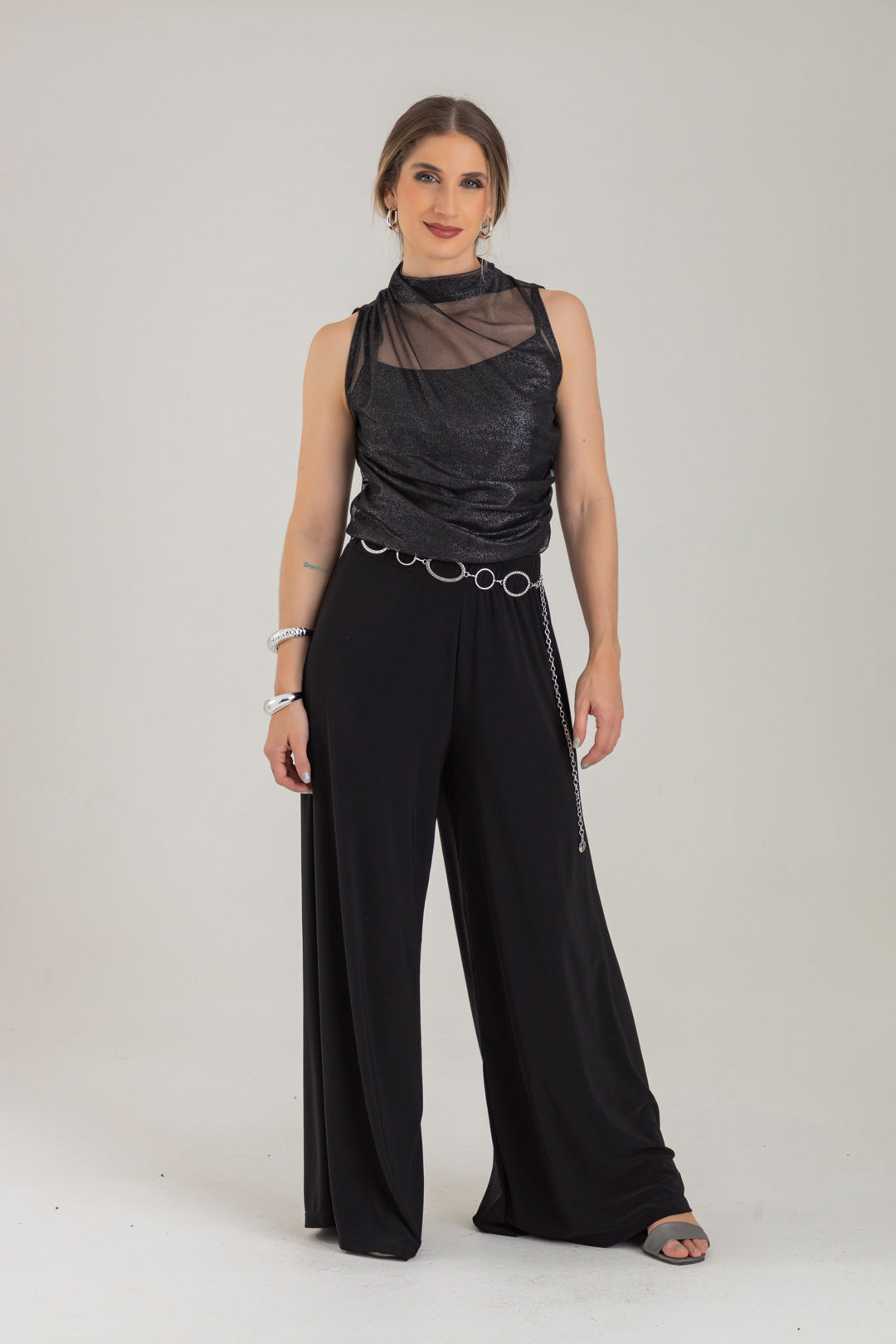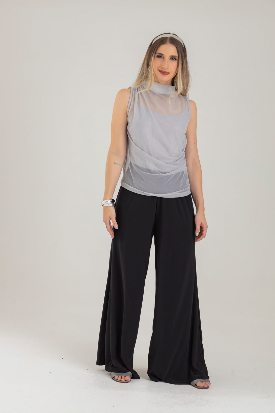 Blusa escote ojal, con detalle de recogido en hombro y costado. Elaborada en Mallatex con foil.