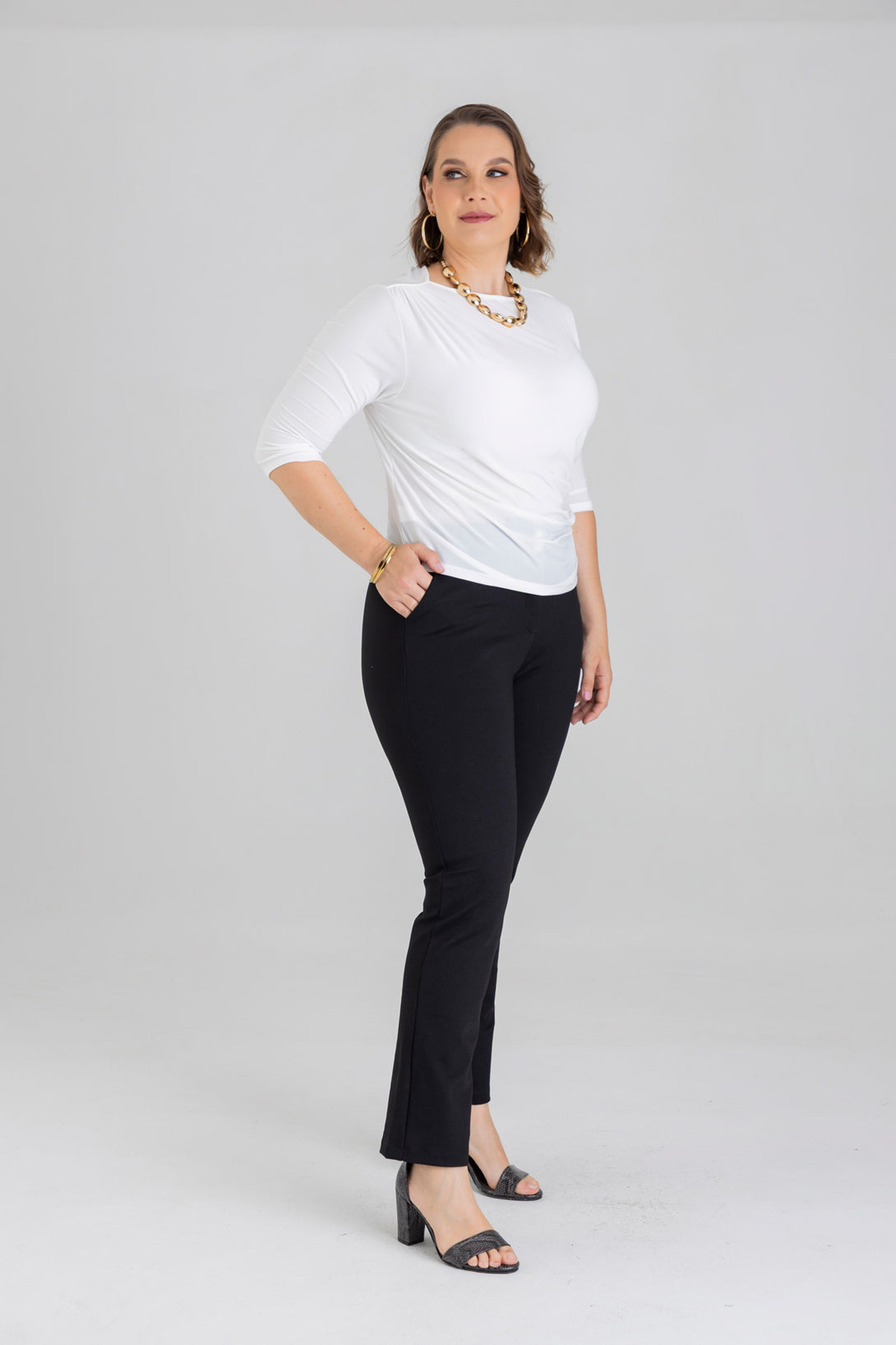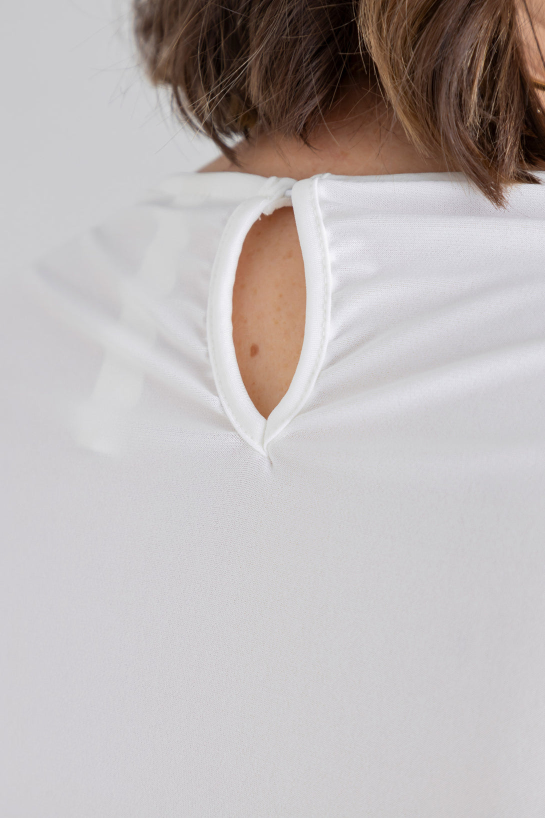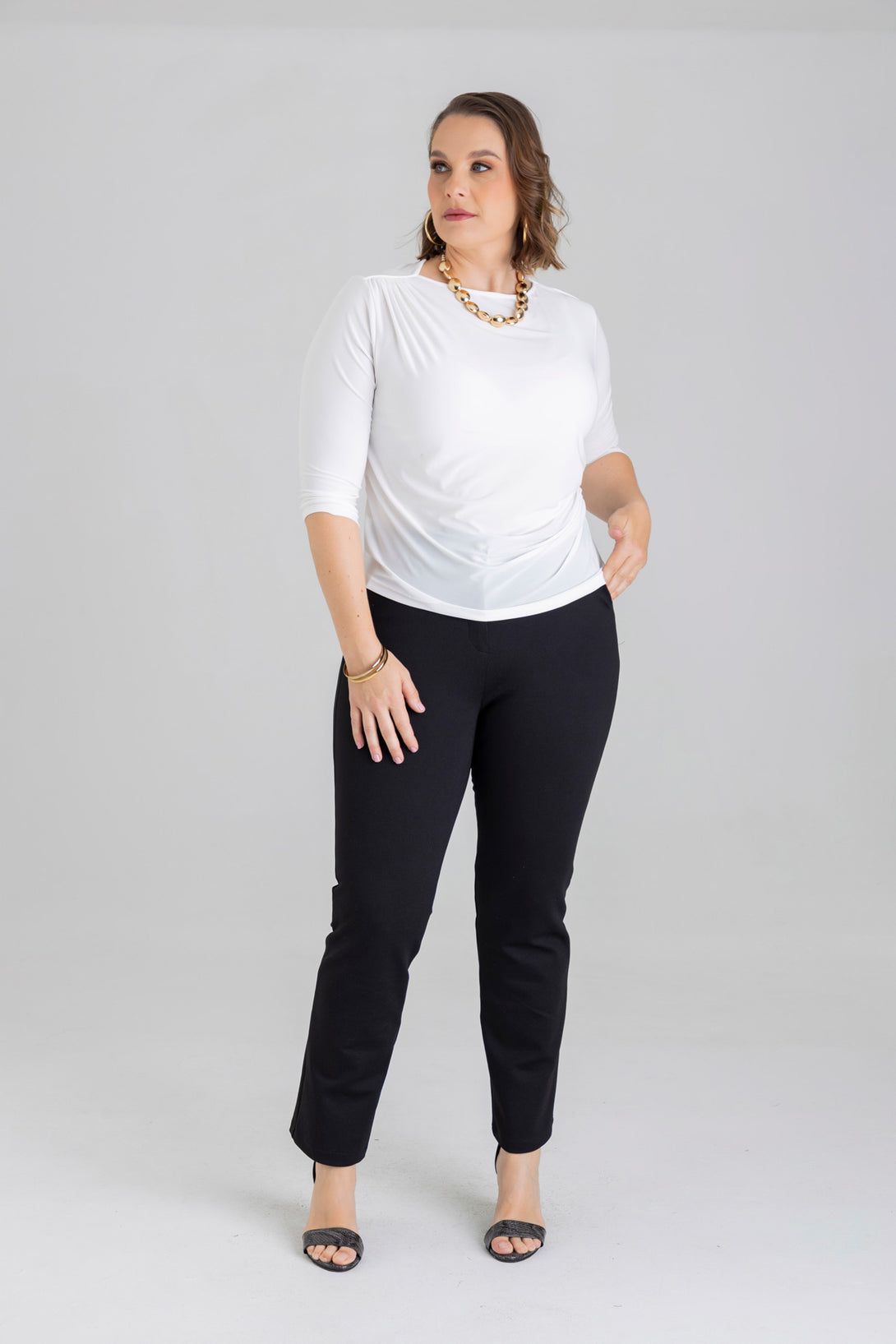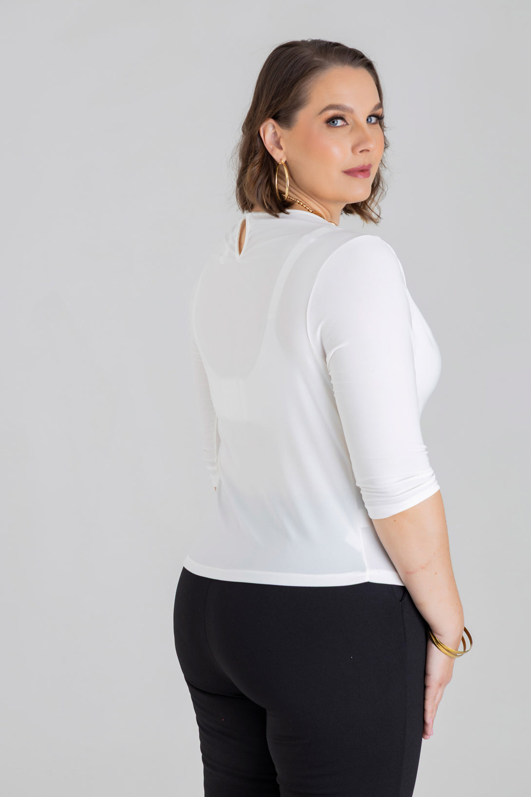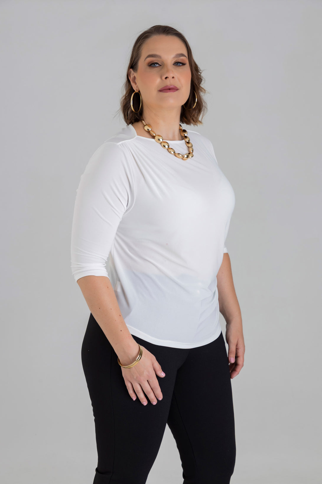 Blusa escote redondo, manga 3/4 y detalle drapeado en hombro y cintura. Elaborada en Acetato fondo entero.