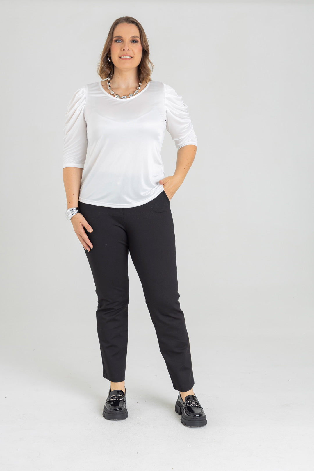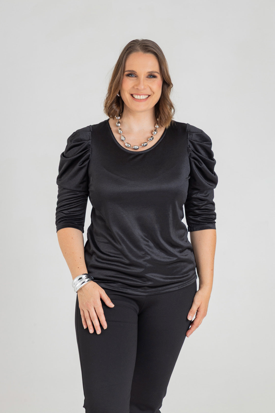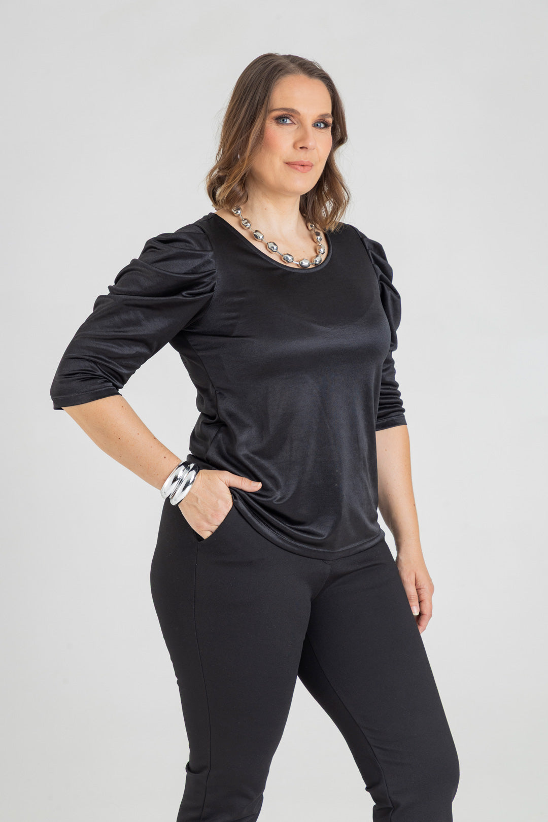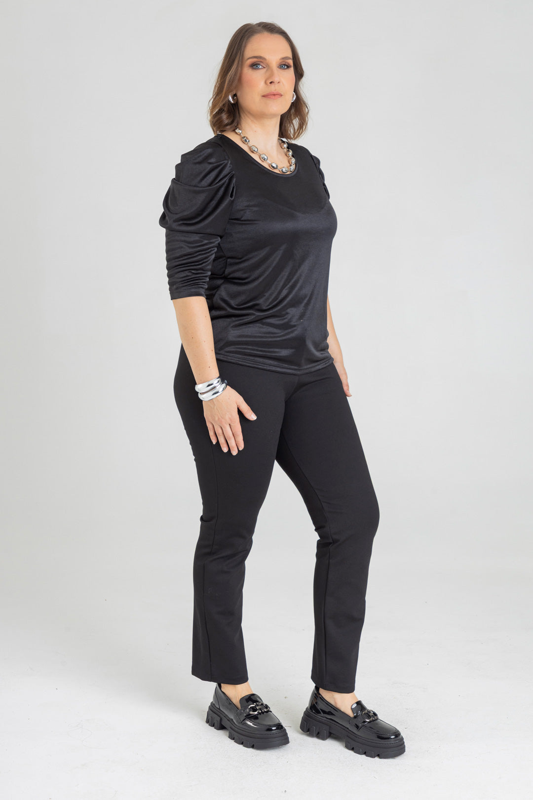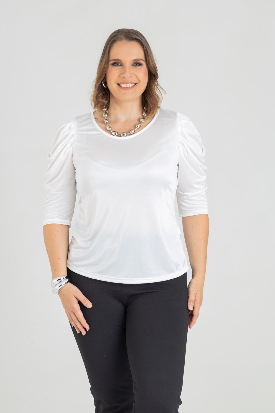 Blusa escote redondo, manga 3/4 con manga recogida en copa. Elaborada en Poliester con efecto.