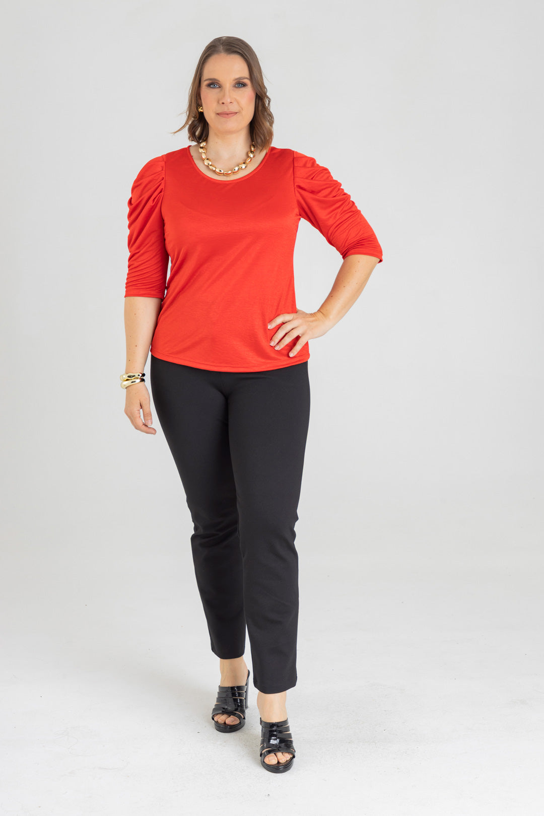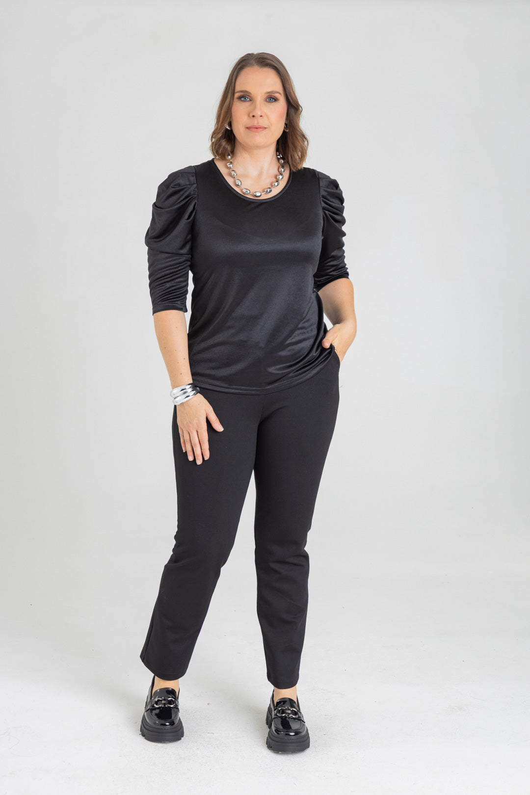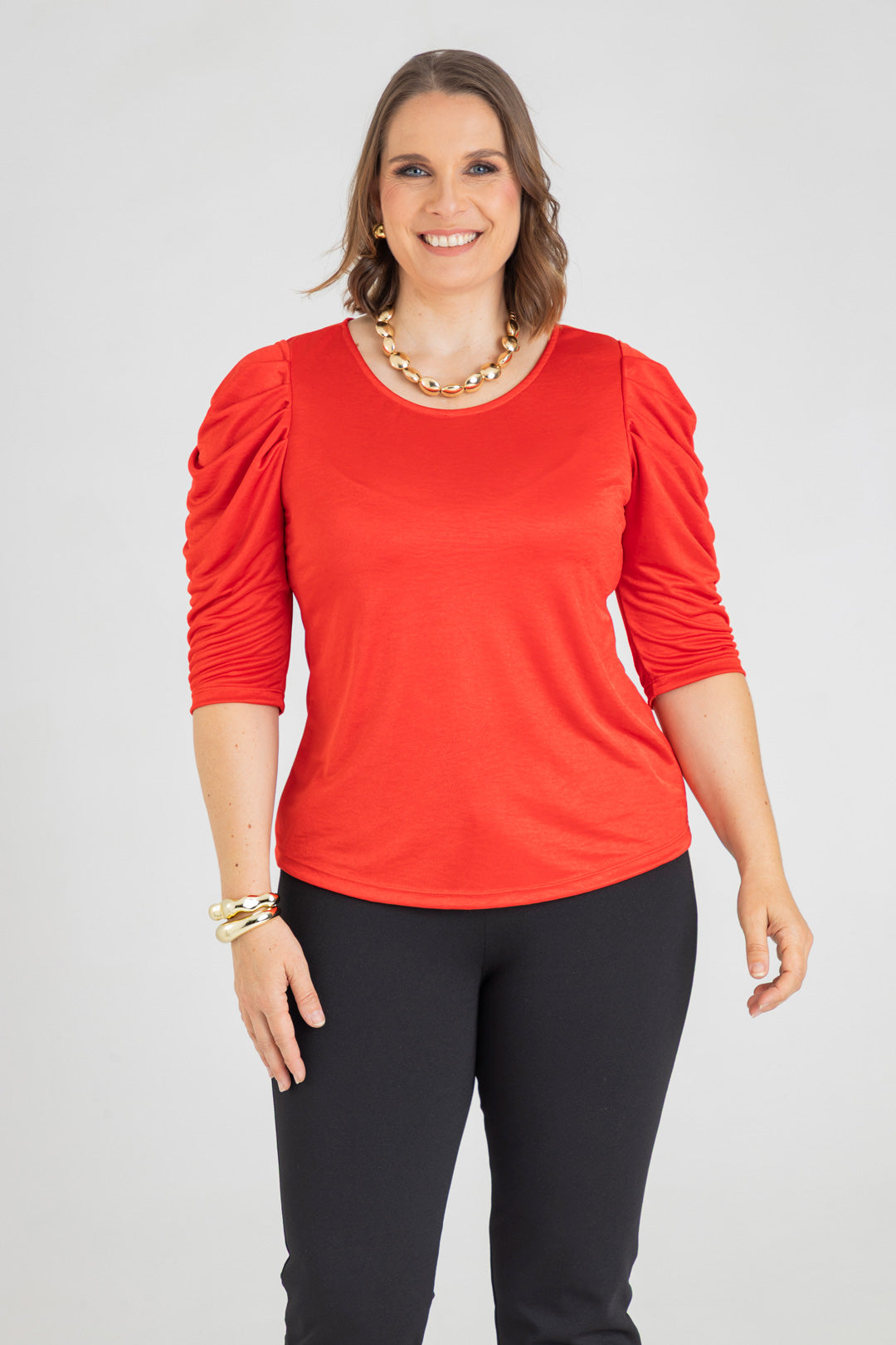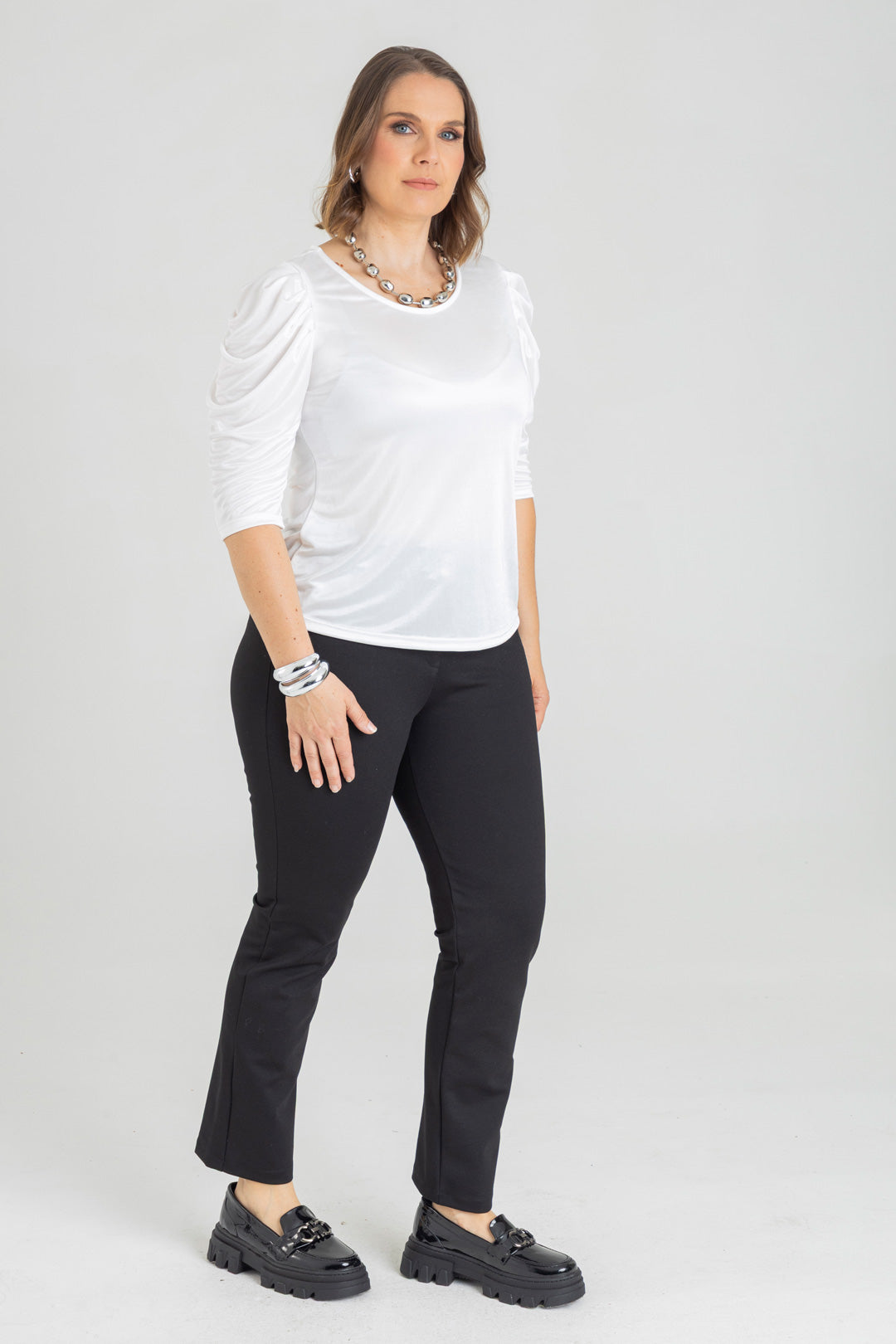 Blusa escote redondo, manga 3/4 con manga recogida en copa. Elaborada en Poliester con efecto.