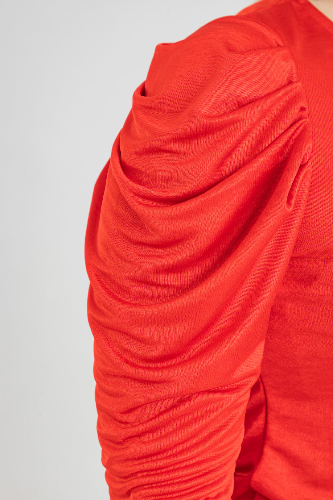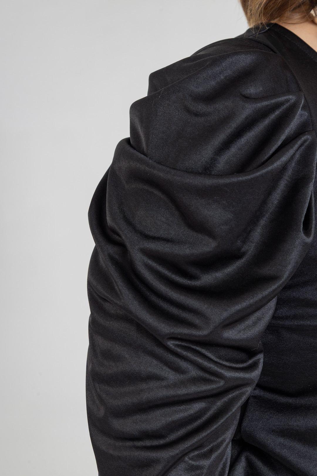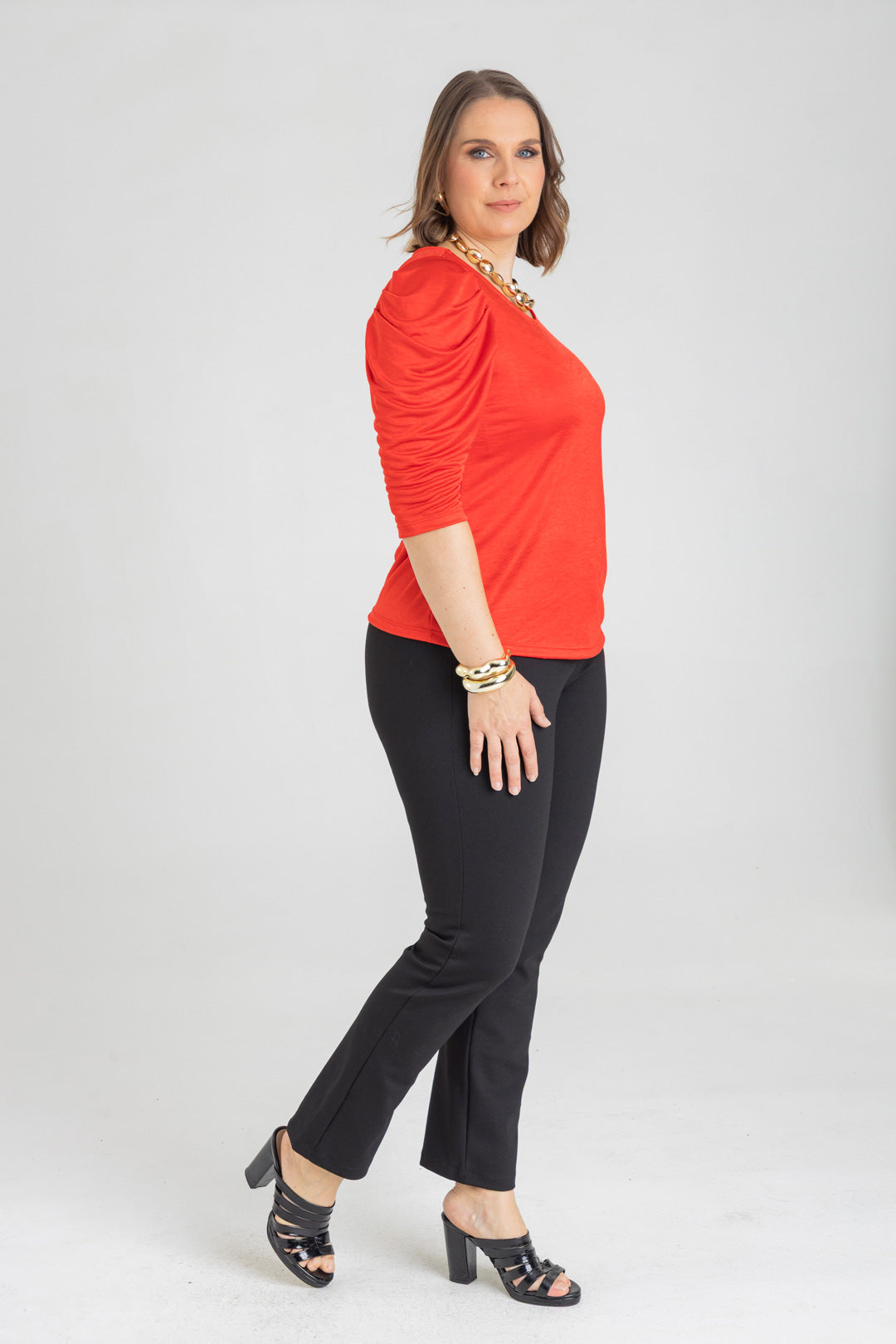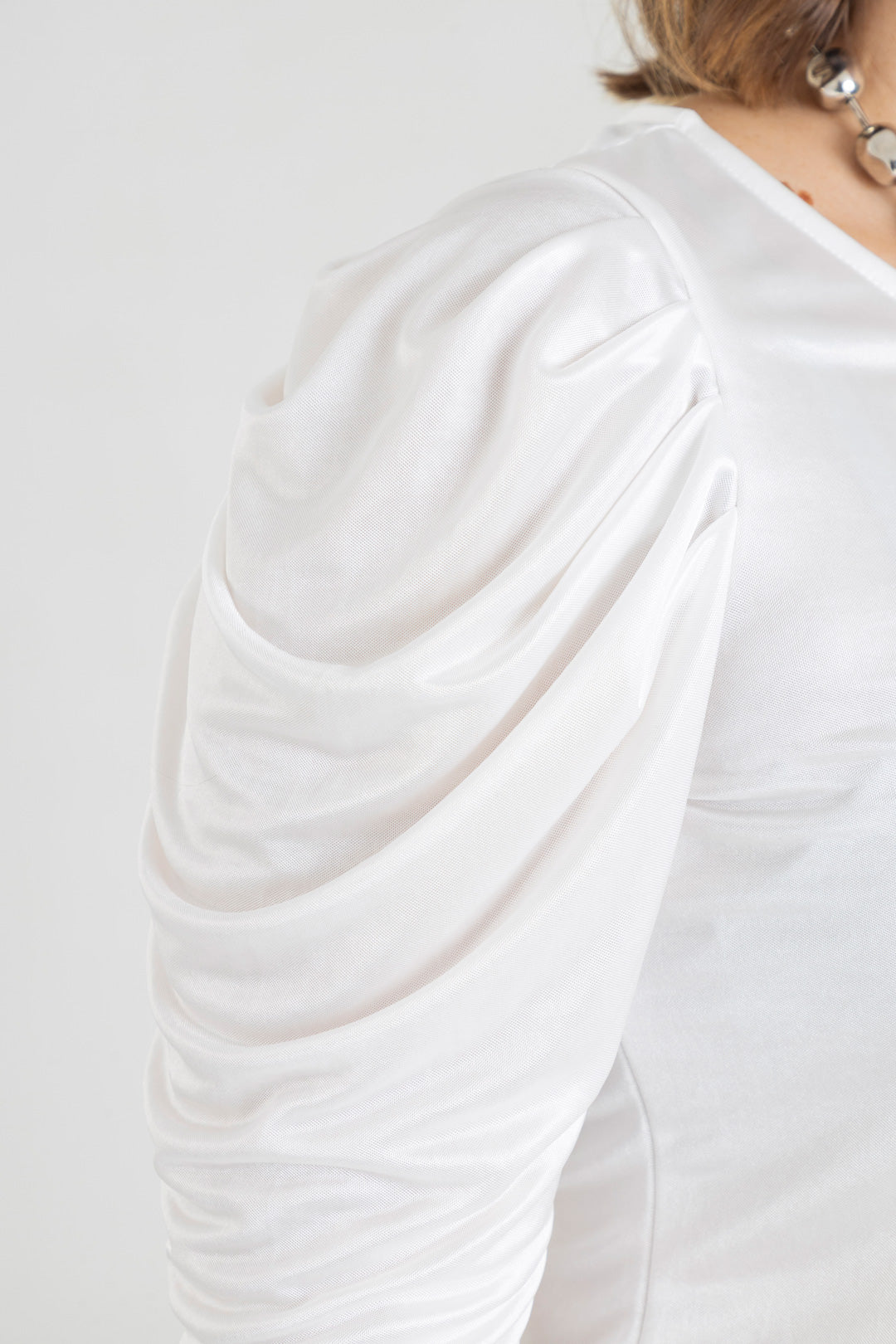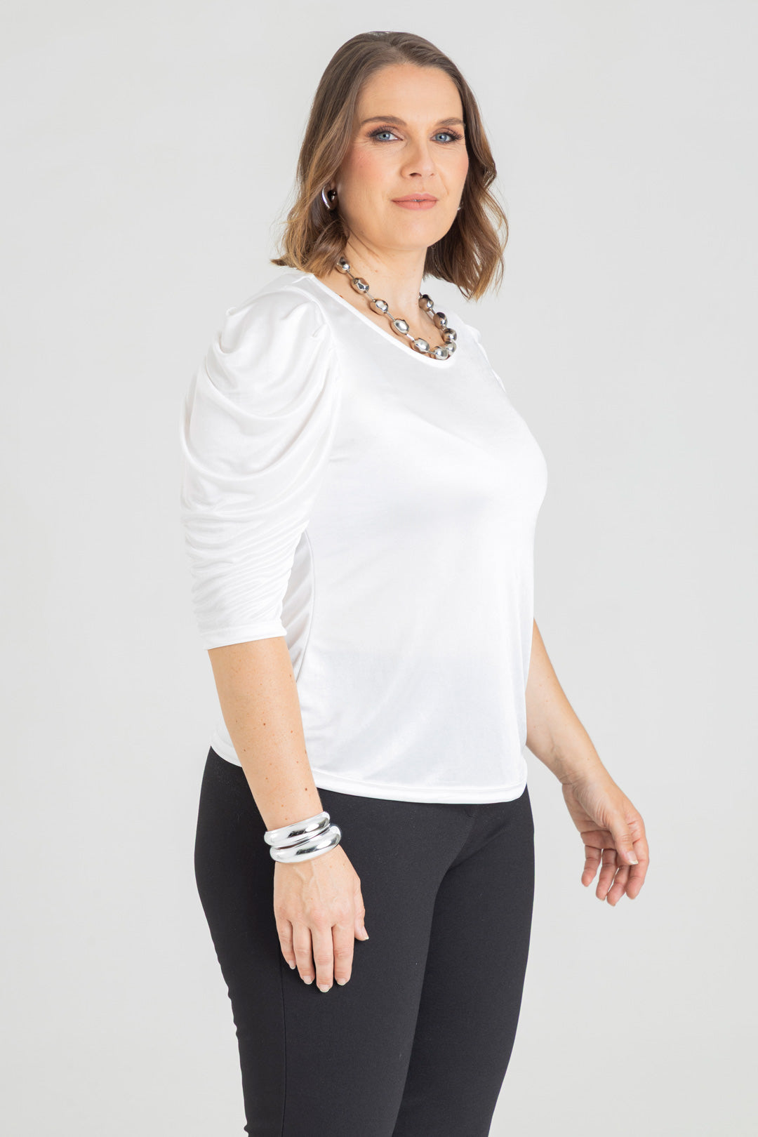 Blusa escote redondo, manga 3/4 con manga recogida en copa. Elaborada en Poliester con efecto.