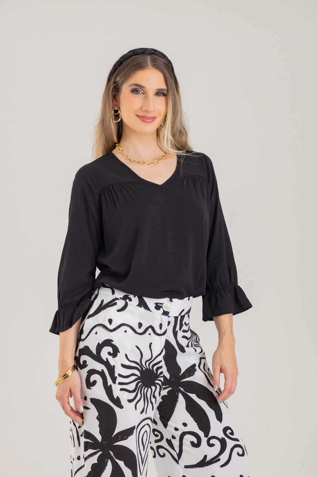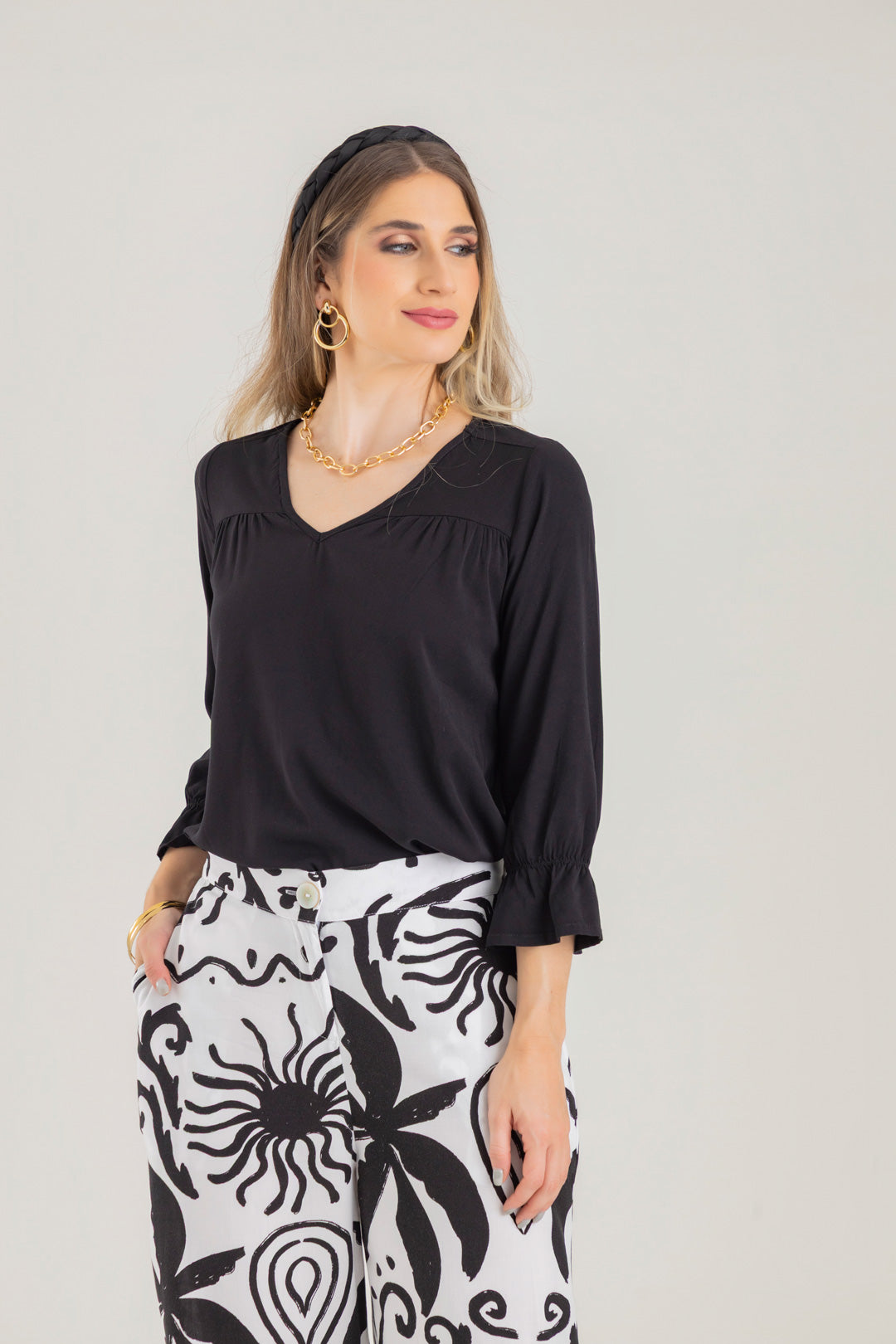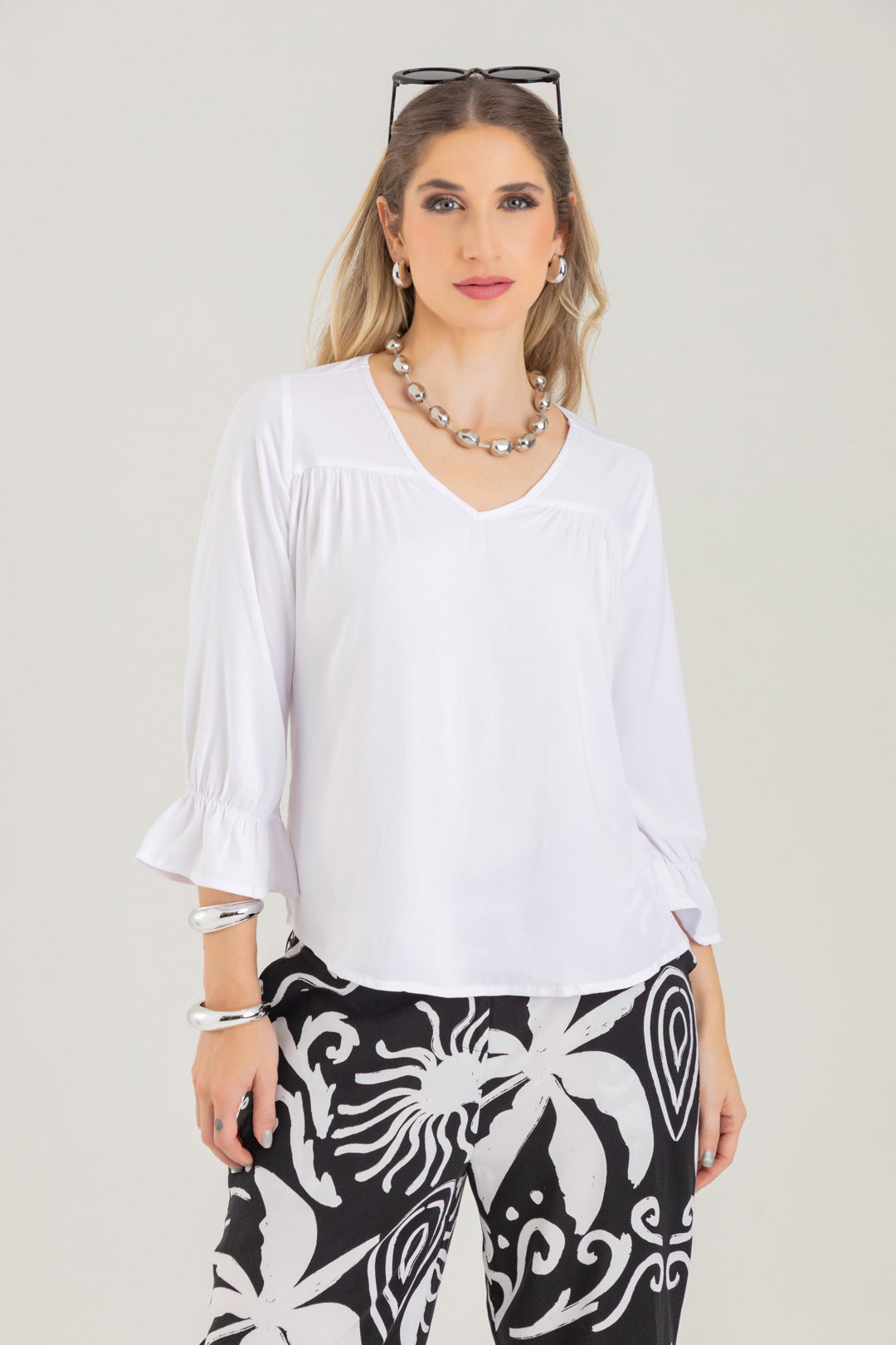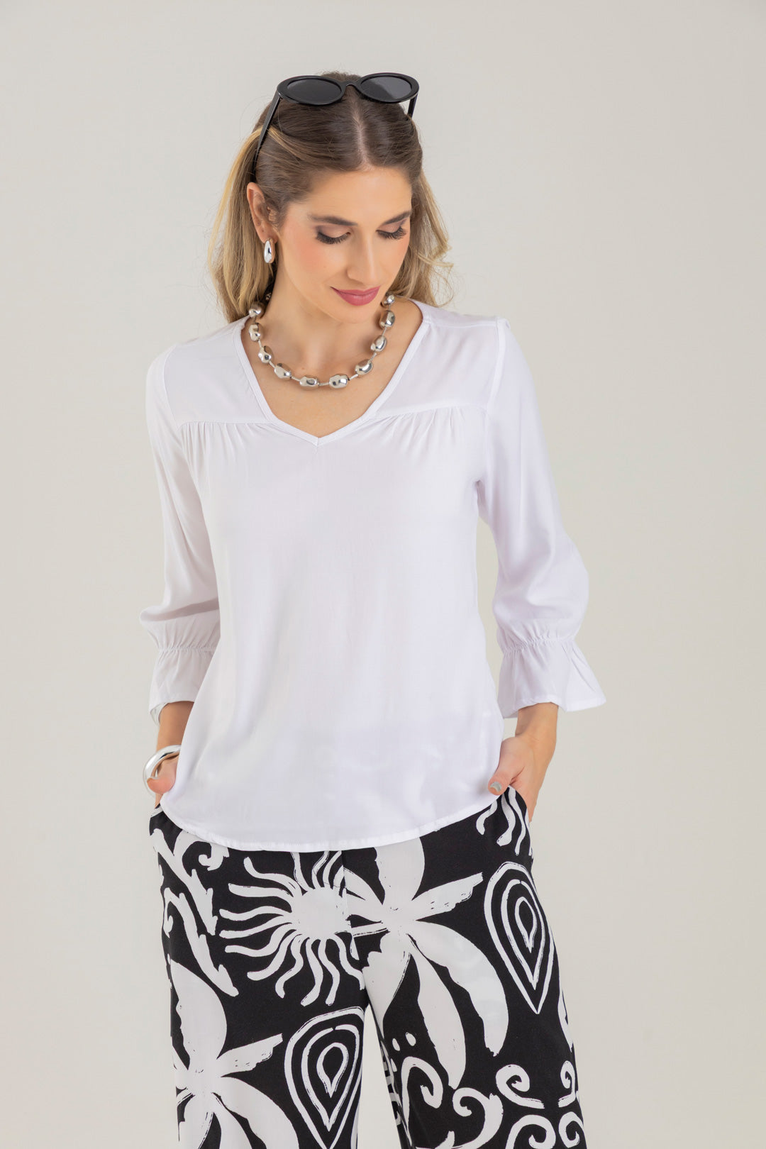 Blusa escote en V con detalle de recogido, manga 3/4 con bolero en puño. Elaborada en Rayón fondo entero.