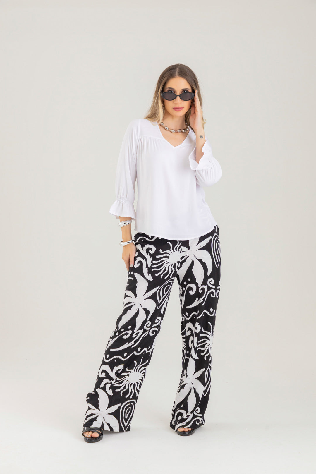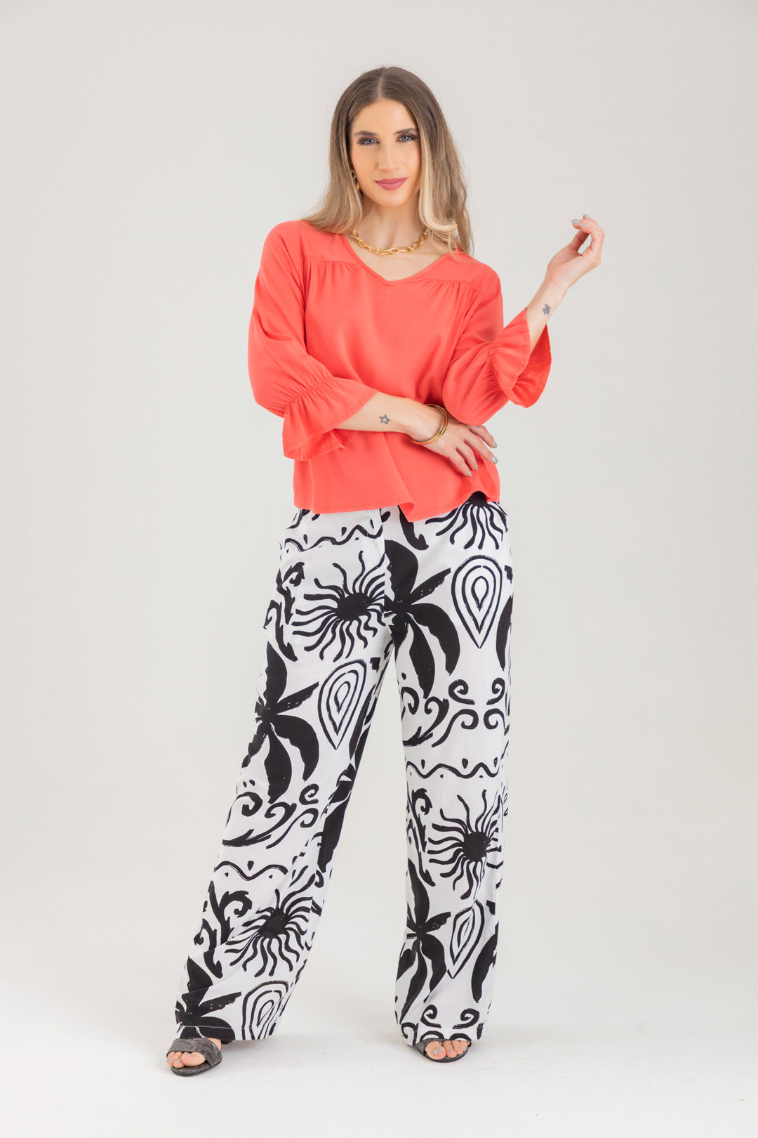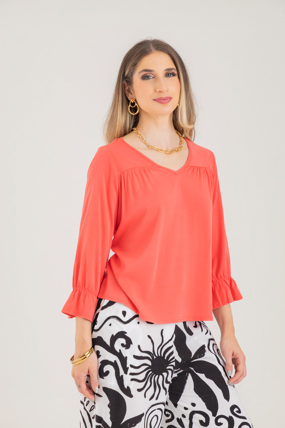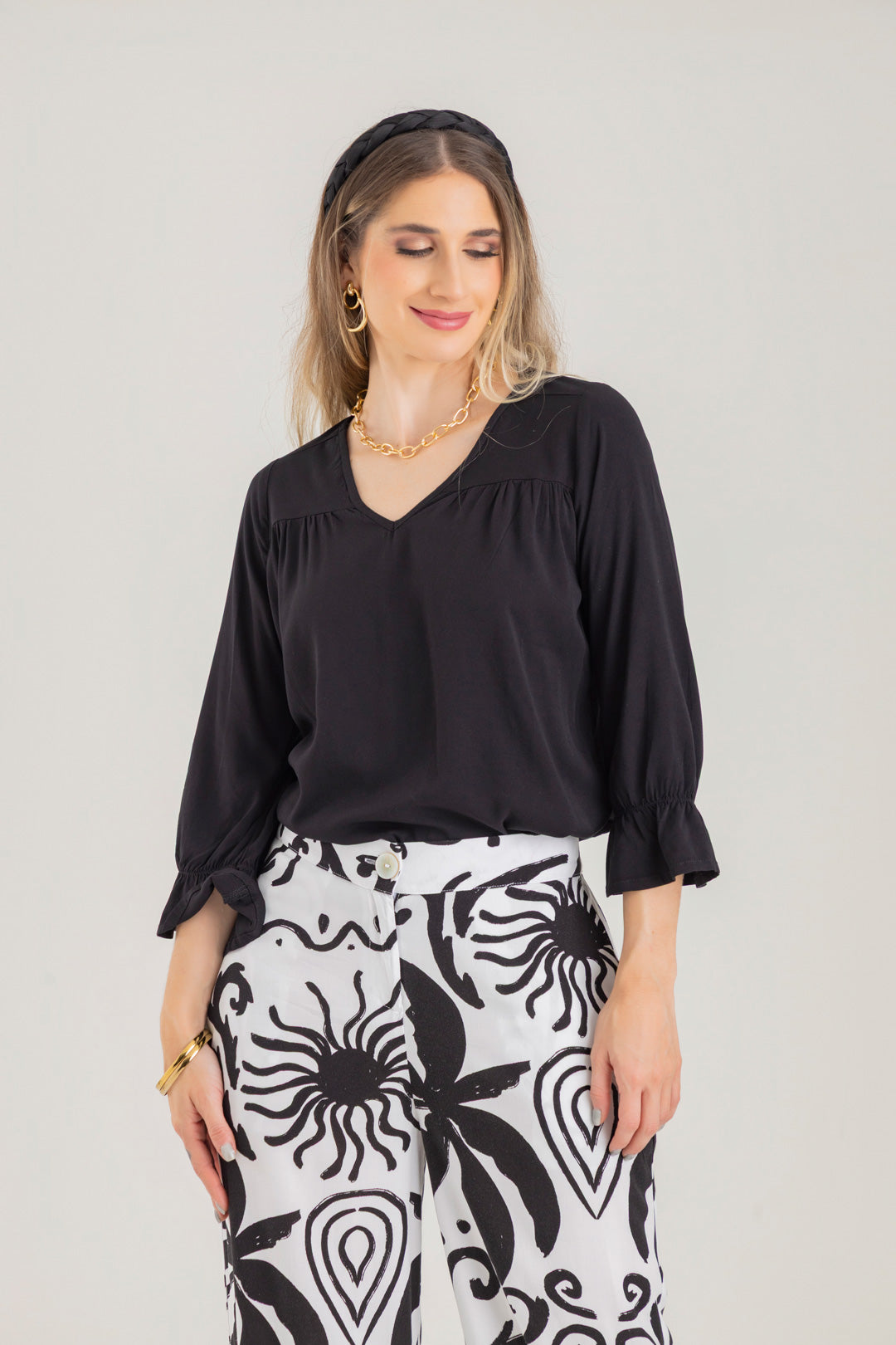 Blusa escote en V con detalle de recogido, manga 3/4 con bolero en puño. Elaborada en Rayón fondo entero.