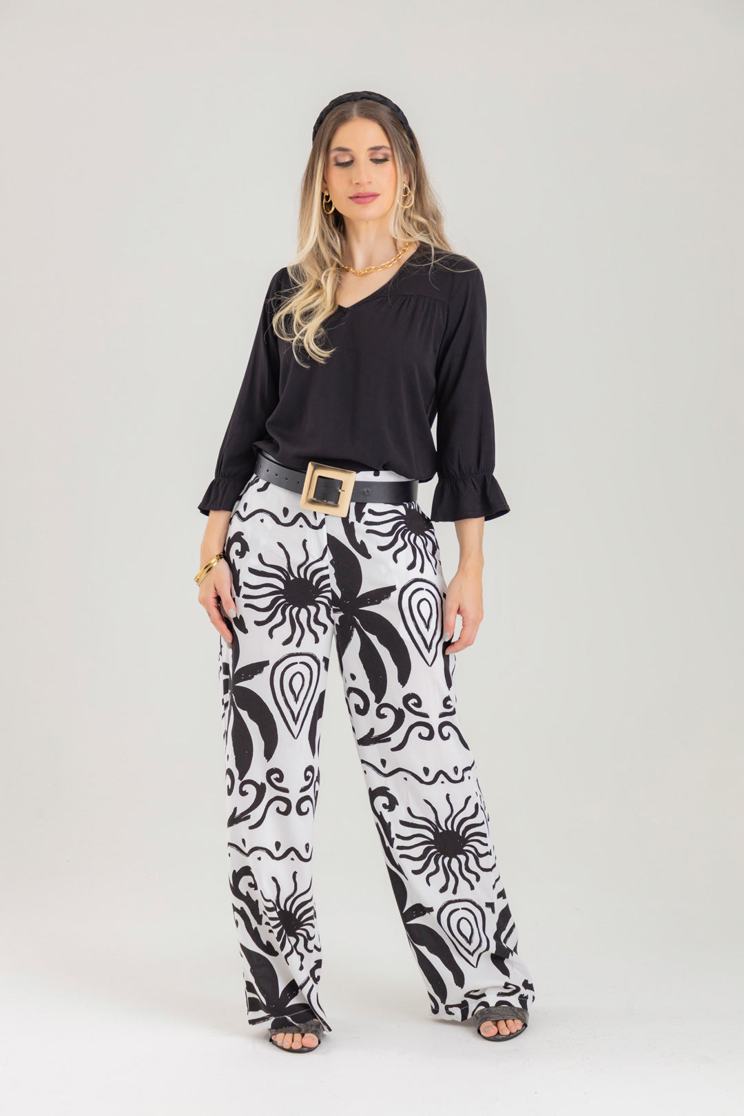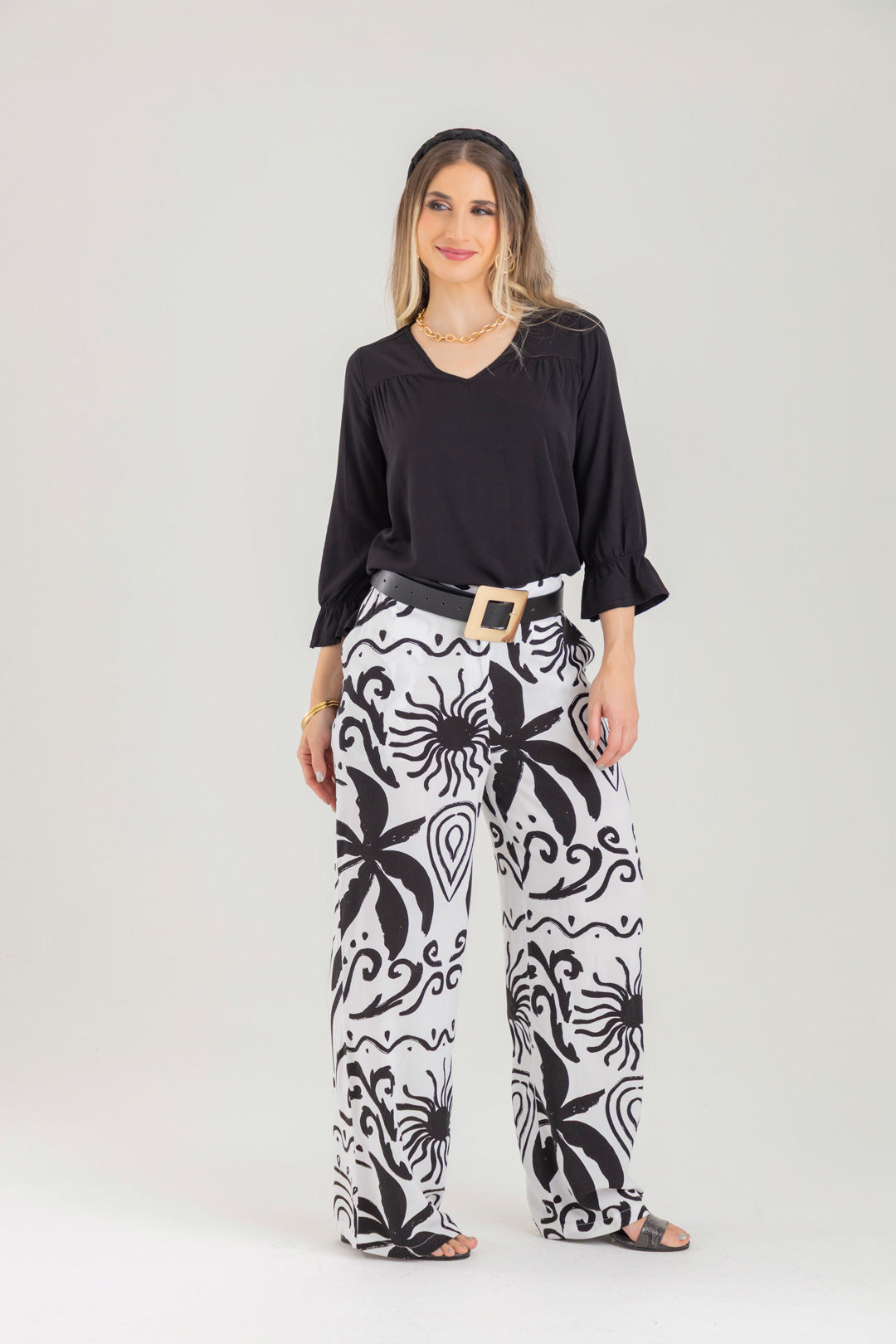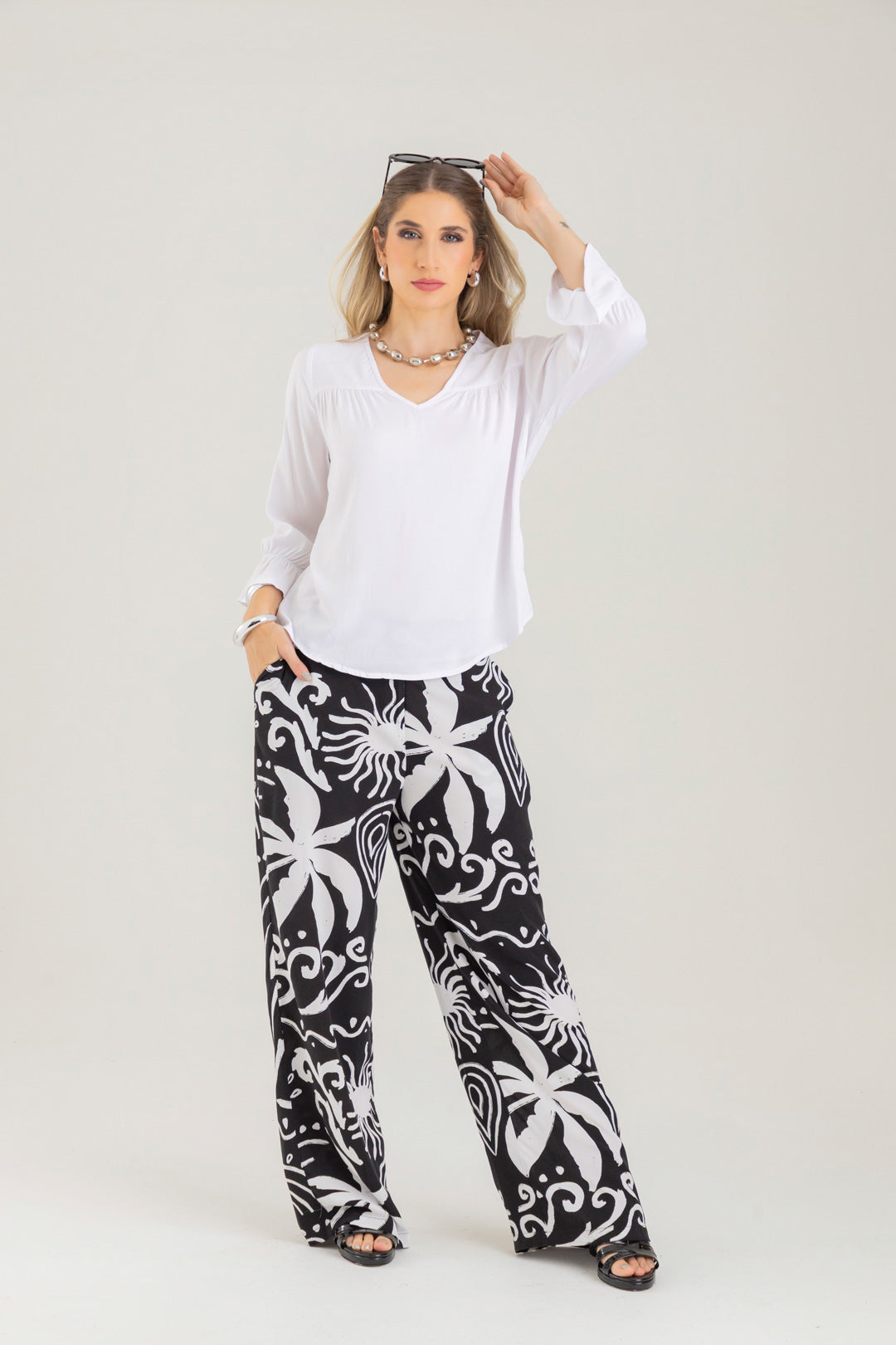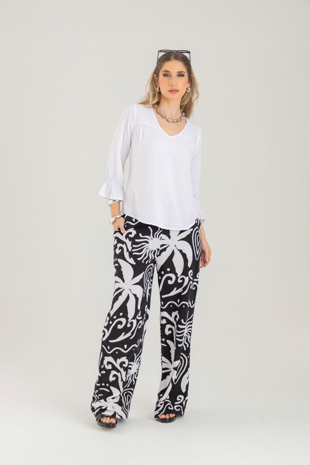 Blusa escote en V con detalle de recogido, manga 3/4 con bolero en puño. Elaborada en Rayón fondo entero.