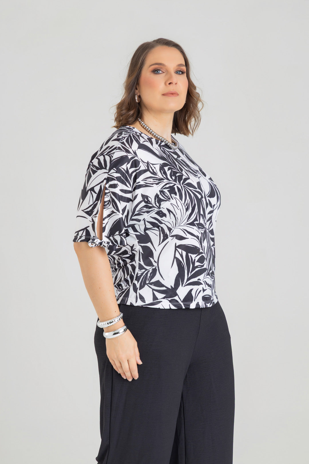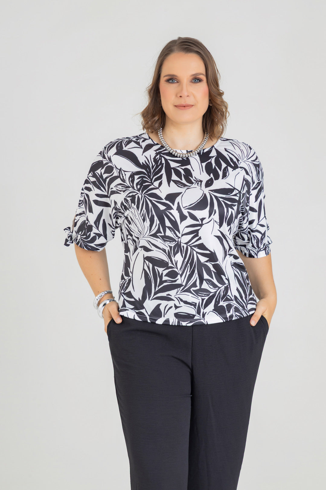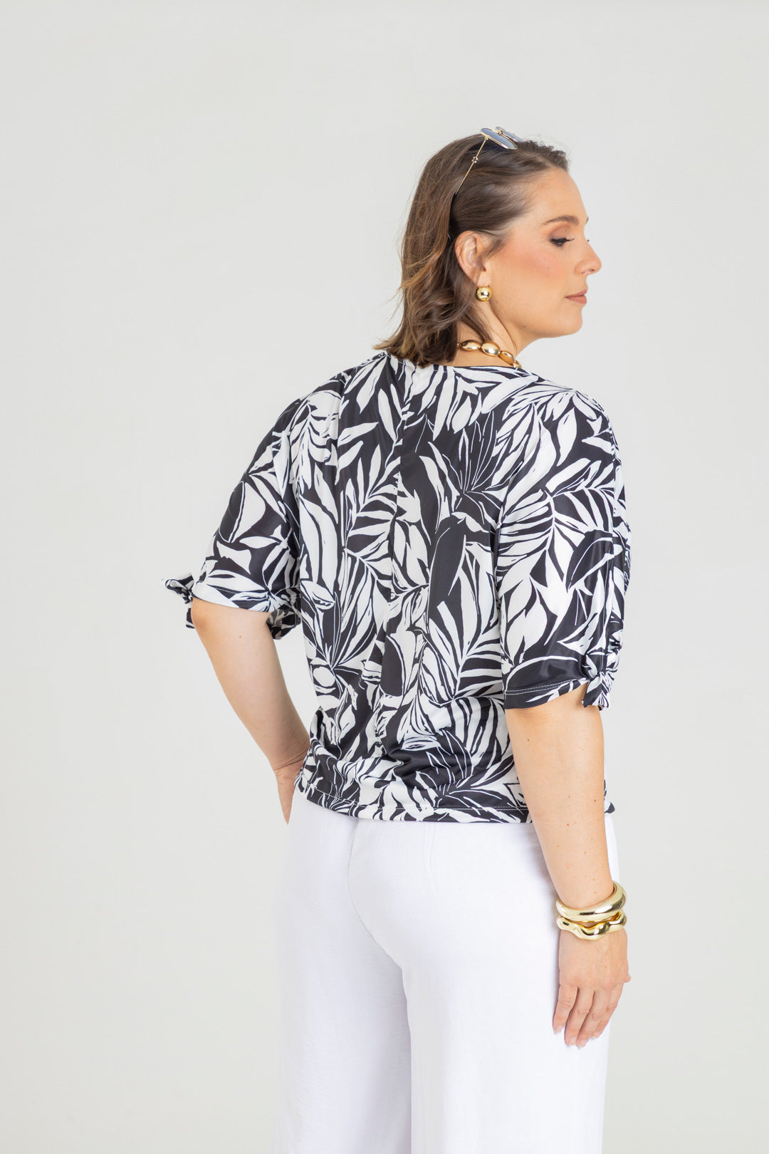 Blusa manga incorporada con tira para moño y escote redondo. Elaborada en Acetato estampado.