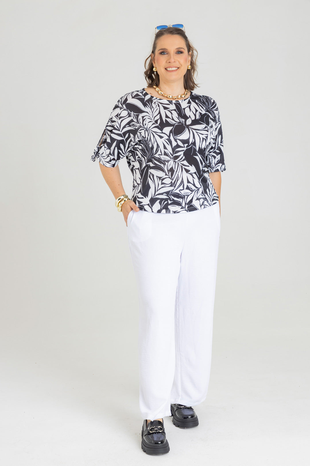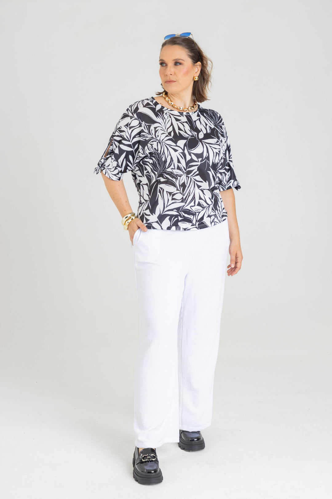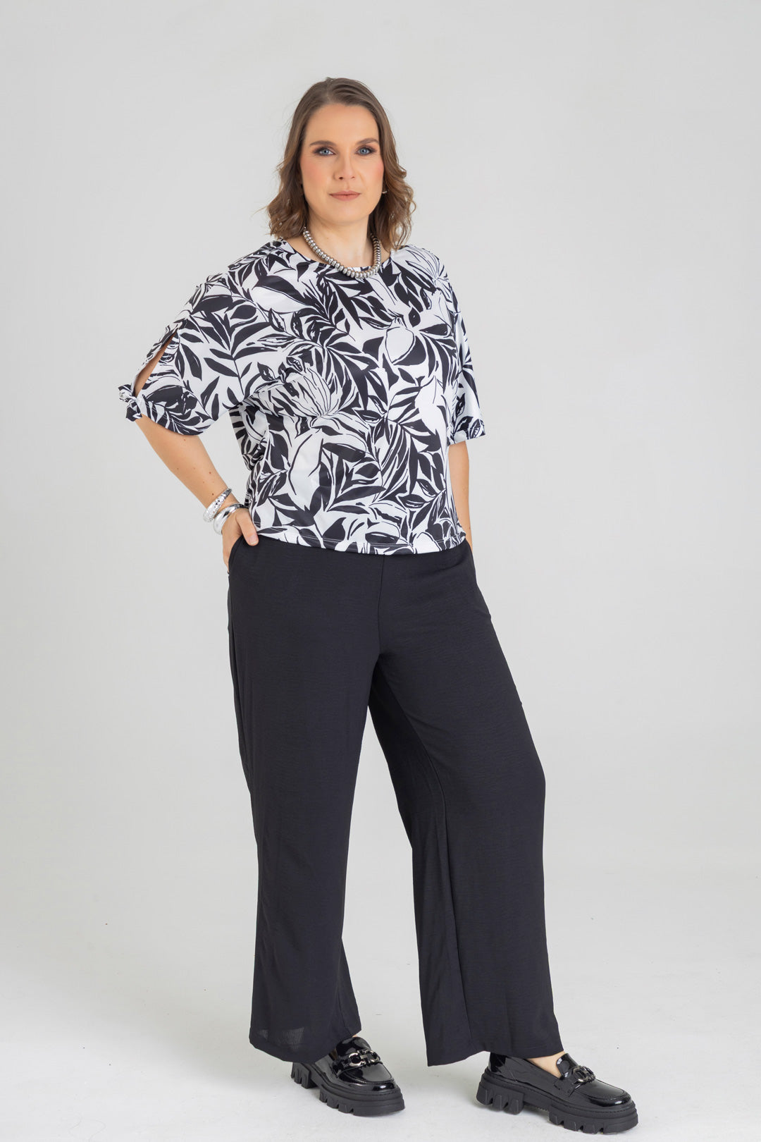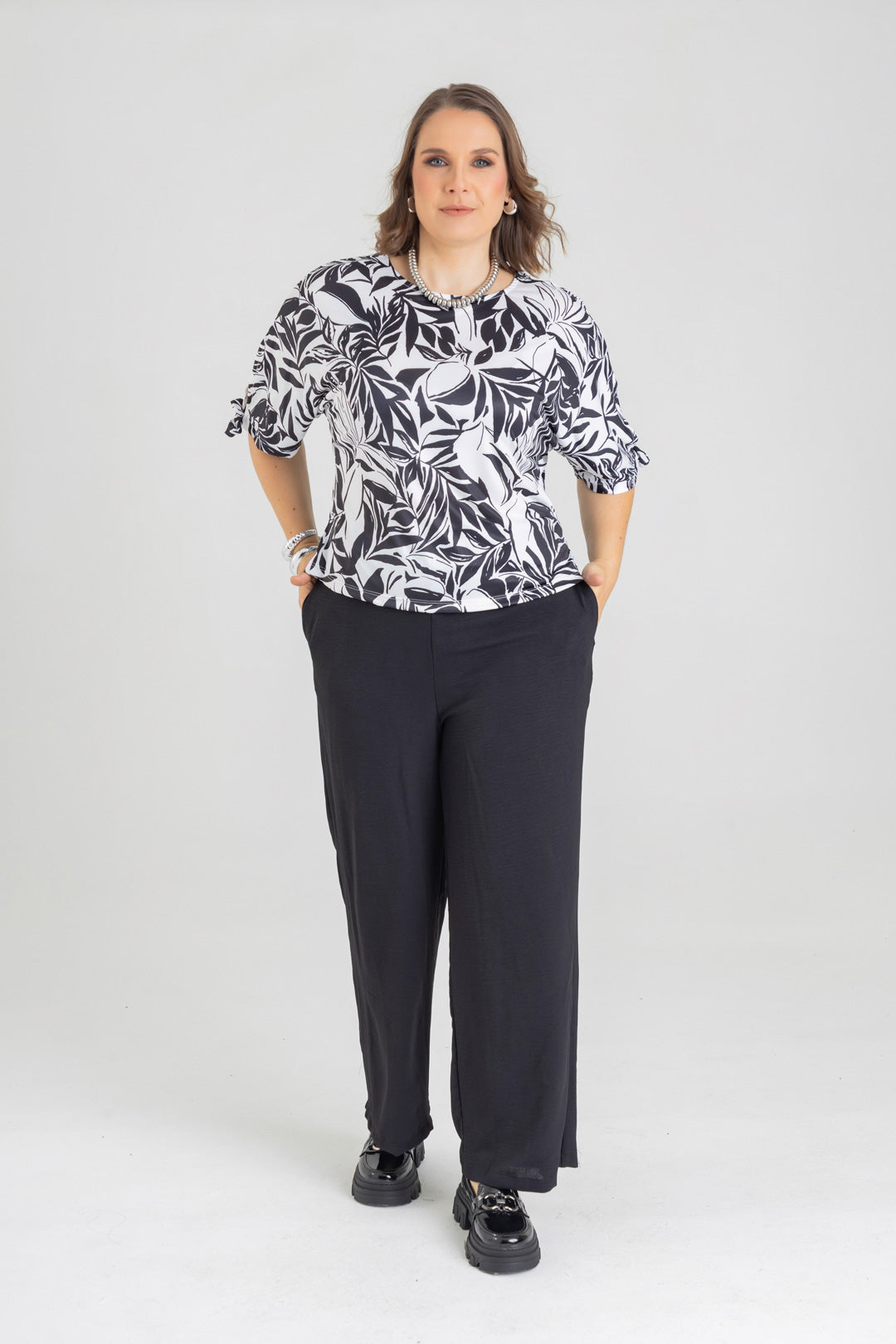 Blusa manga incorporada con tira para moño y escote redondo. Elaborada en Acetato estampado.