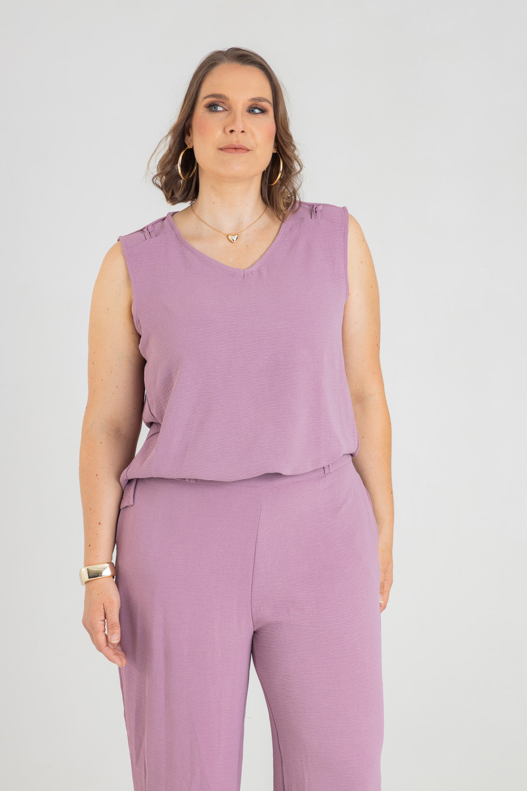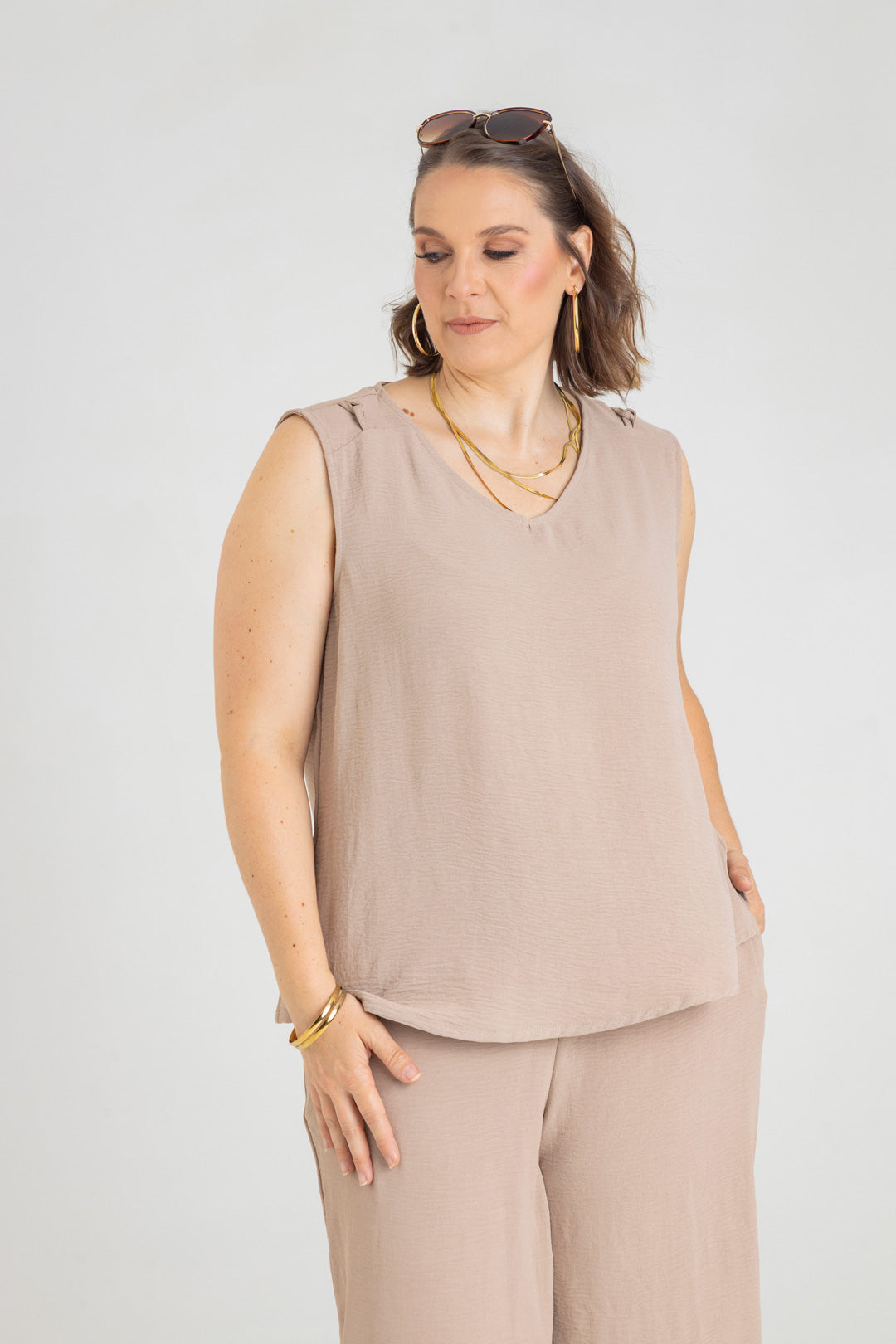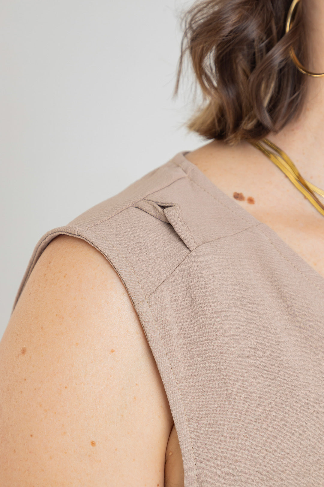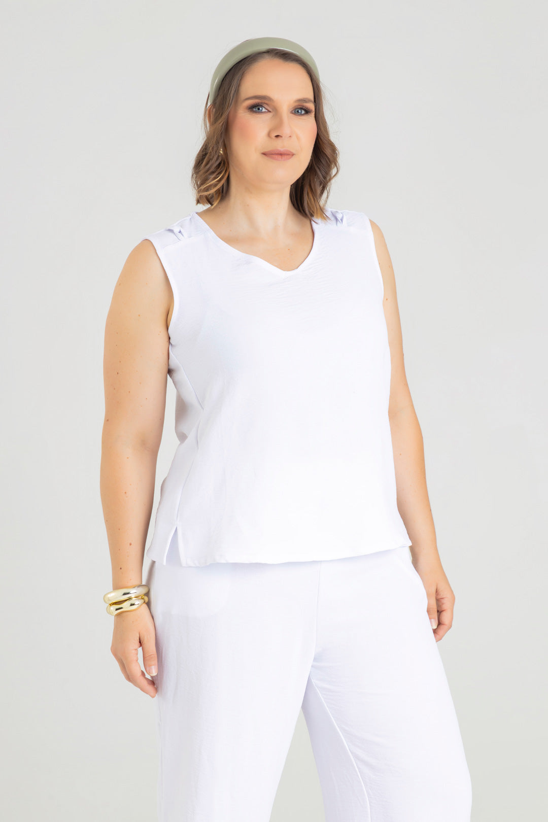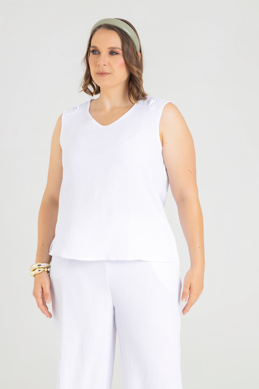 Blusa sisa, escote en V y detalle en hombros de pasadores. Elaborada en Poliester fondo entero.