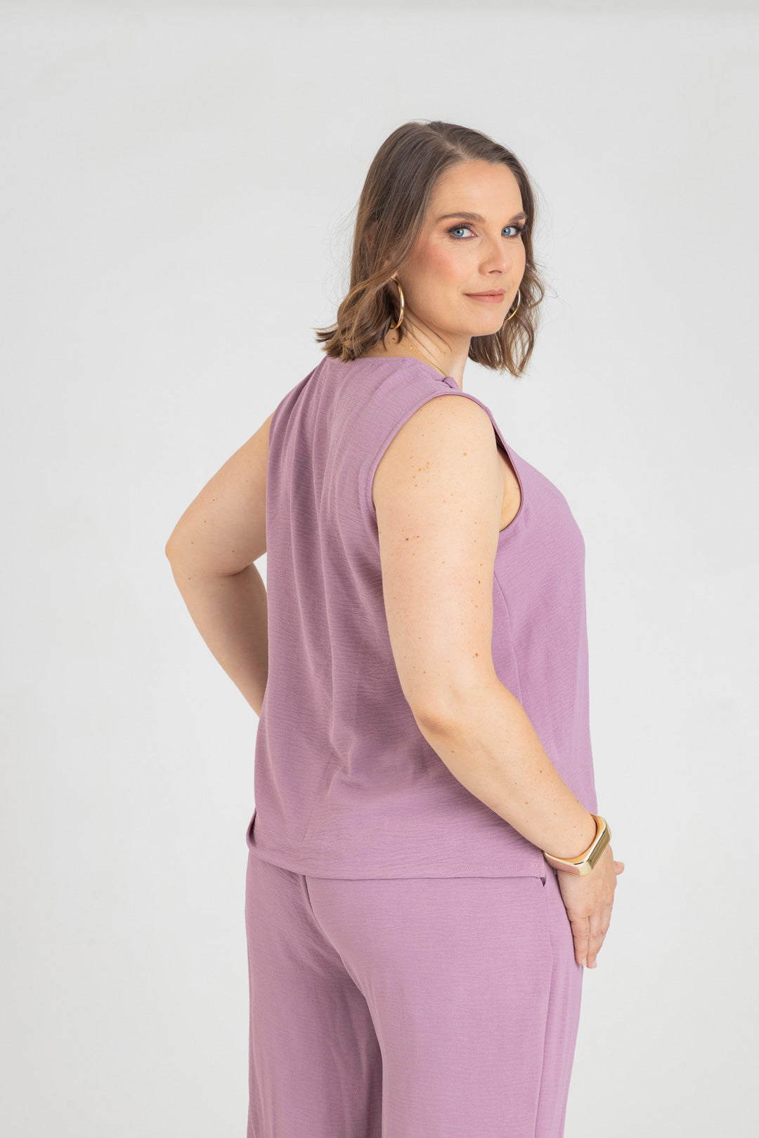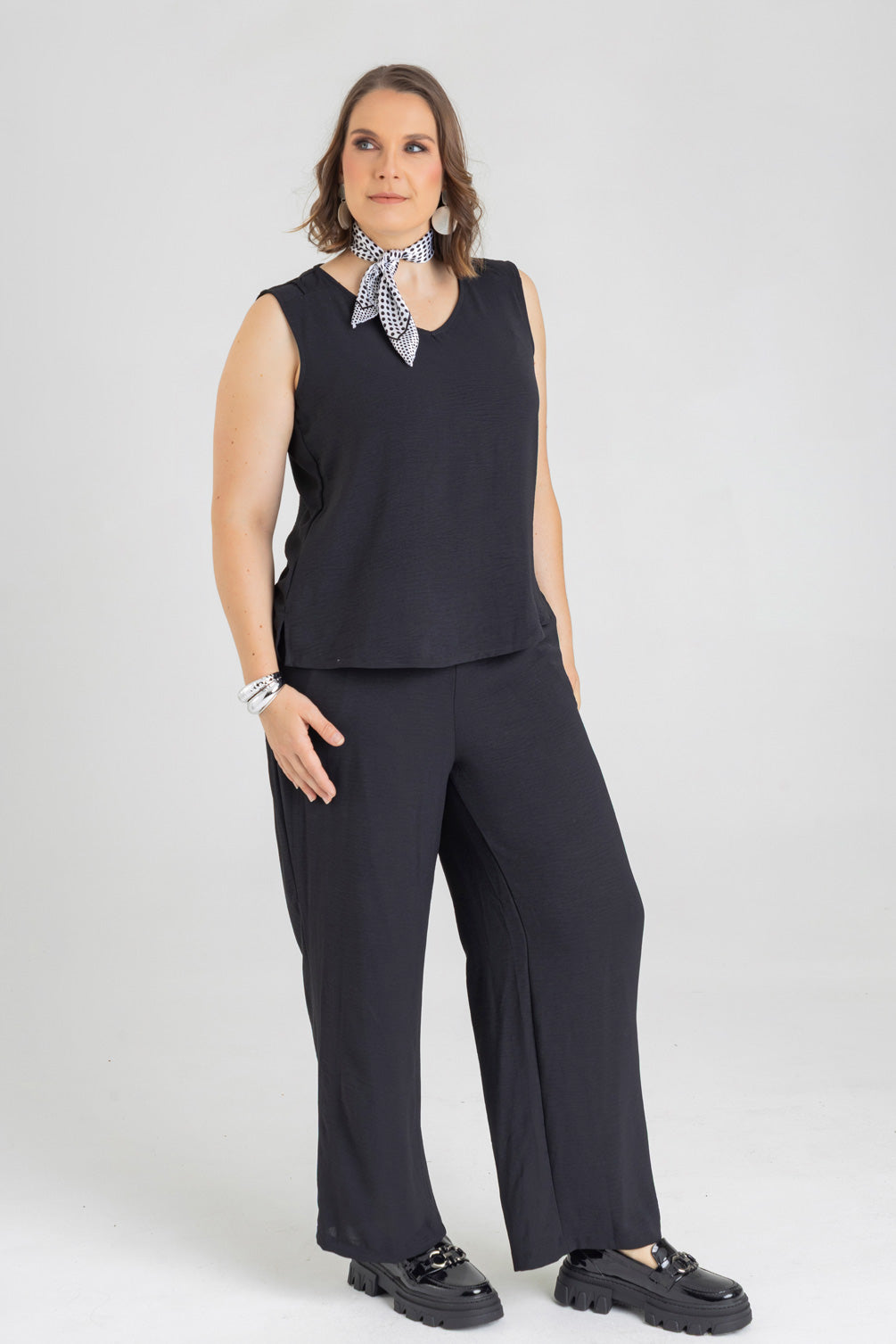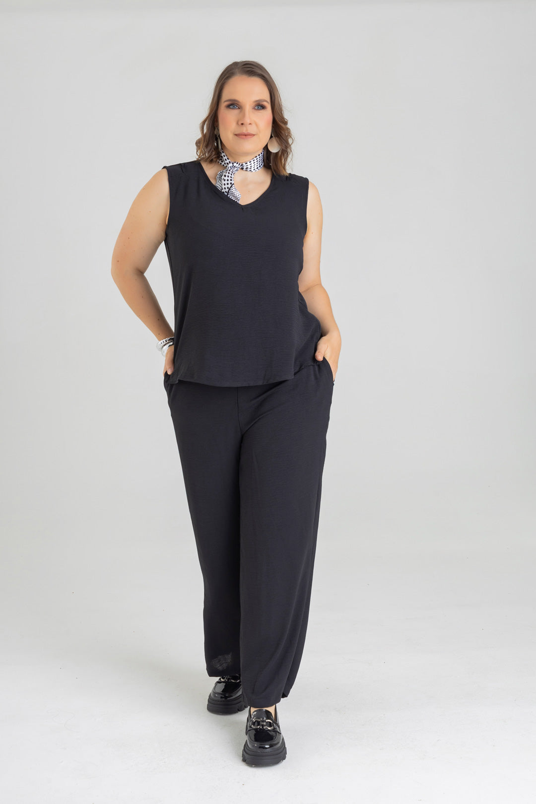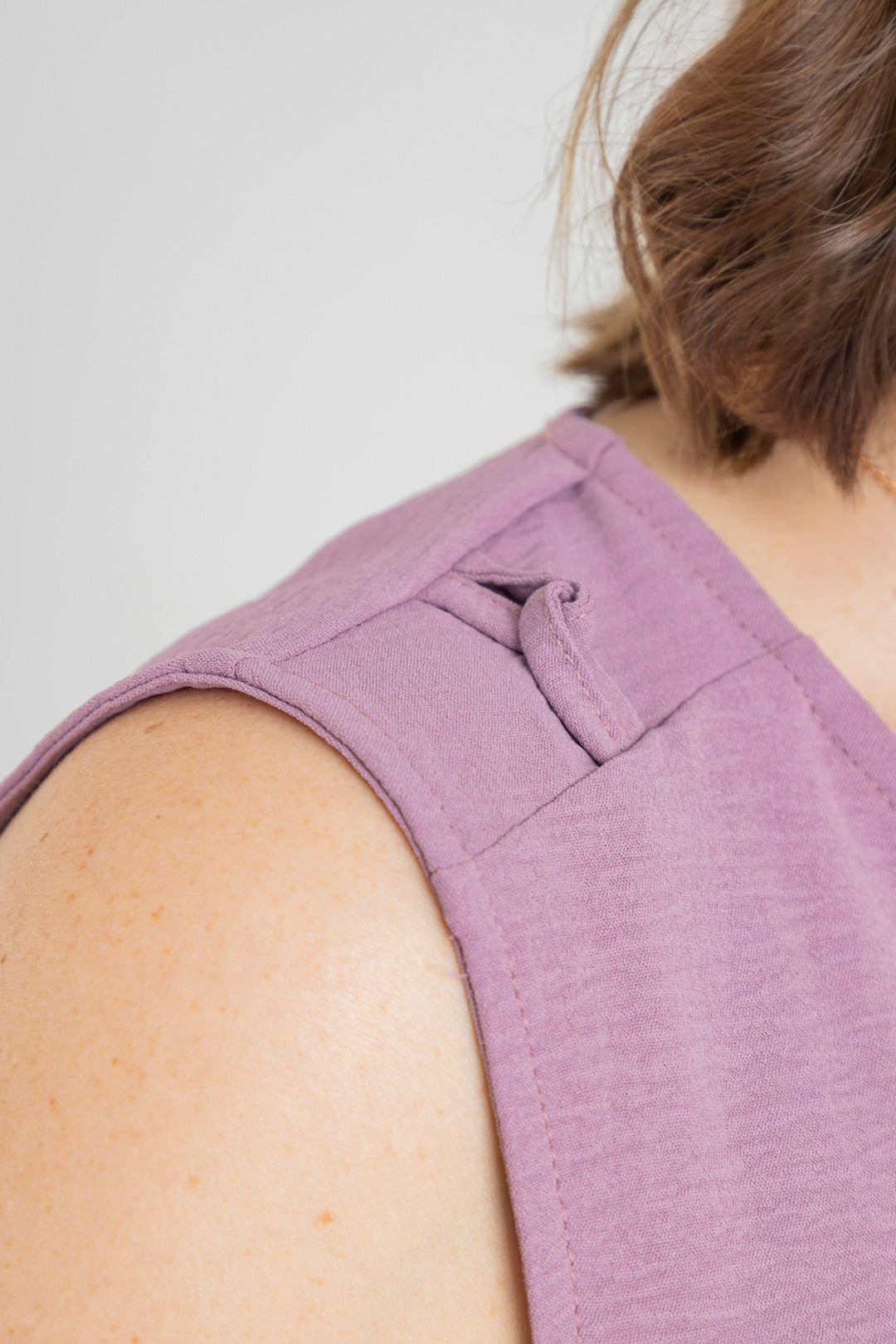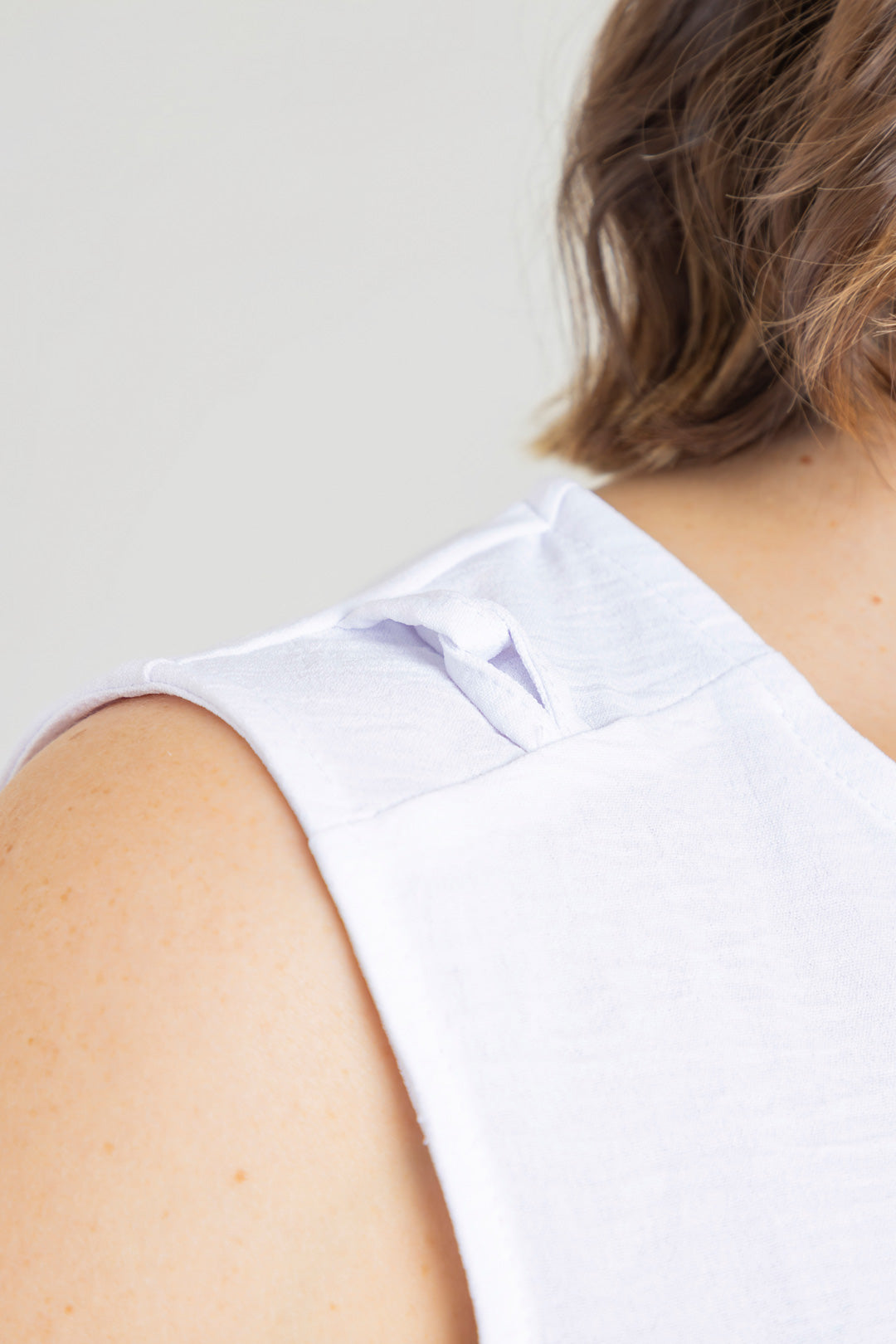 Blusa sisa, escote en V y detalle en hombros de pasadores. Elaborada en Poliester fondo entero.