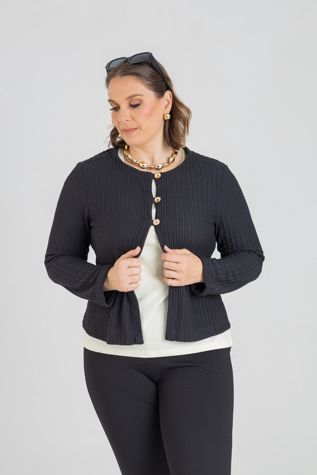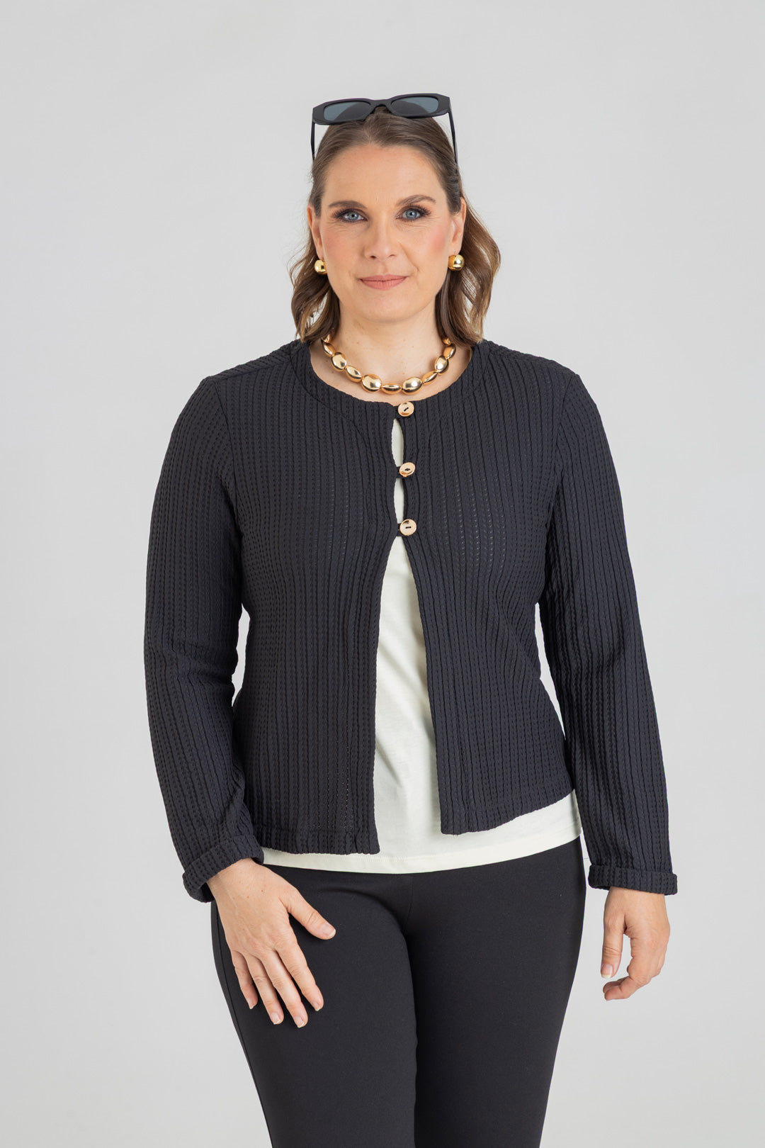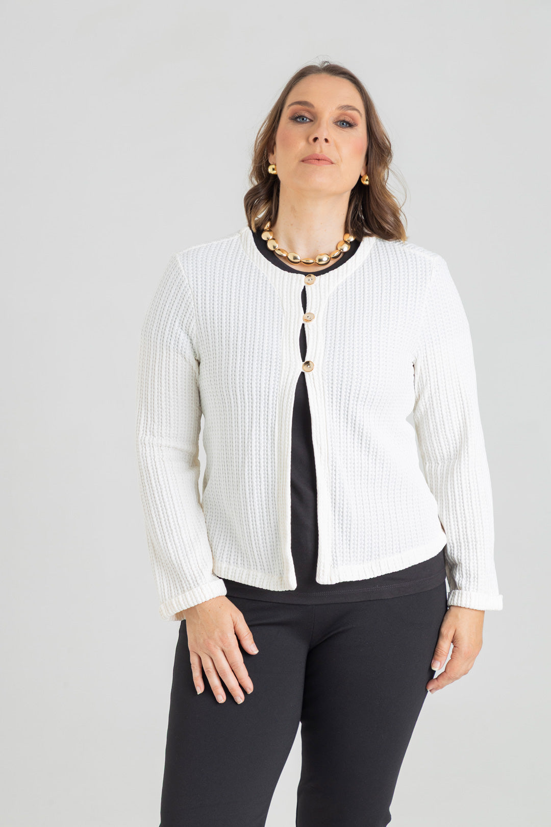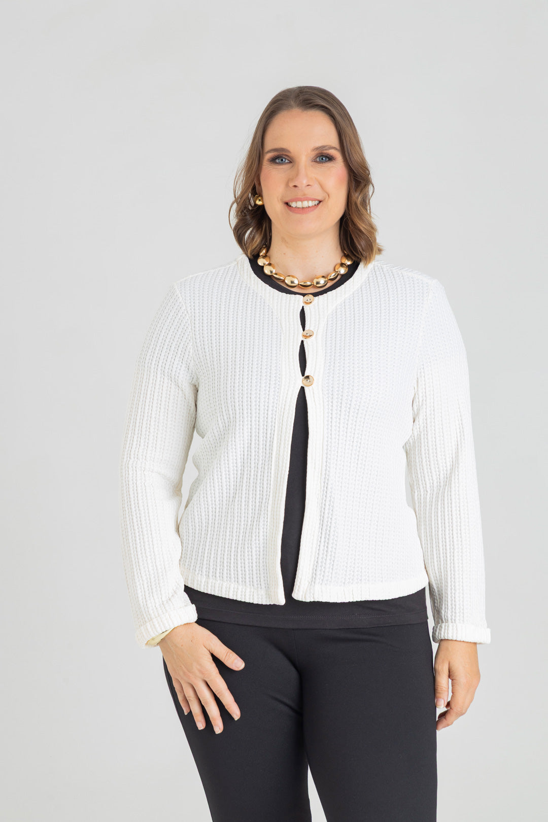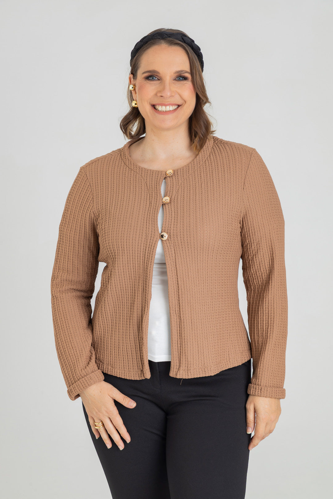 Chaqueta con dobladillo en puño y detalle de tres botones. Elaborada en Punto con textura.
