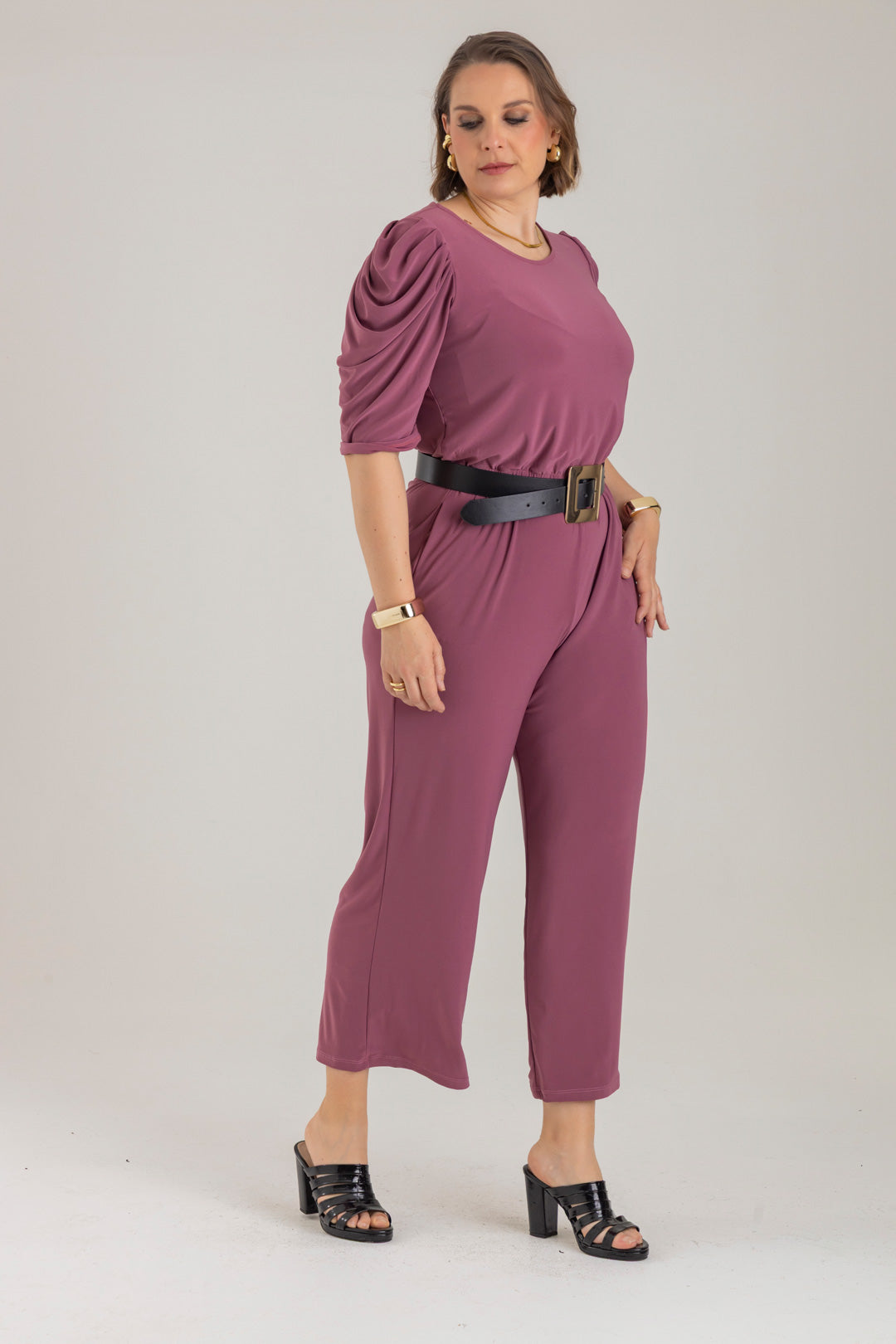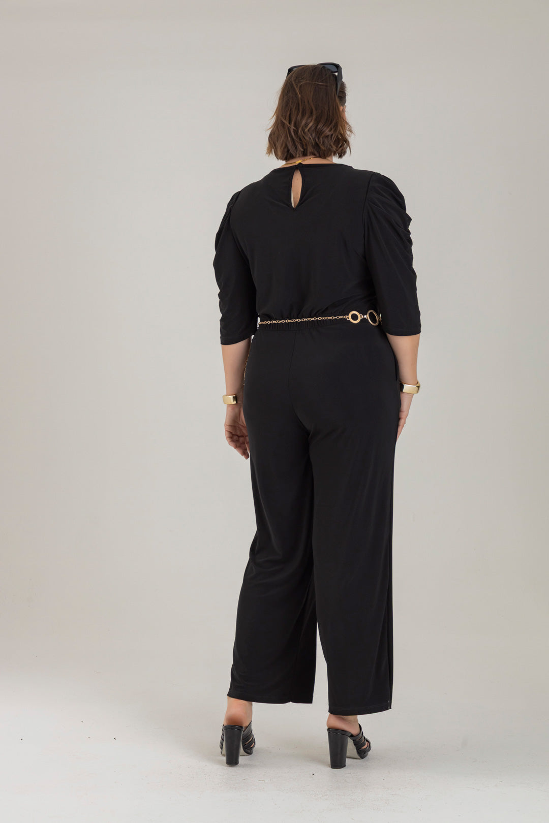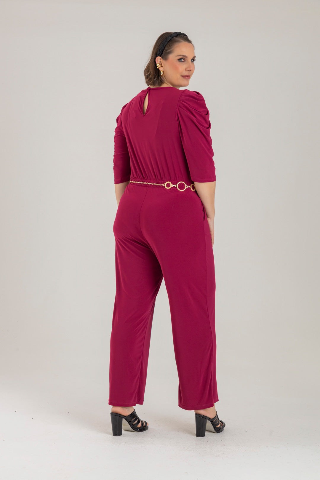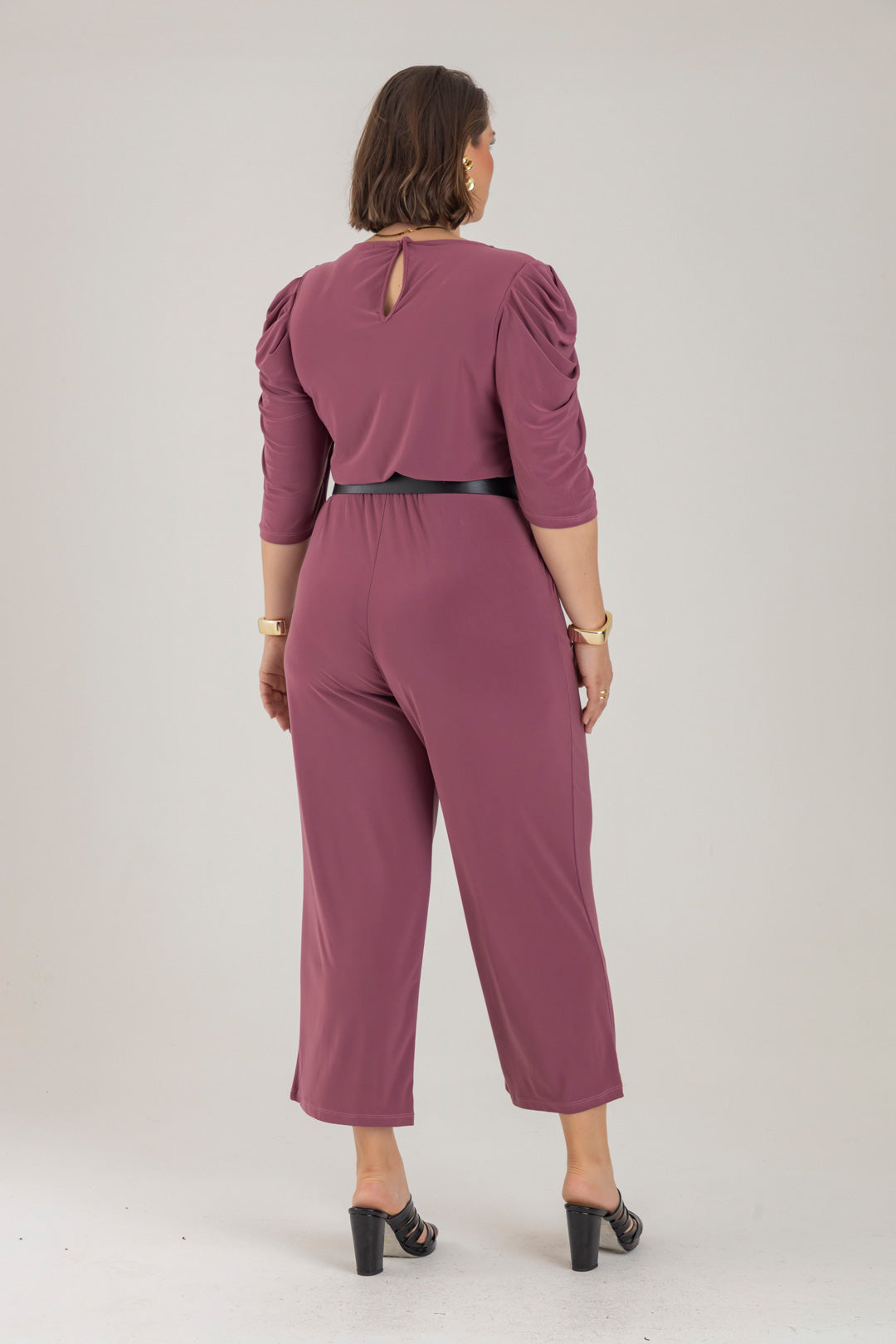 Enterizo cuello redondo, manga 3/4 con recogido en copa y elástico en cintura. Elaborado en Acetato fondo entero.