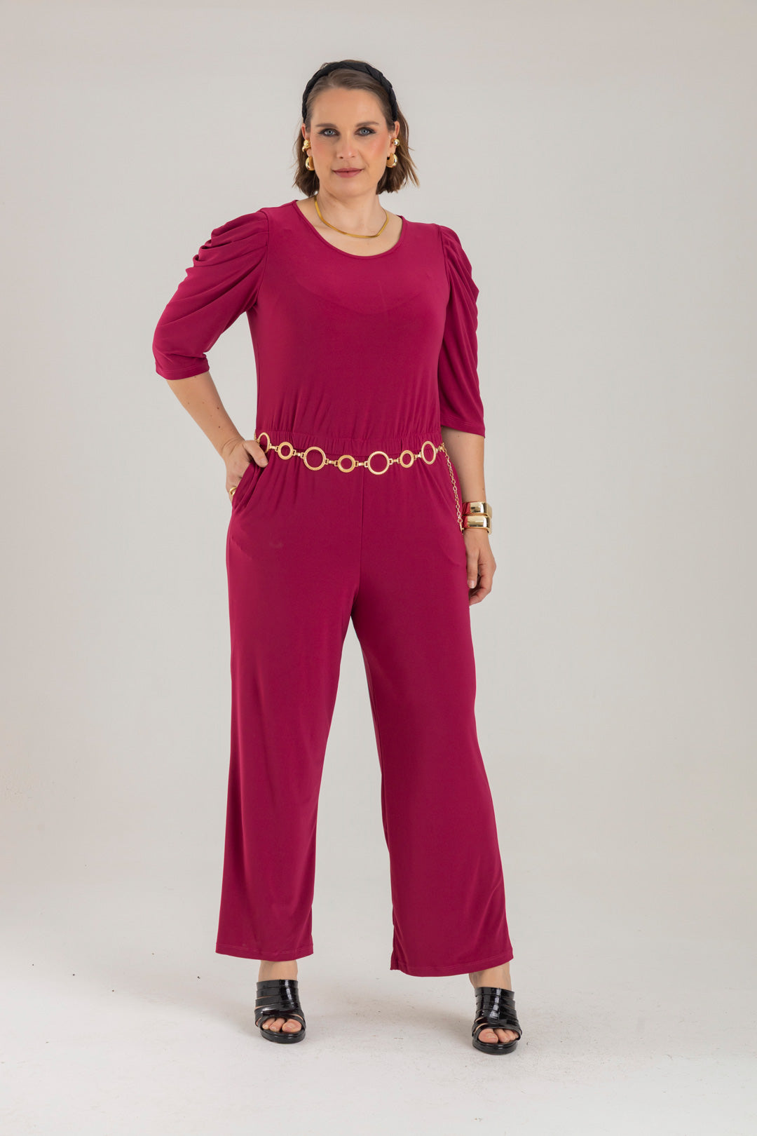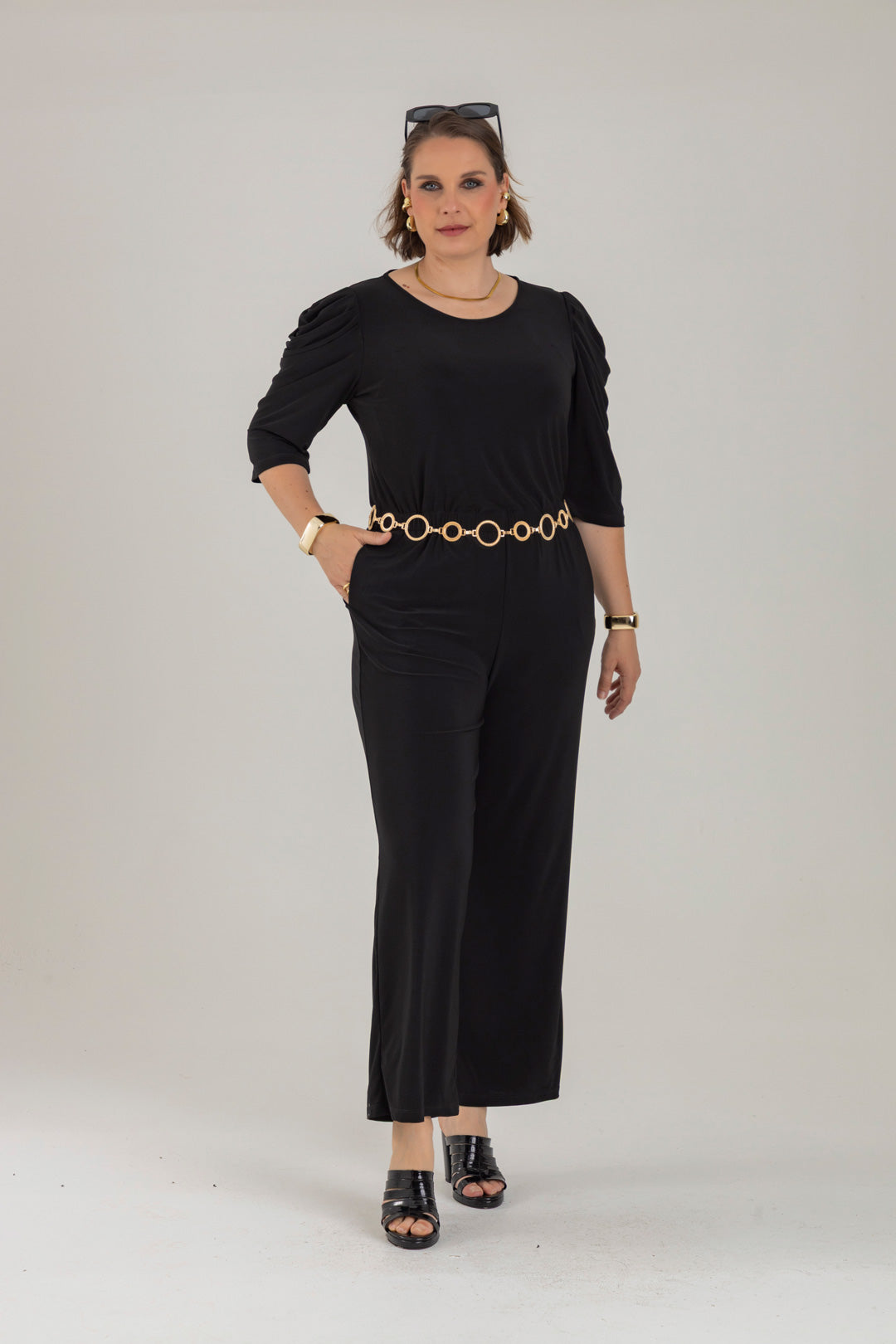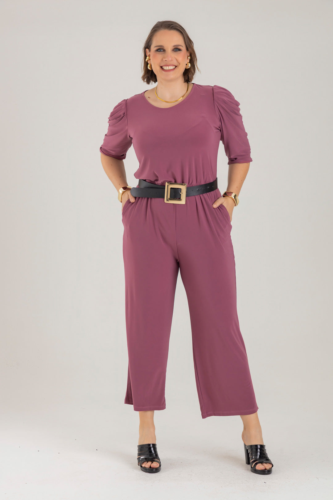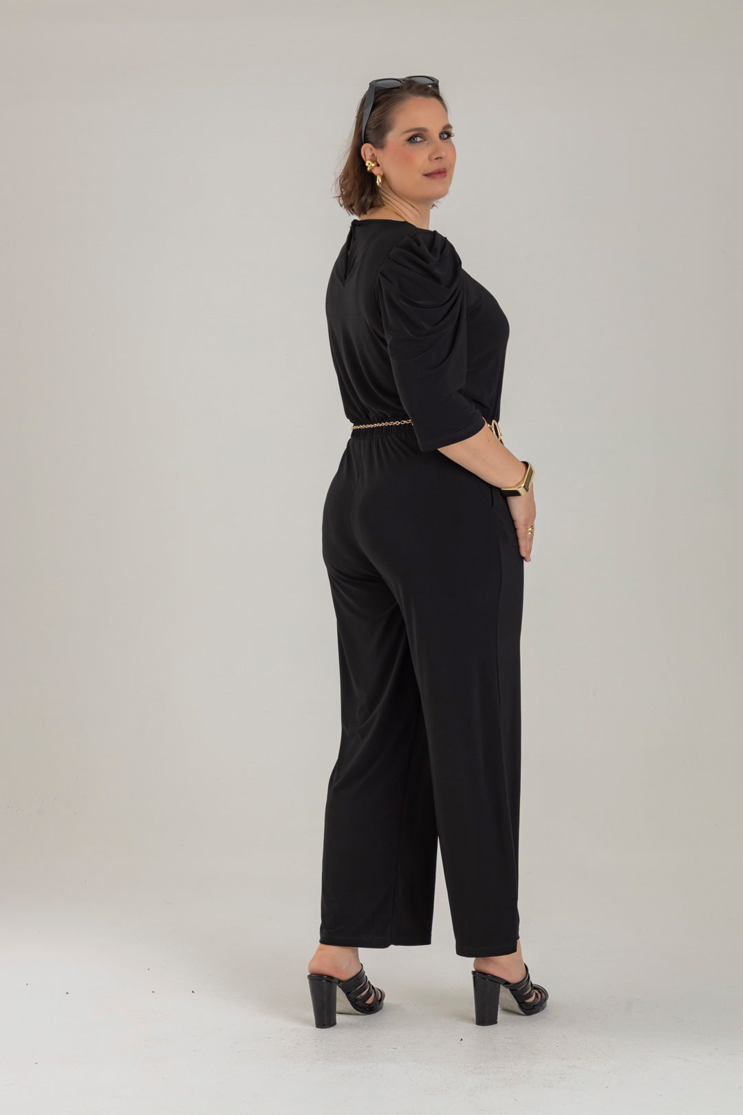 Enterizo cuello redondo, manga 3/4 con recogido en copa y elástico en cintura. Elaborado en Acetato fondo entero.