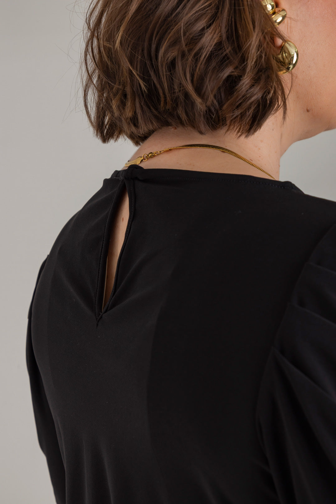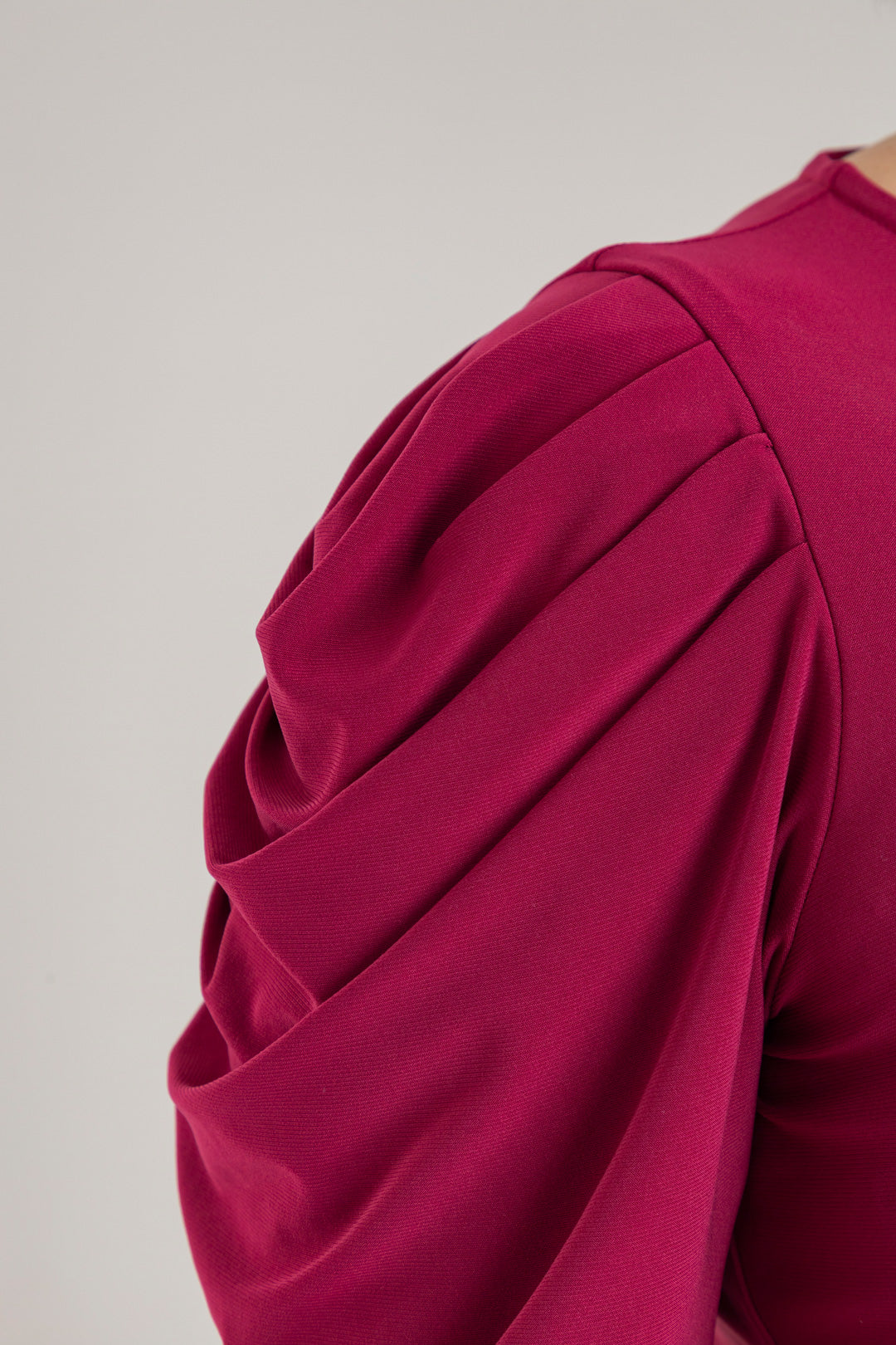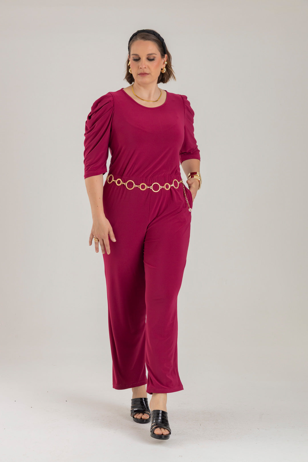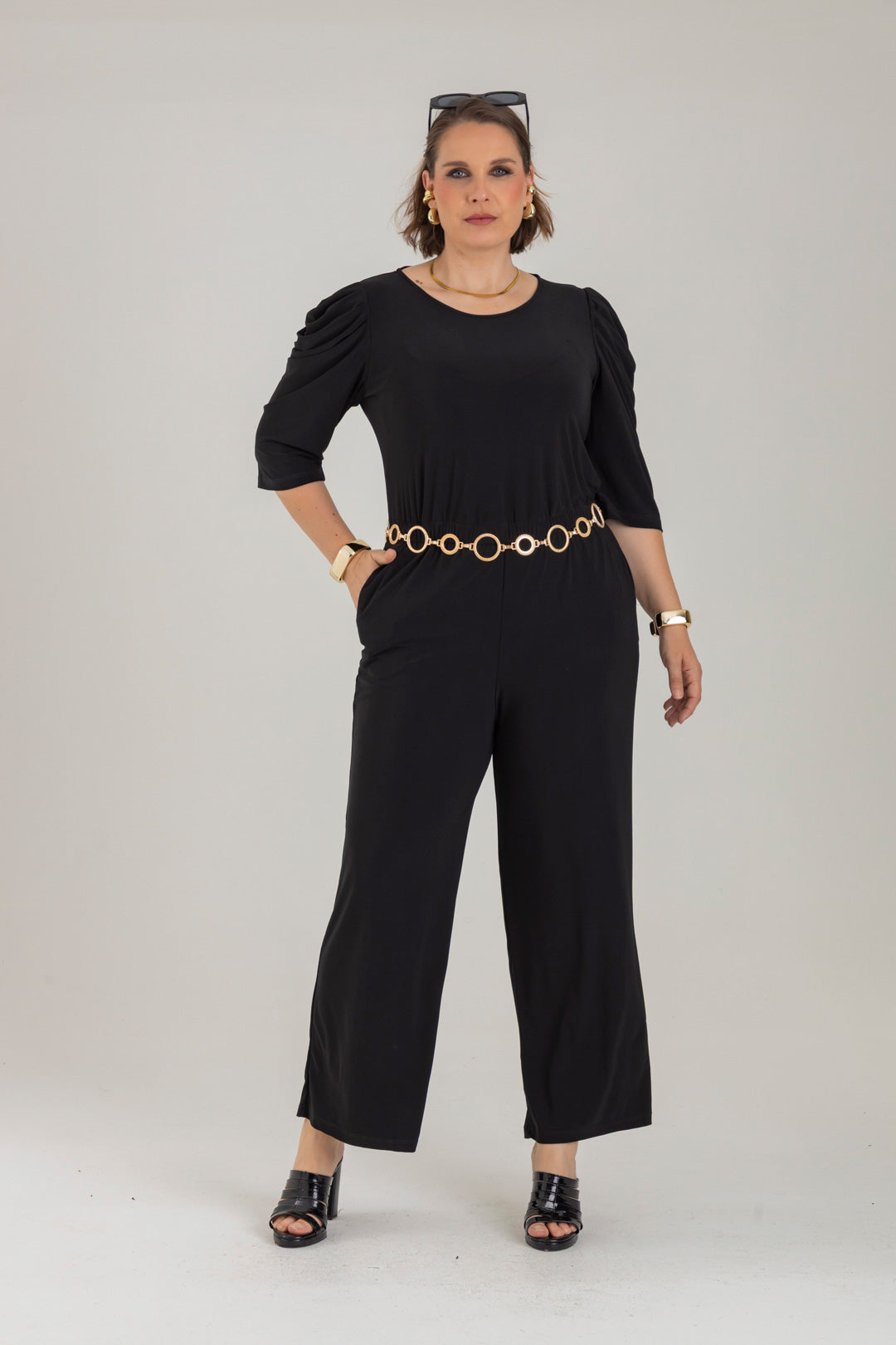 Enterizo cuello redondo, manga 3/4 con recogido en copa y elástico en cintura. Elaborado en Acetato fondo entero.