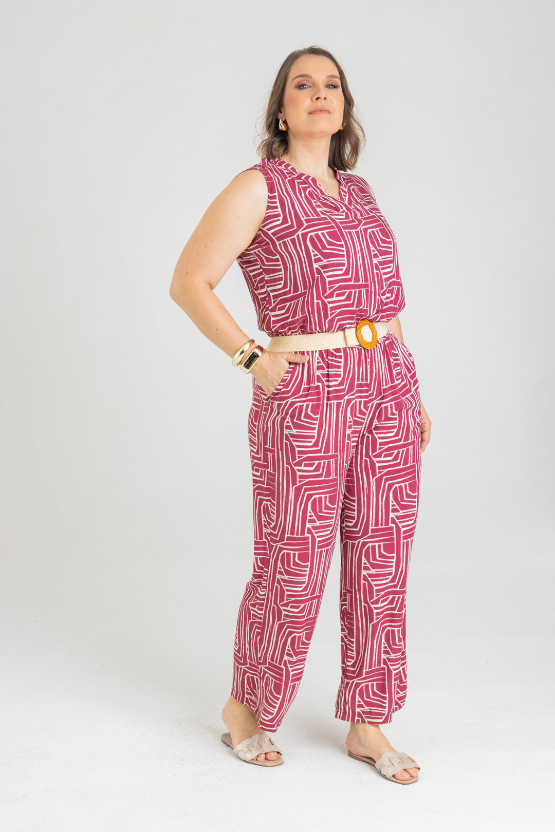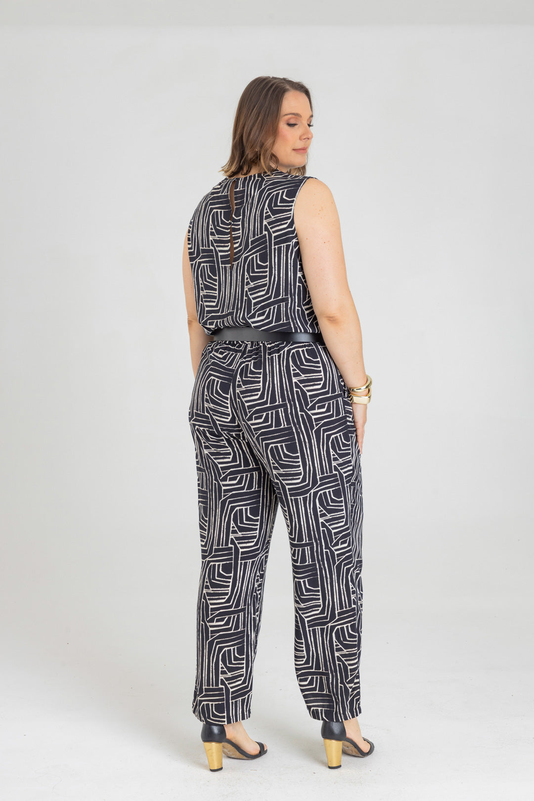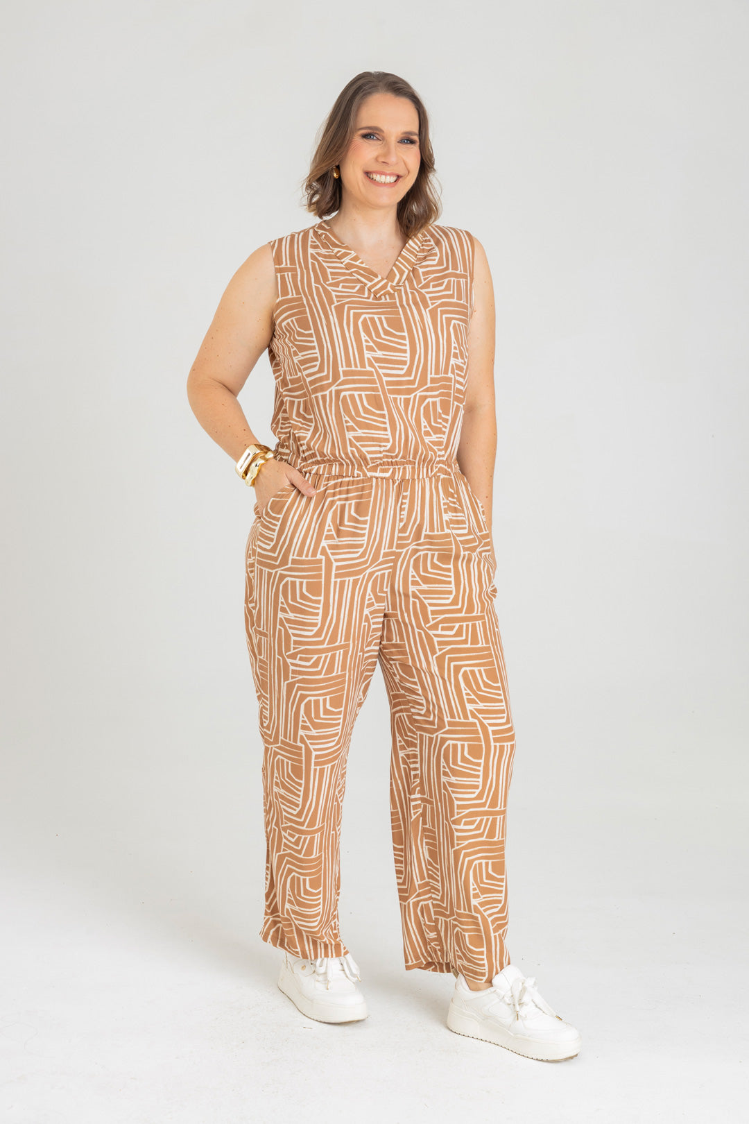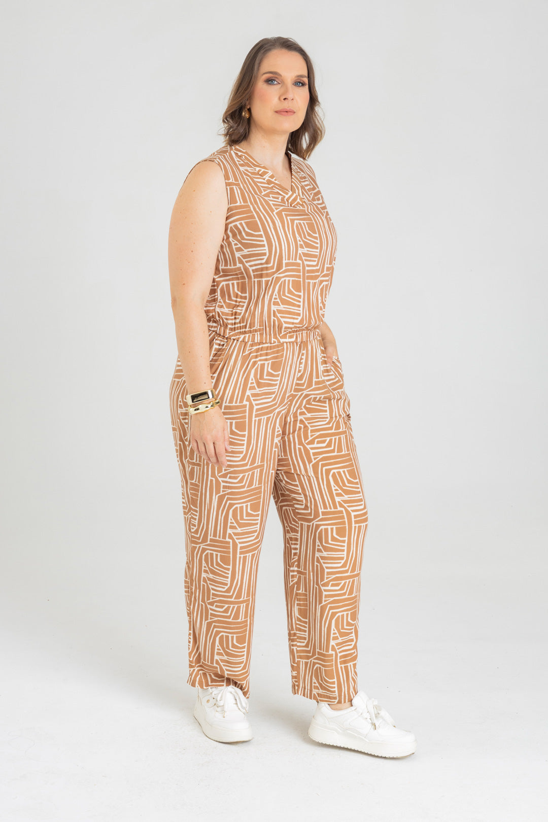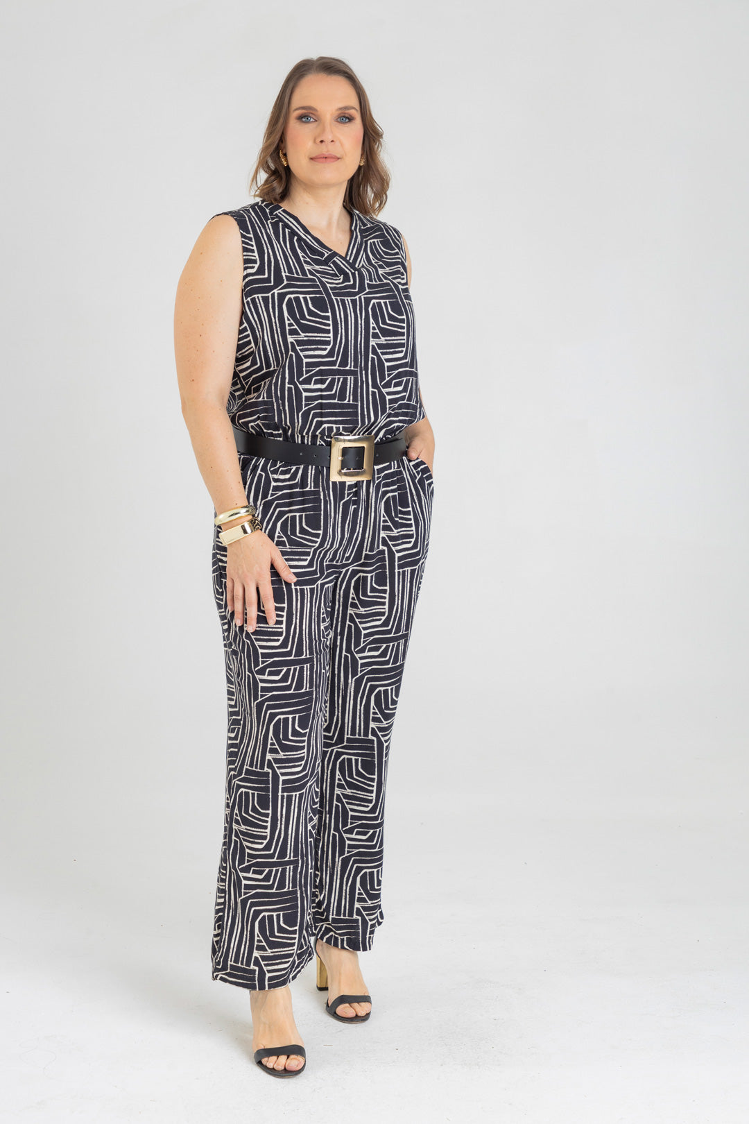 Enterizo escote en V, manga sisa, con elástico en cintura y bolsillos. Elaborado en Rayón estampado.