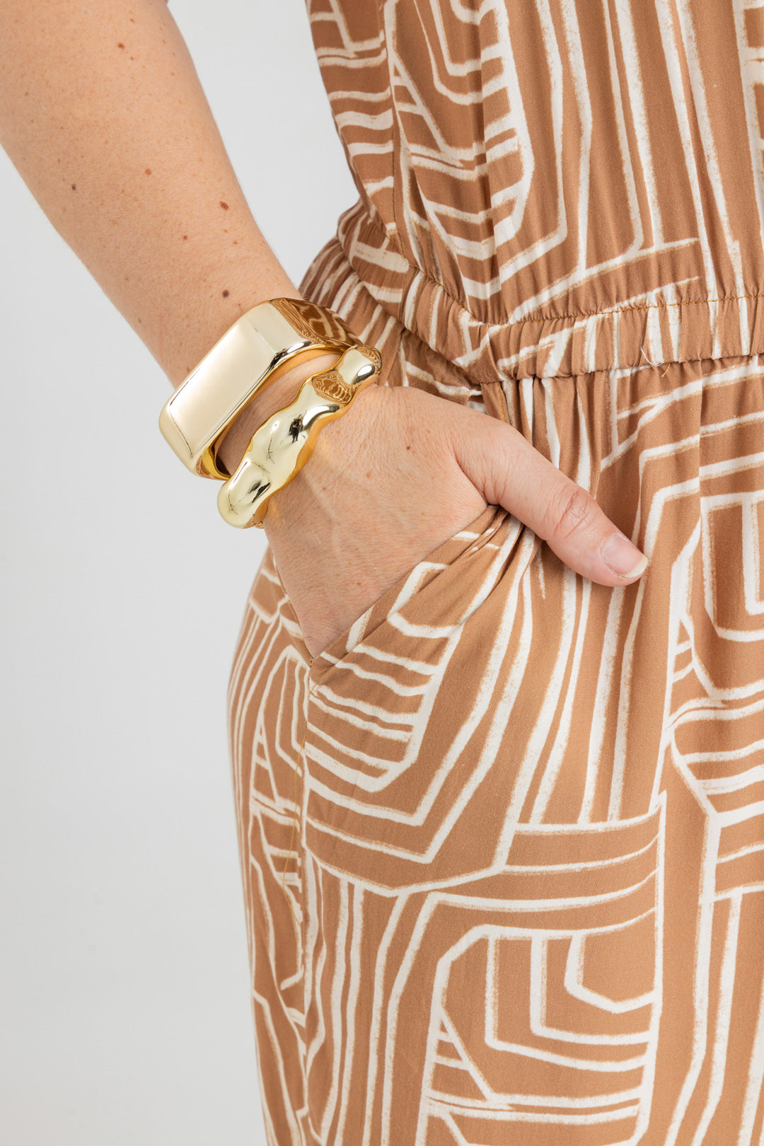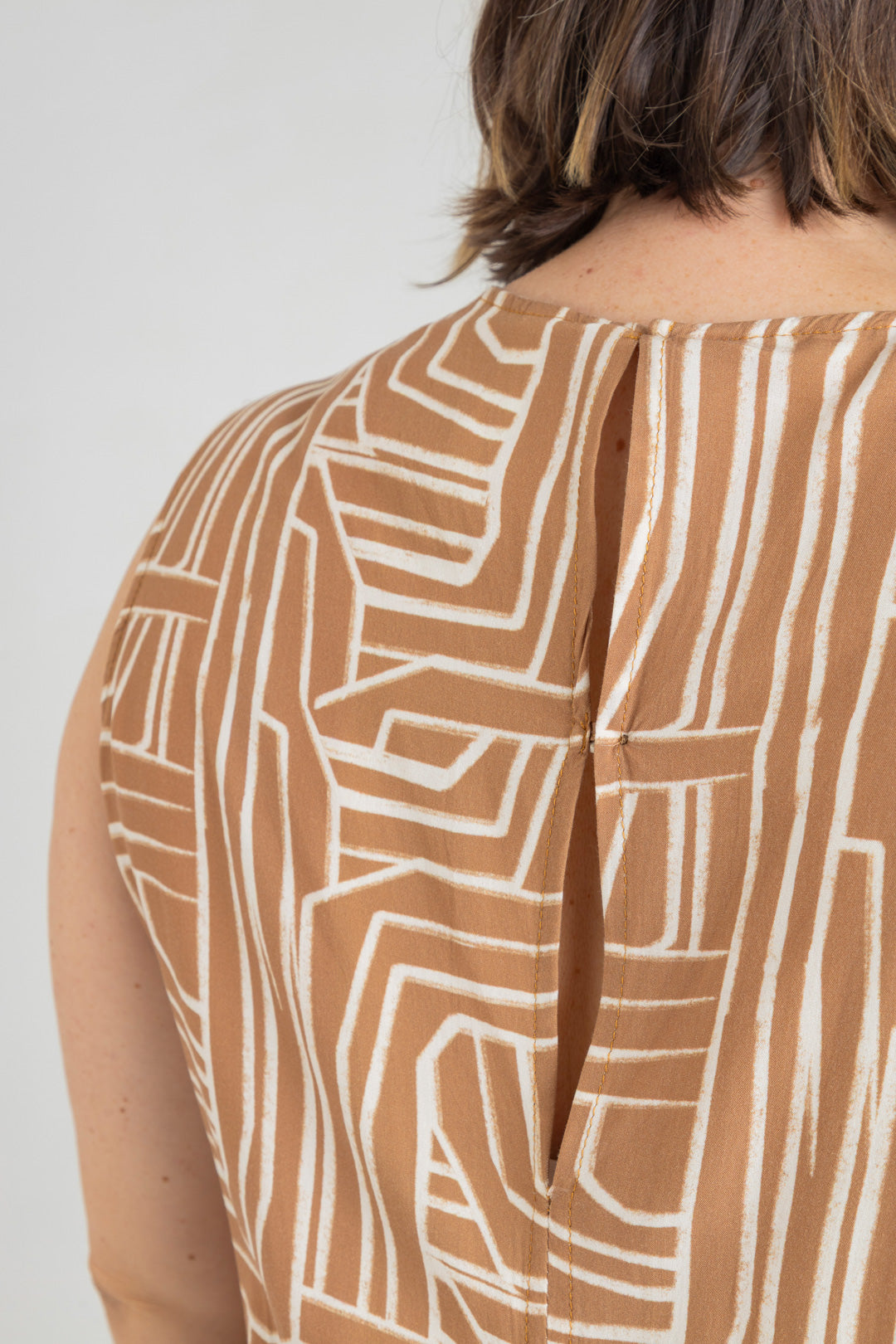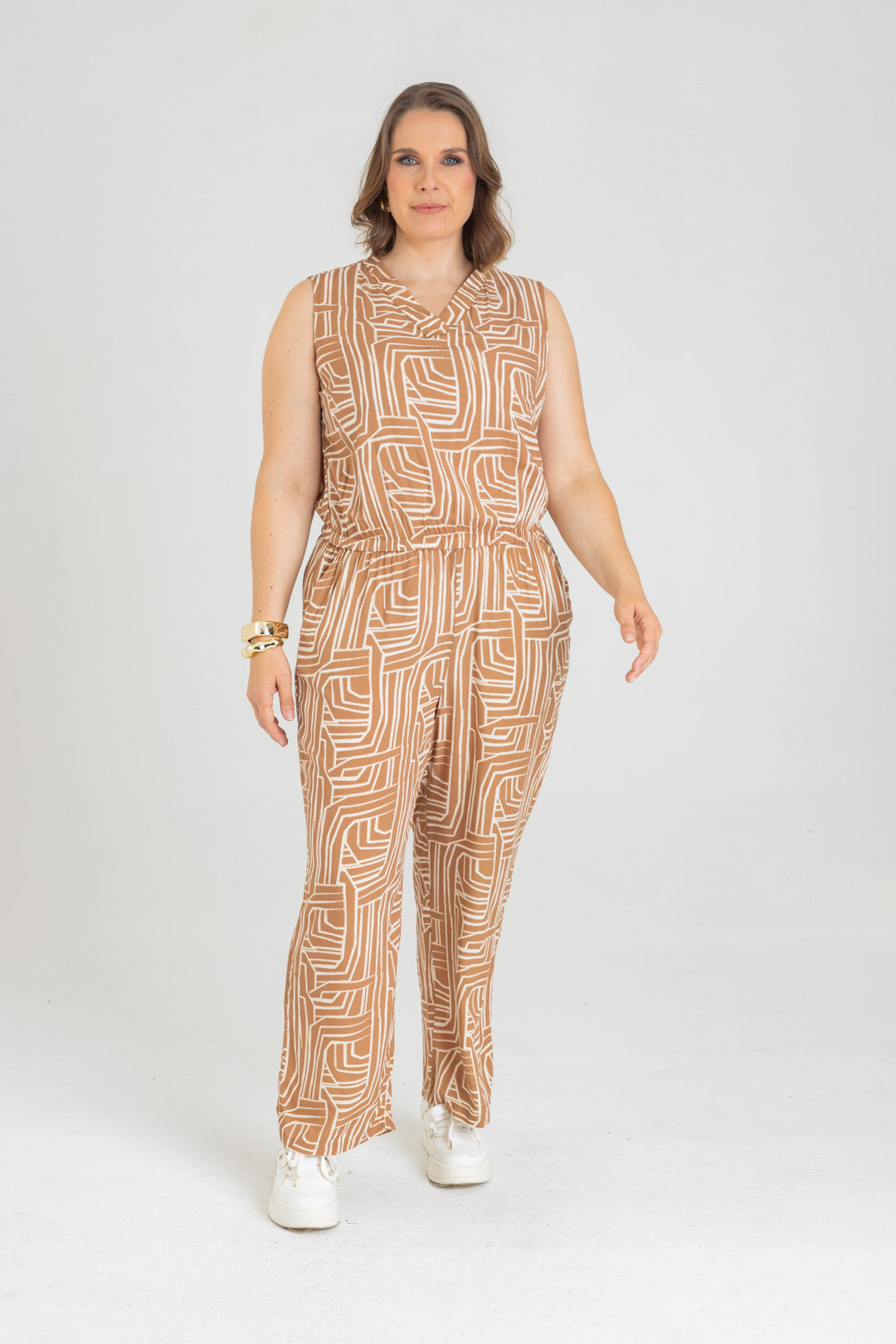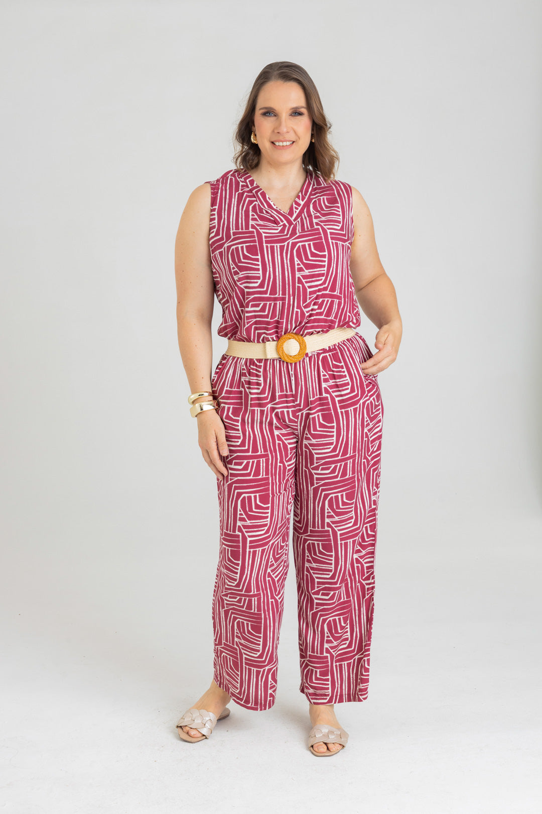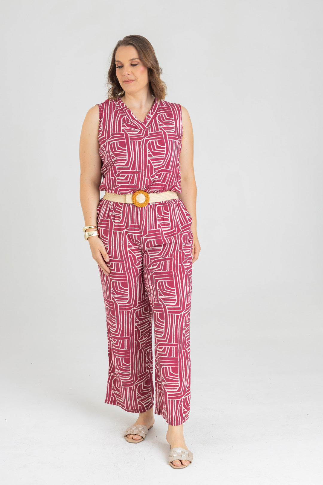 Enterizo escote en V, manga sisa, con elástico en cintura y bolsillos. Elaborado en Rayón estampado.
