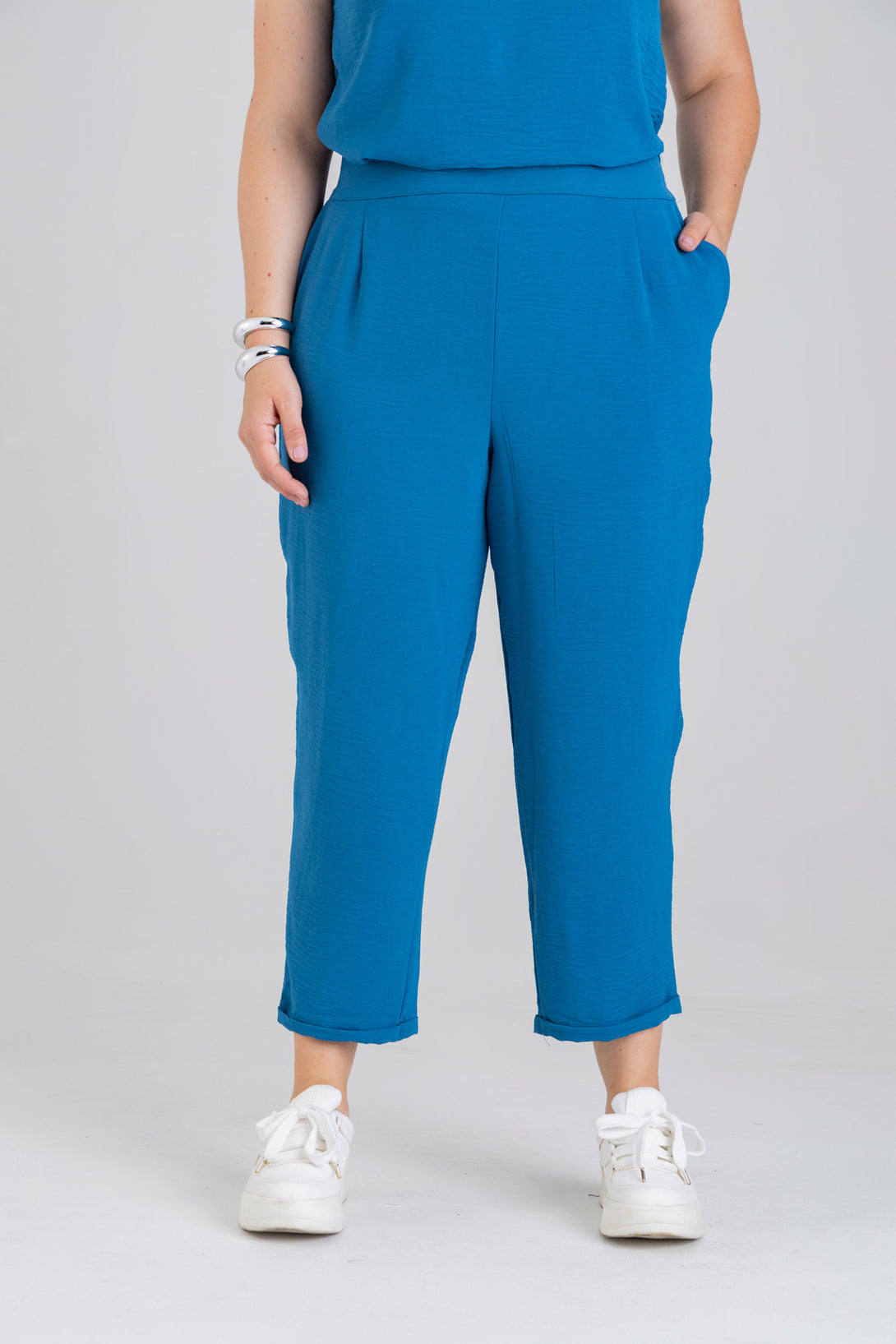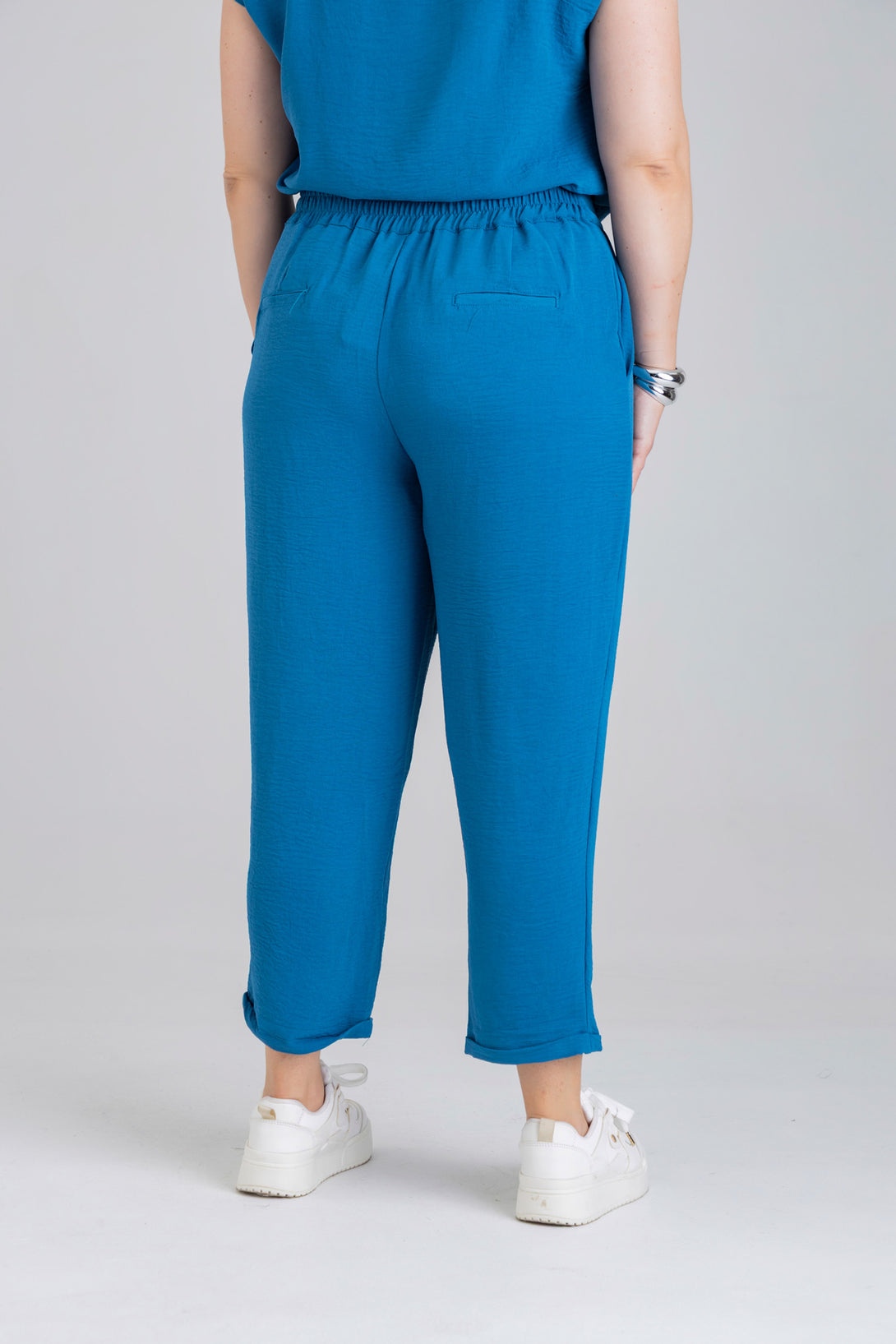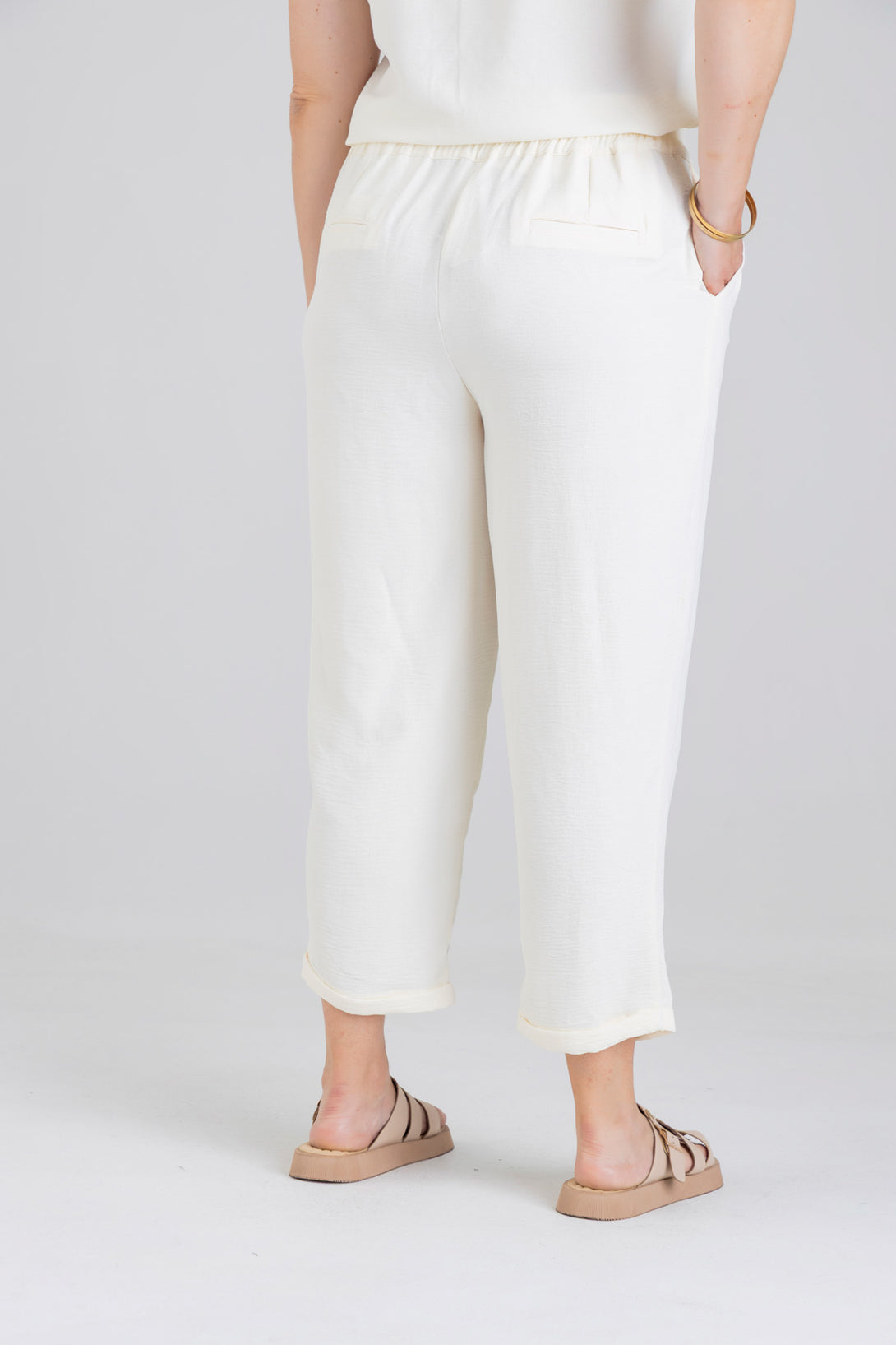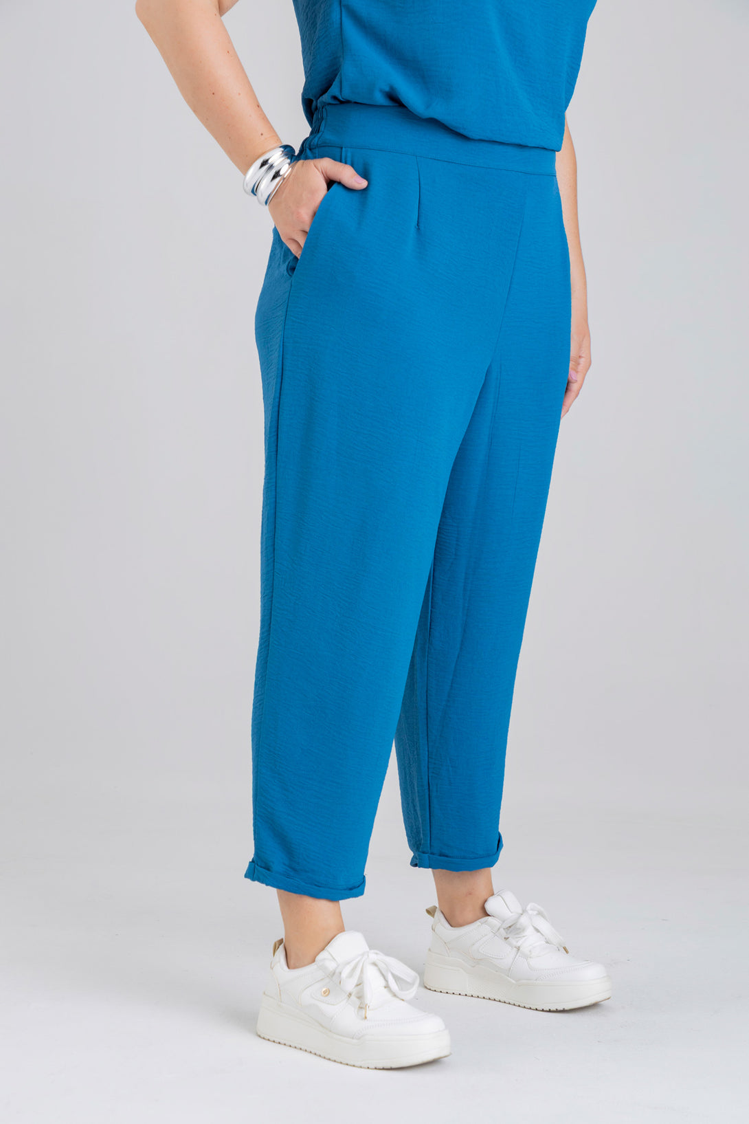 Pantalón capri, pretina posterior con elástico, detalle de pinzas en delantero y bolsillos diagonales en costado. Elaborada en Poliester fondo entero.