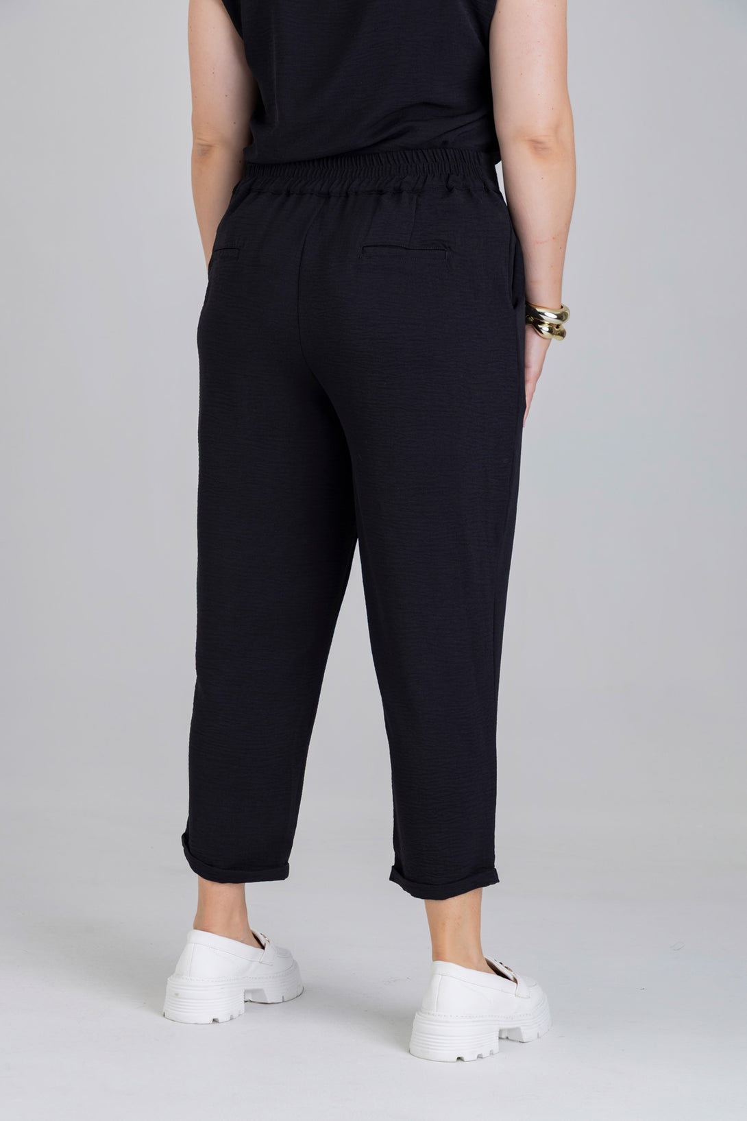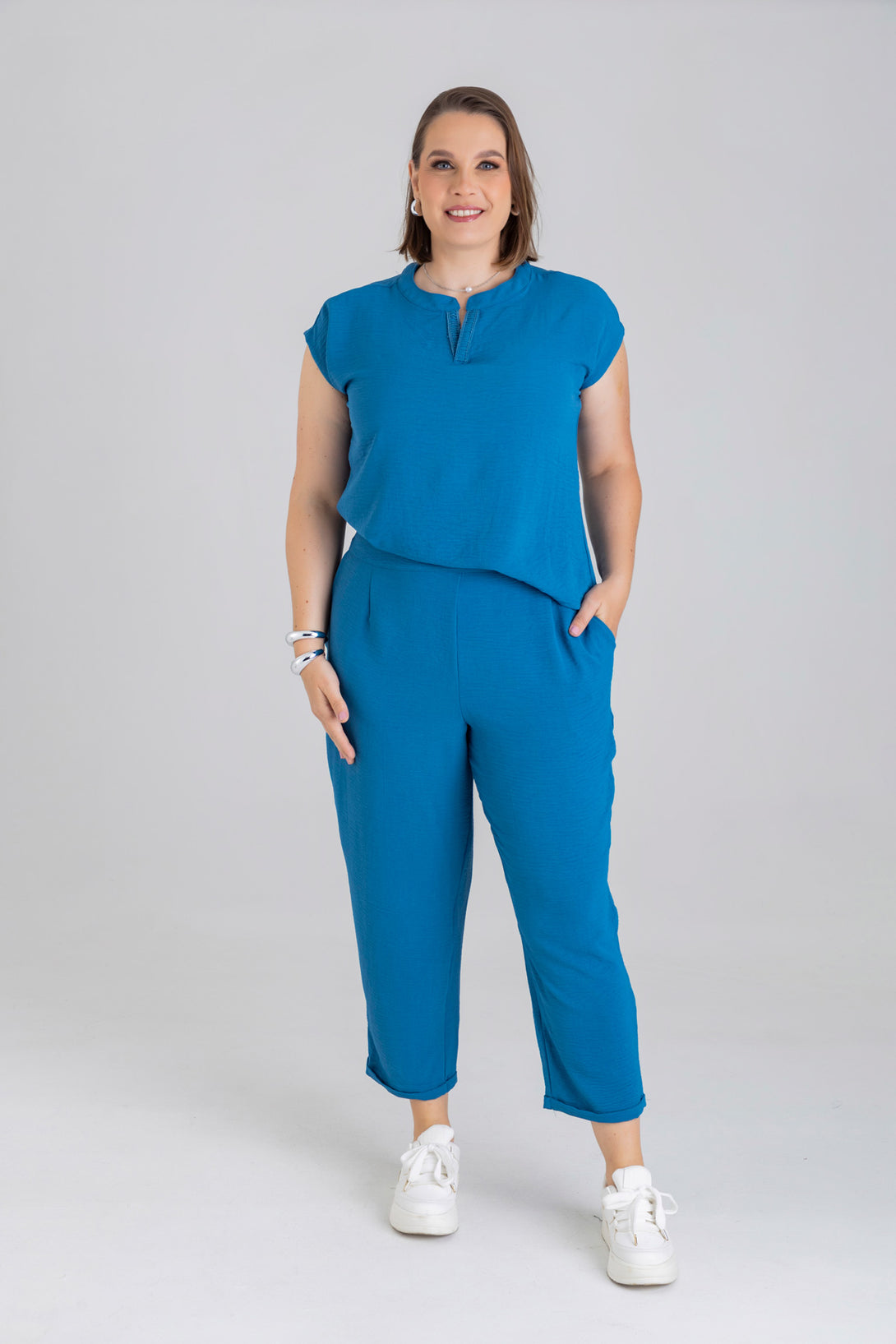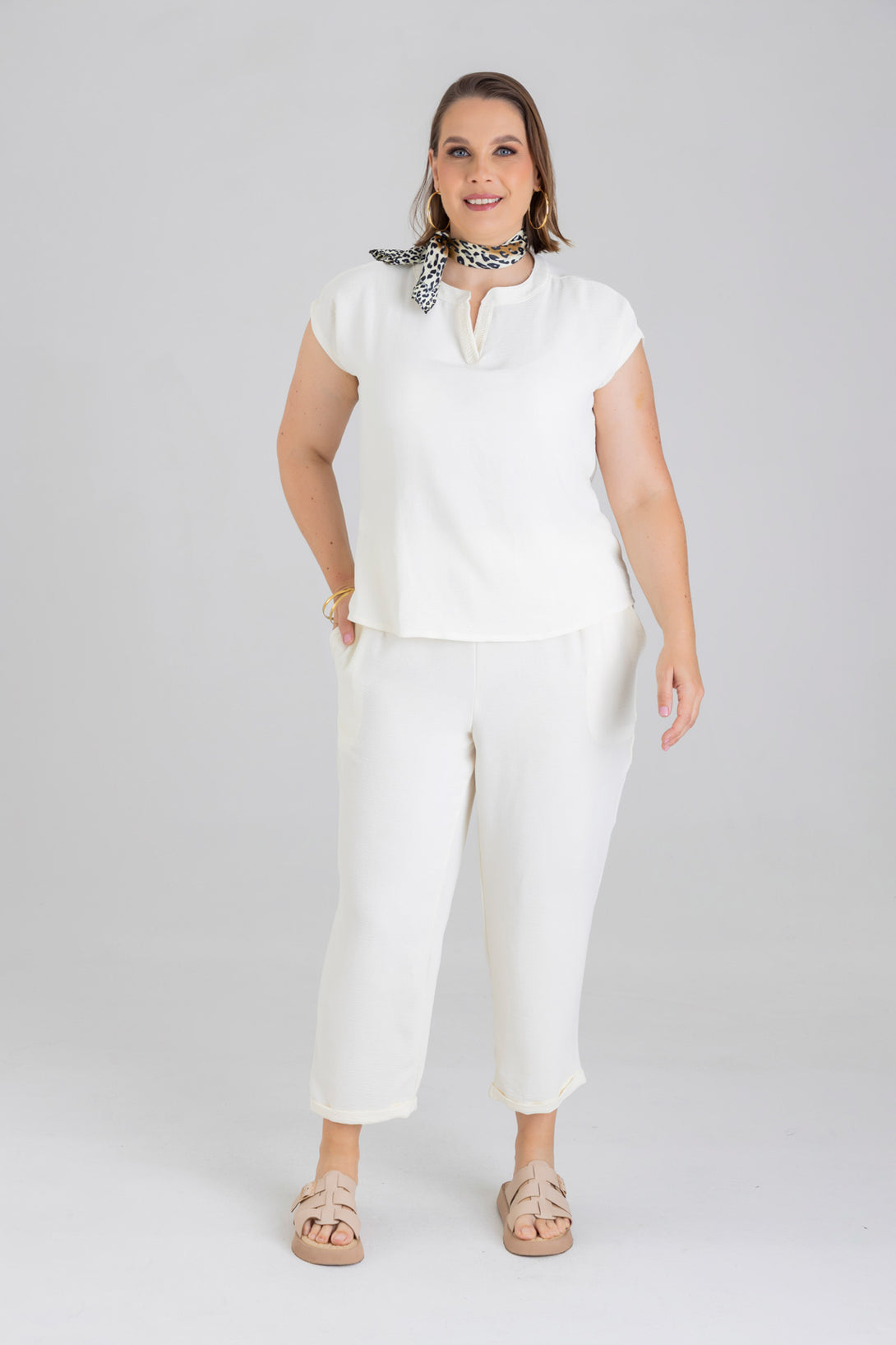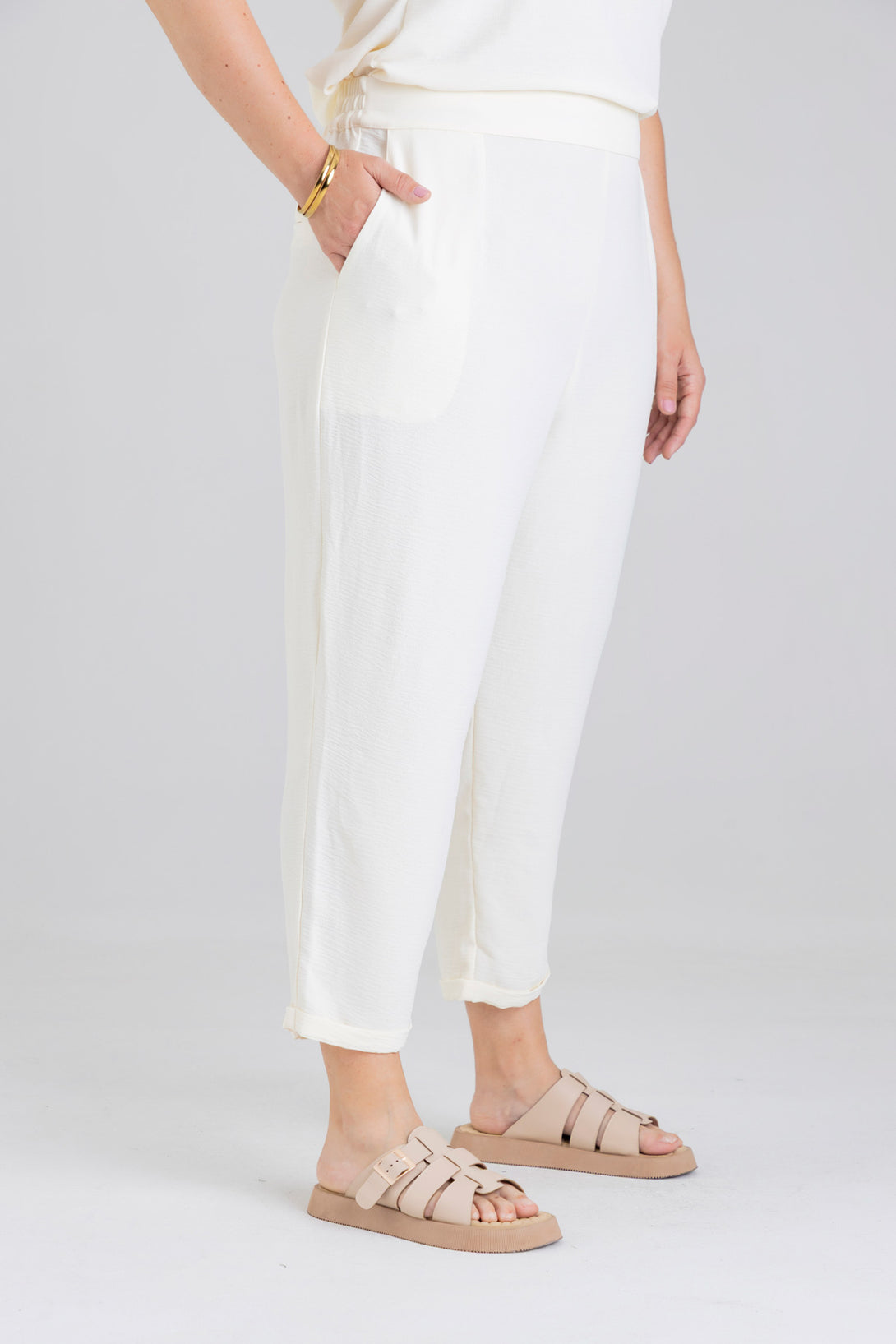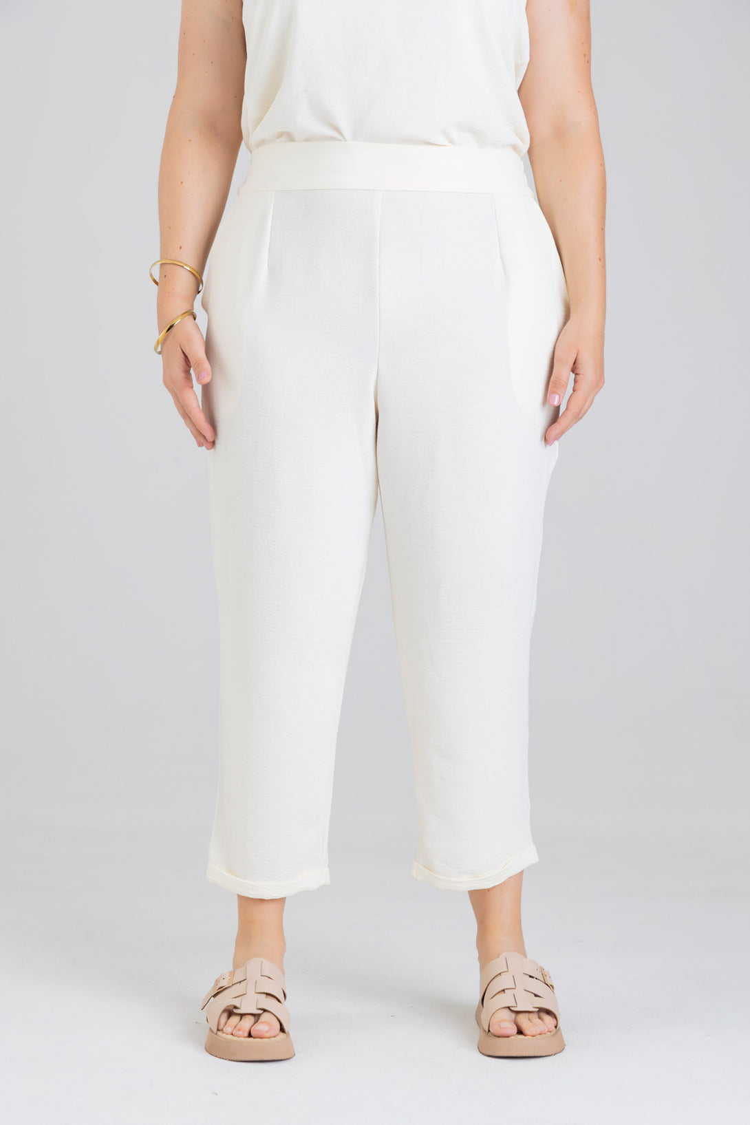 Pantalón capri, pretina posterior con elástico, detalle de pinzas en delantero y bolsillos diagonales en costado. Elaborada en Poliester fondo entero.