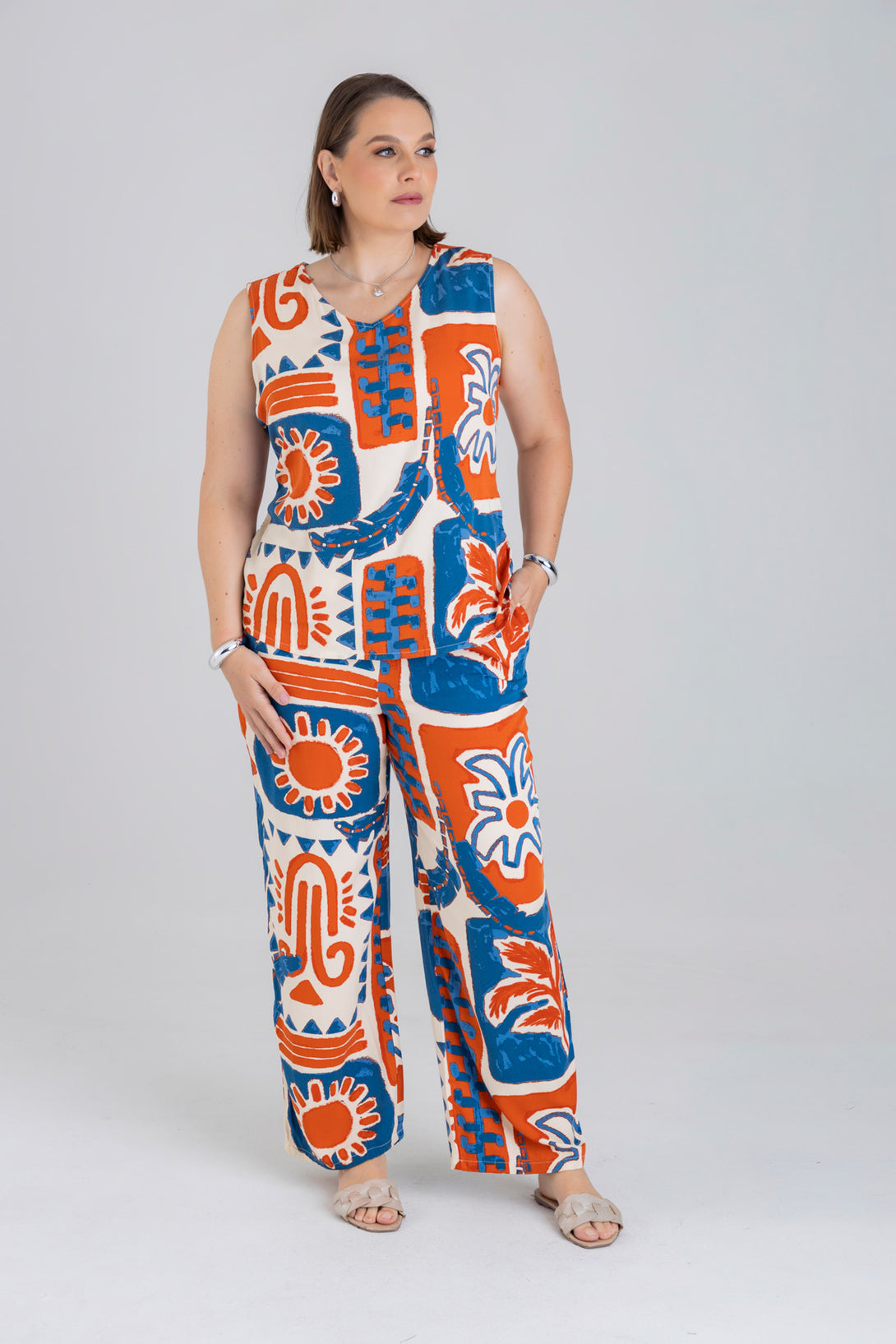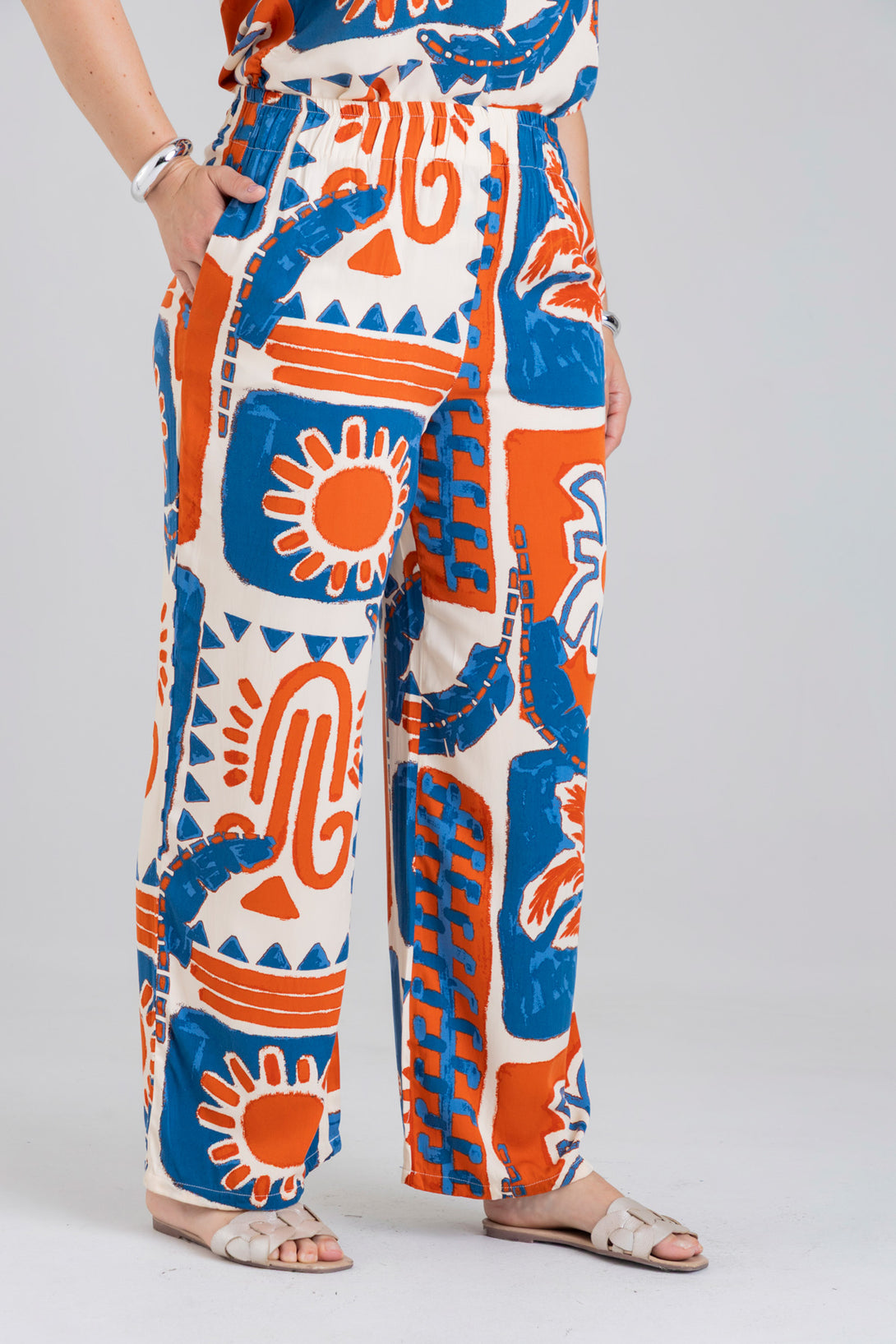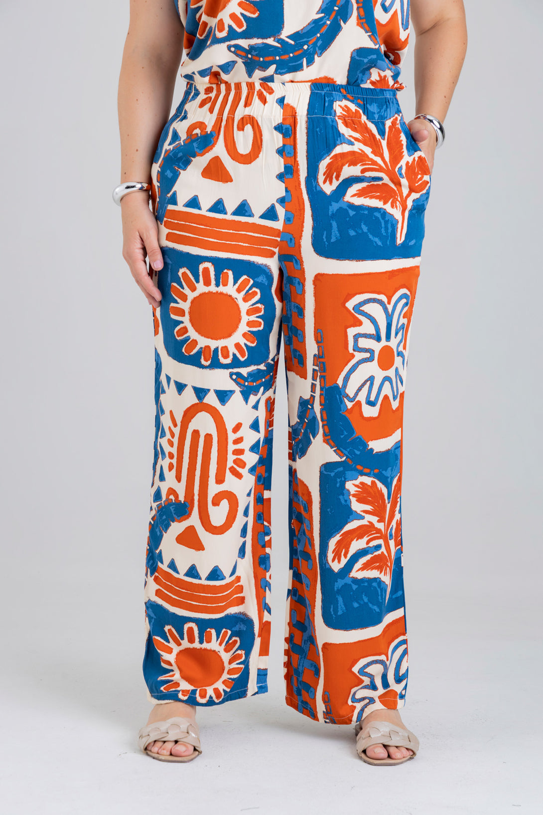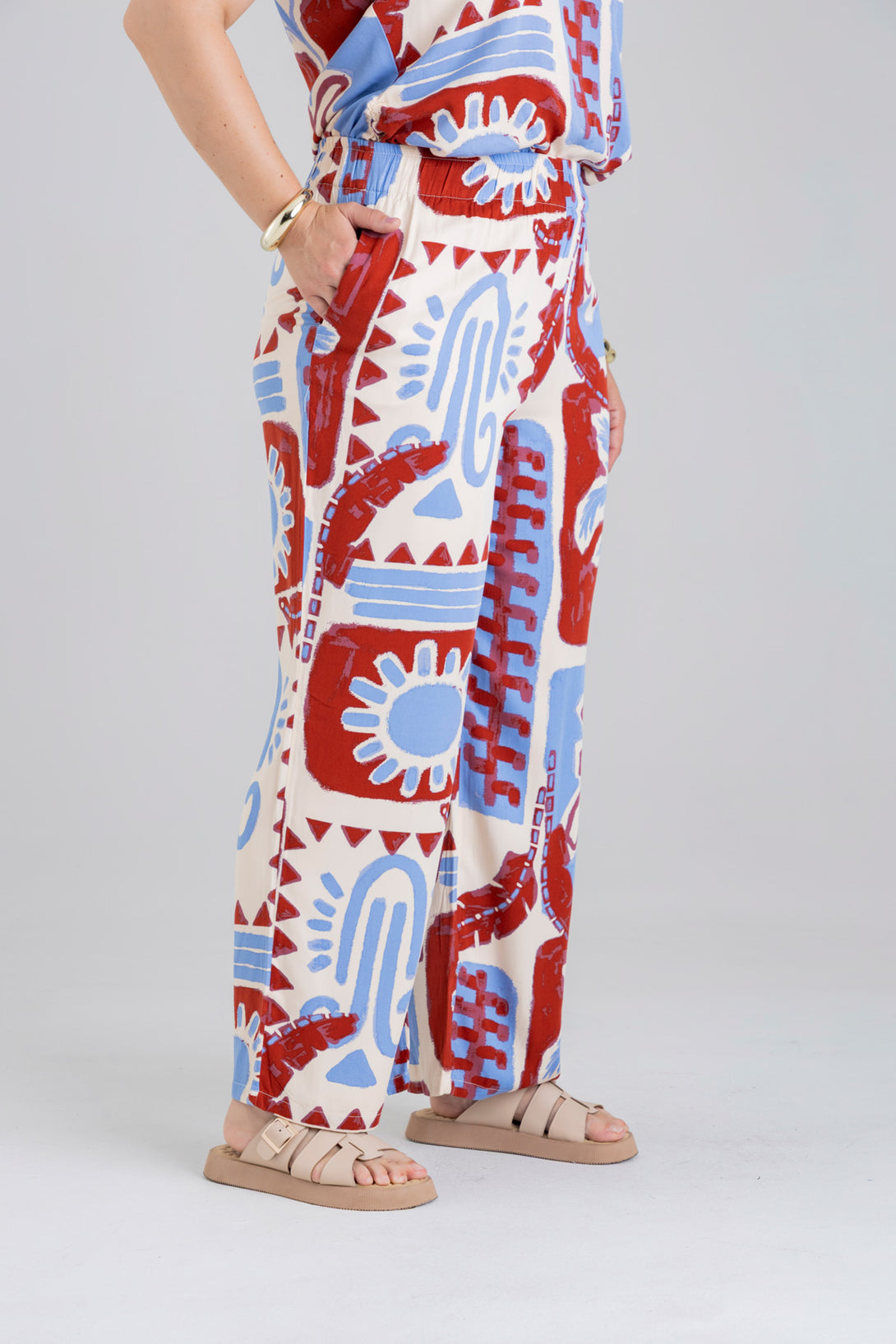 Pantalón fluido, contorno de cintura con elástico y bolsillos en costados. Elaborada en Rayón estampado.