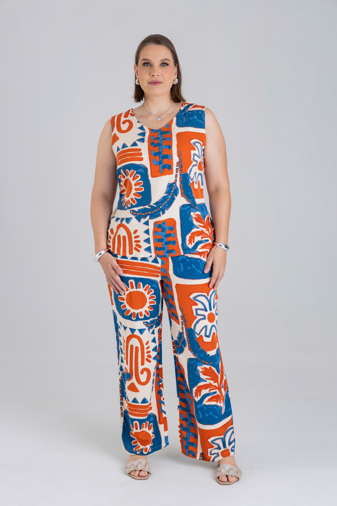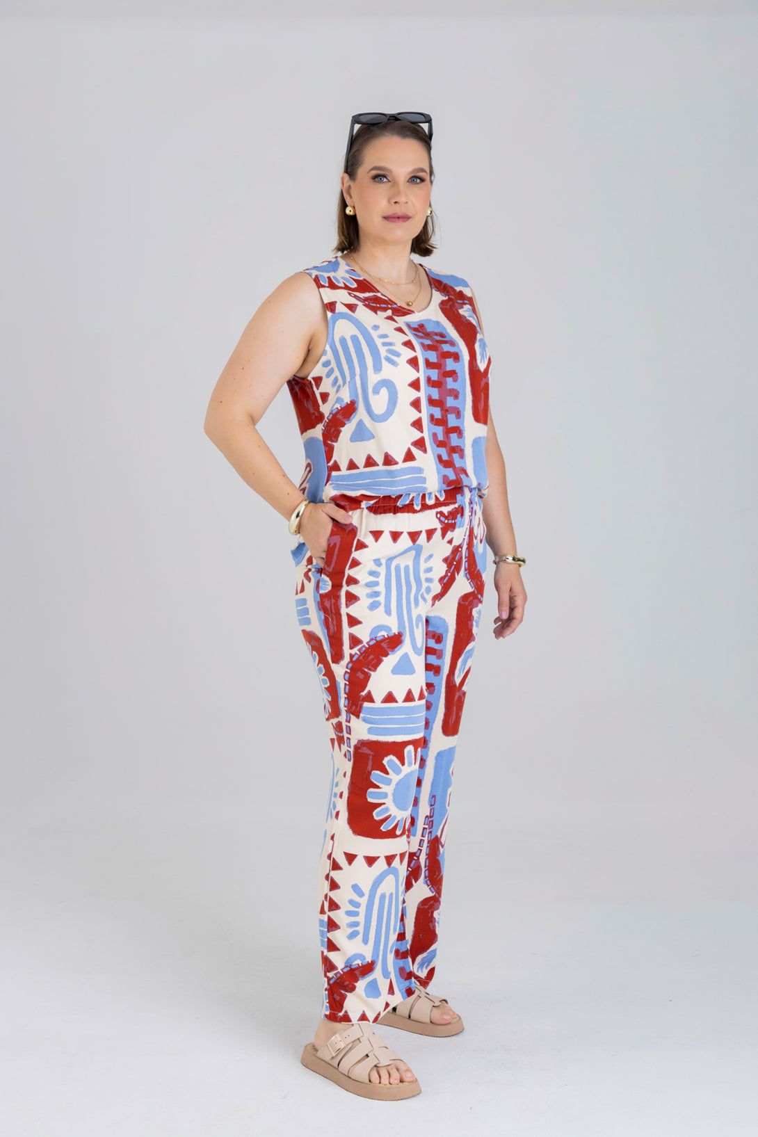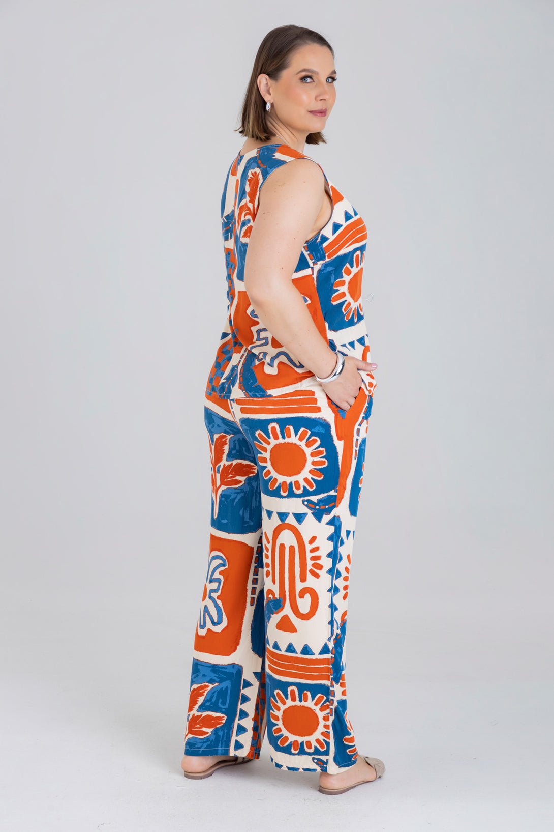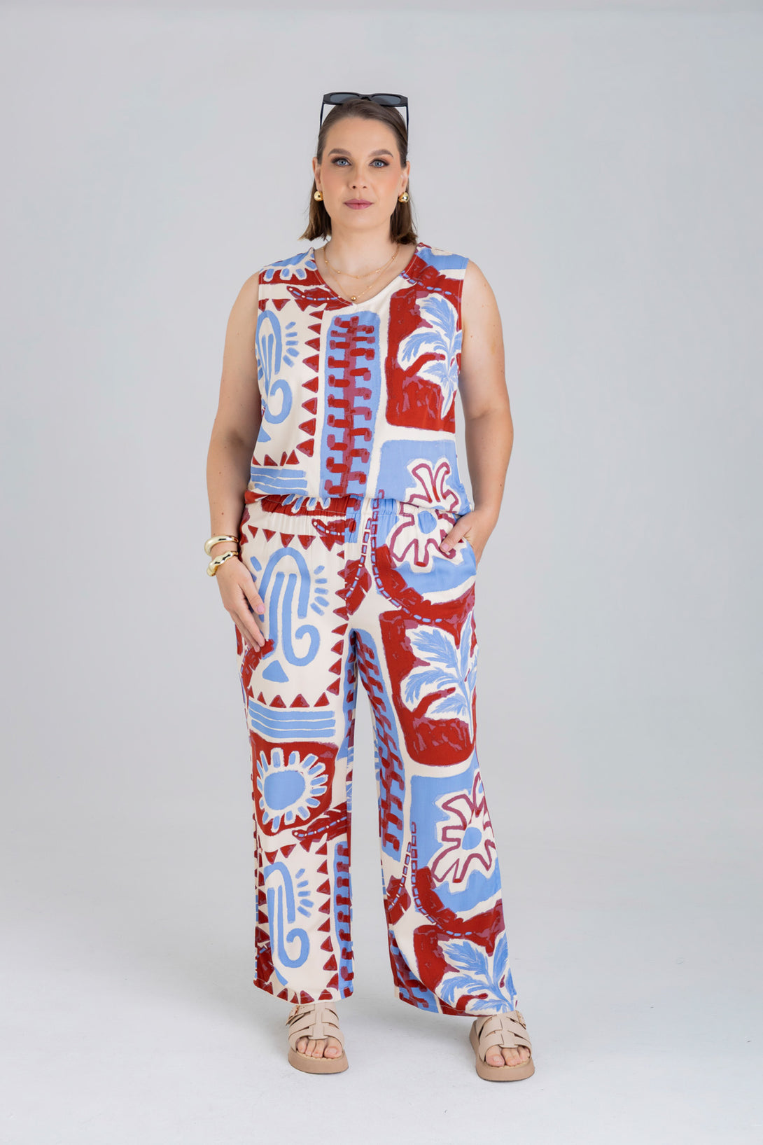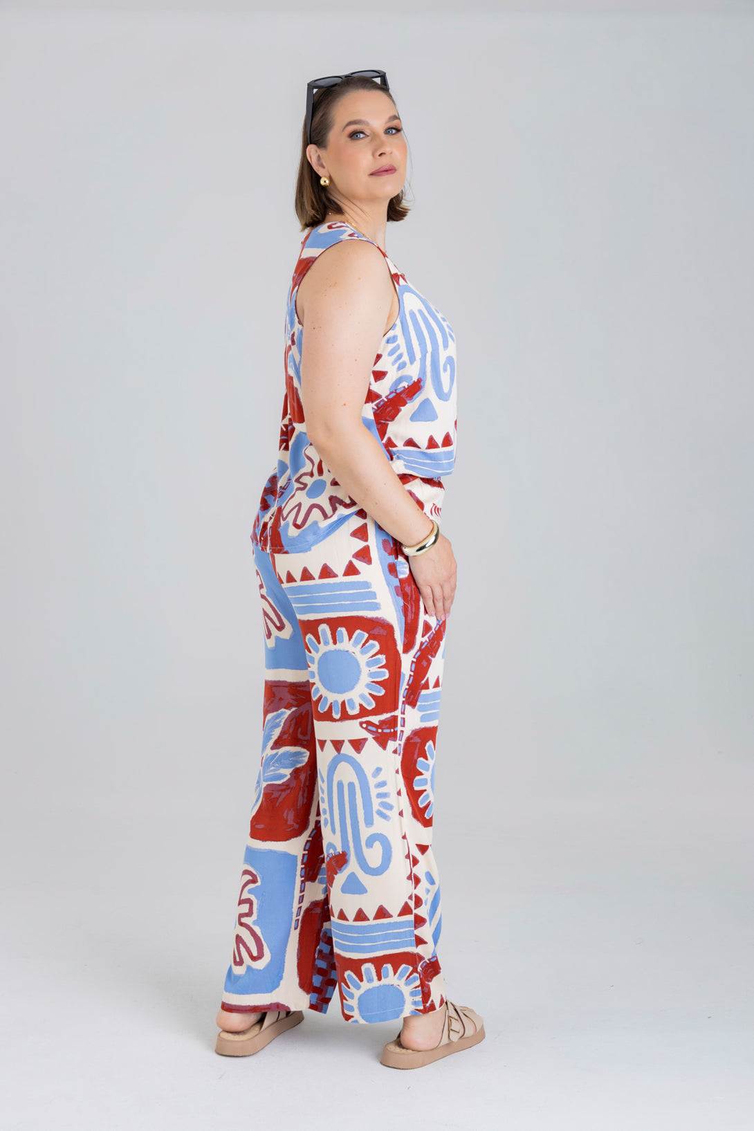 Pantalón fluido, contorno de cintura con elástico y bolsillos en costados. Elaborada en Rayón estampado.