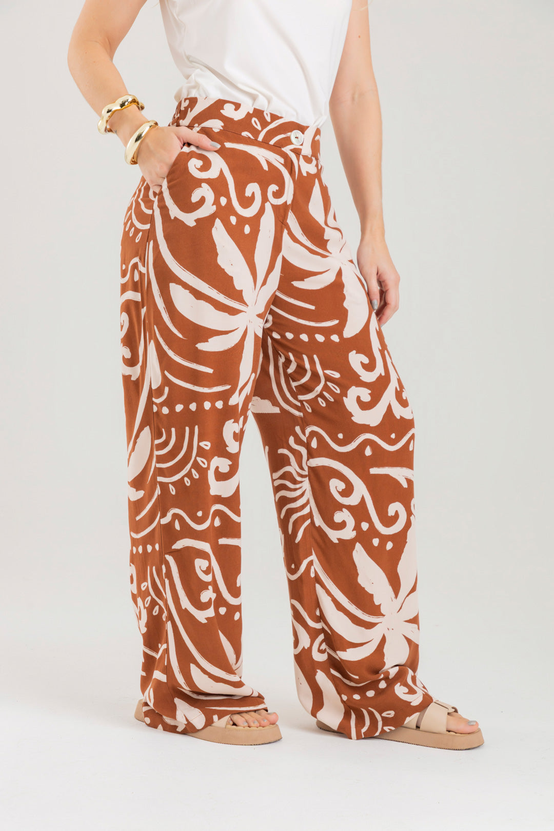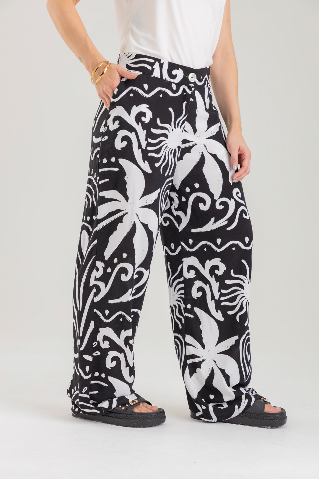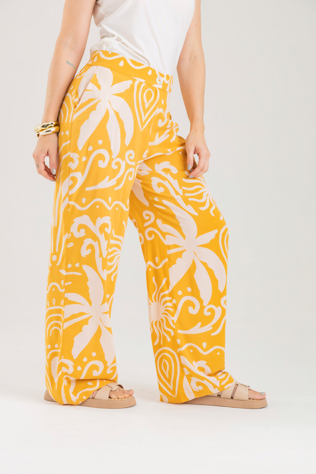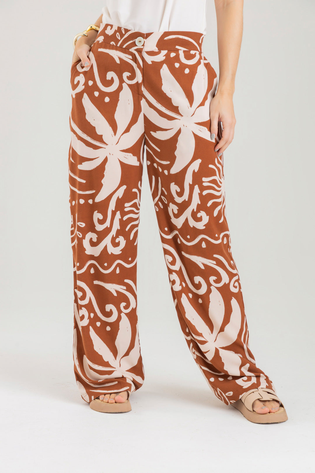 Pantalón silueta fluida con pretina y bolsillos diagonales en costado. Elaborado en Rayón estampado.