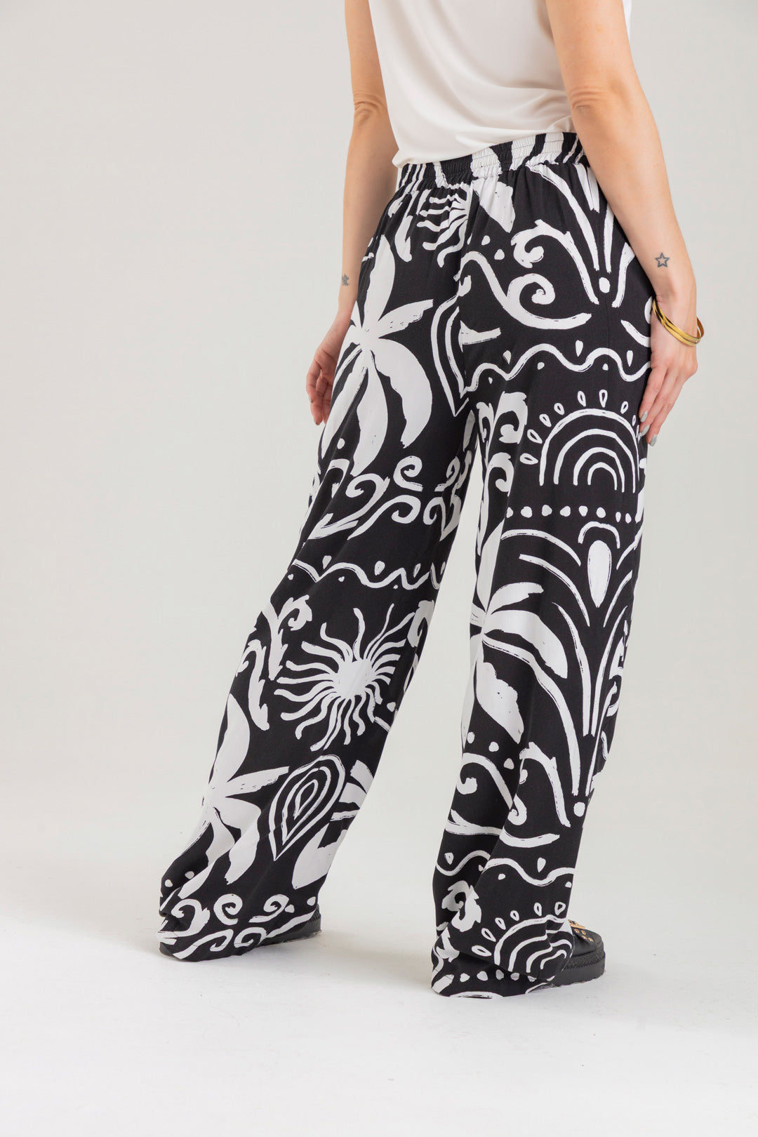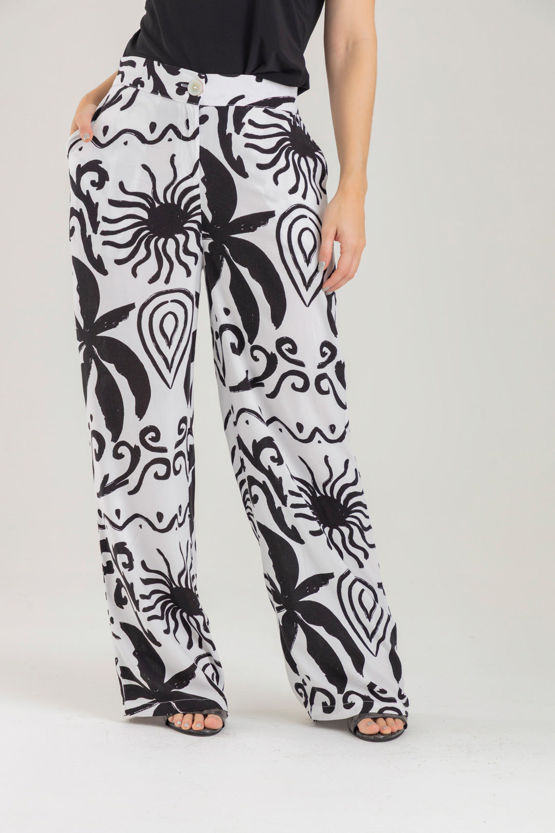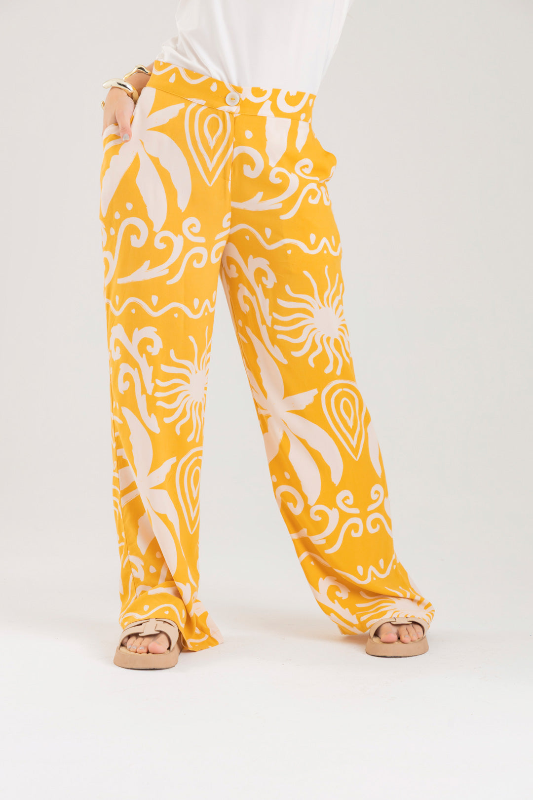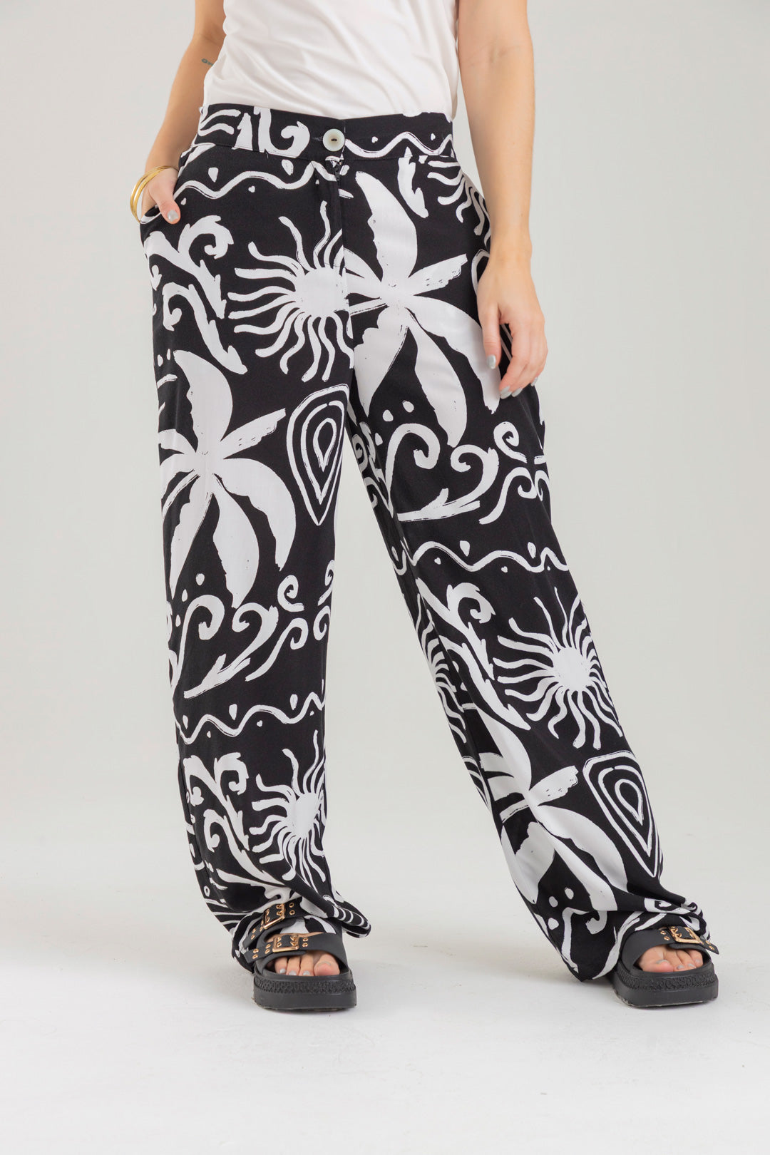 Pantalón silueta fluida con pretina y bolsillos diagonales en costado. Elaborado en Rayón estampado.