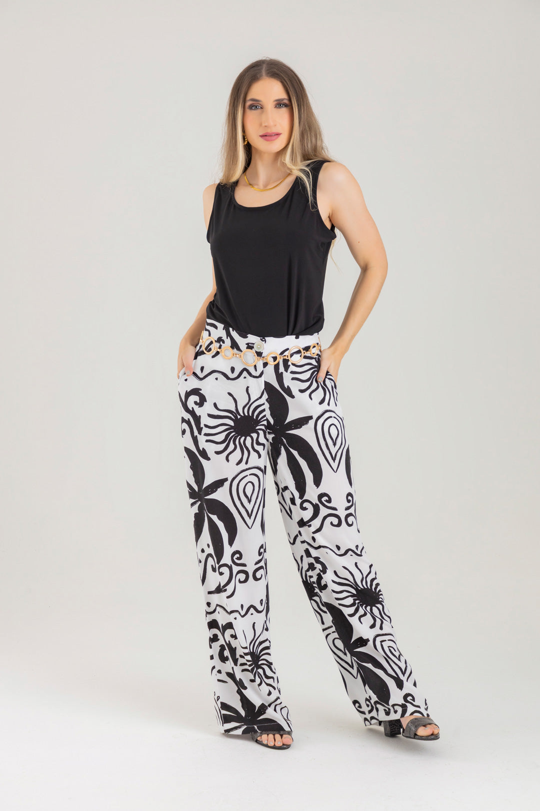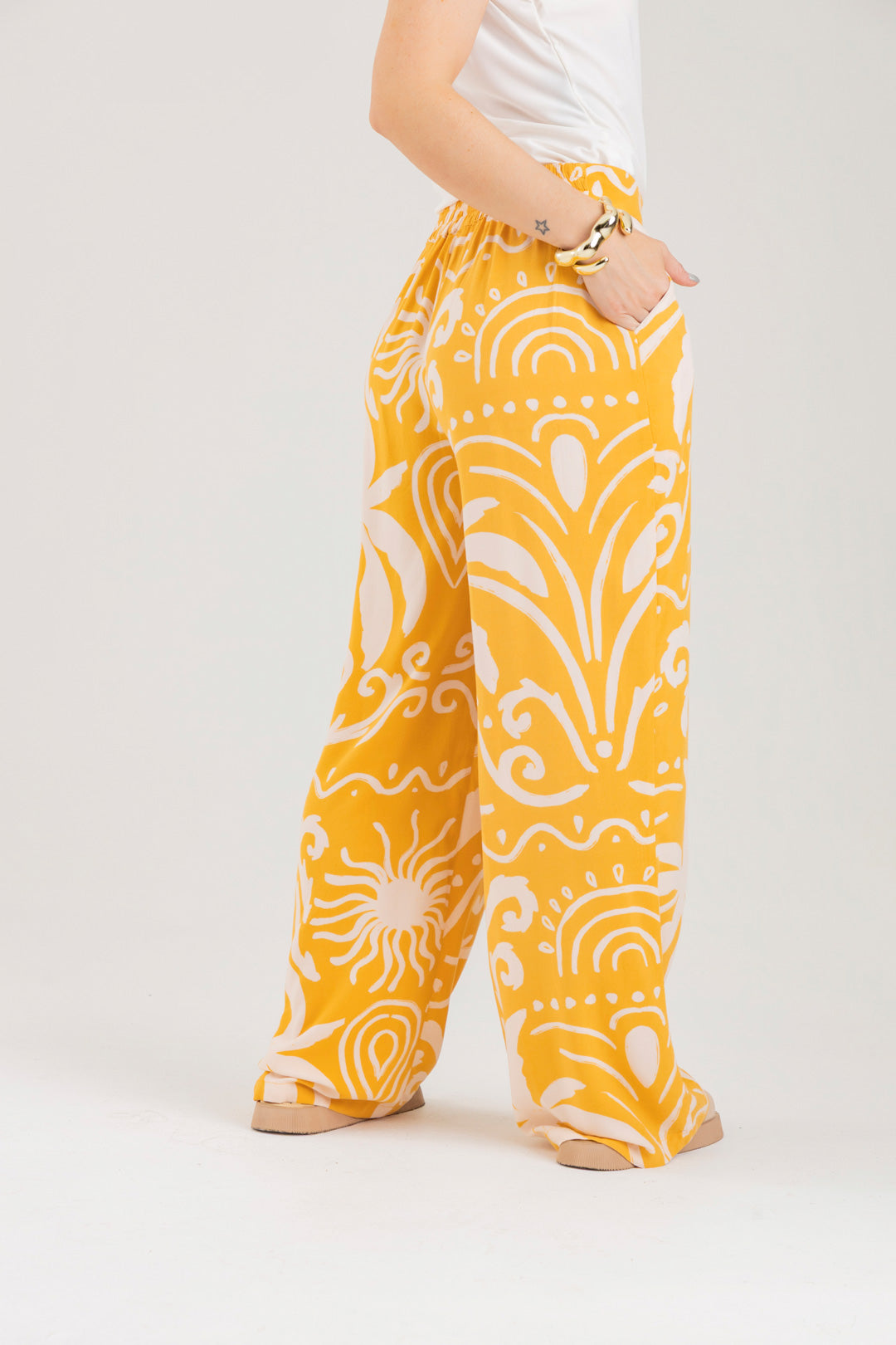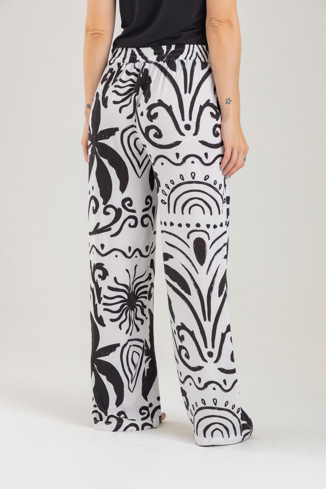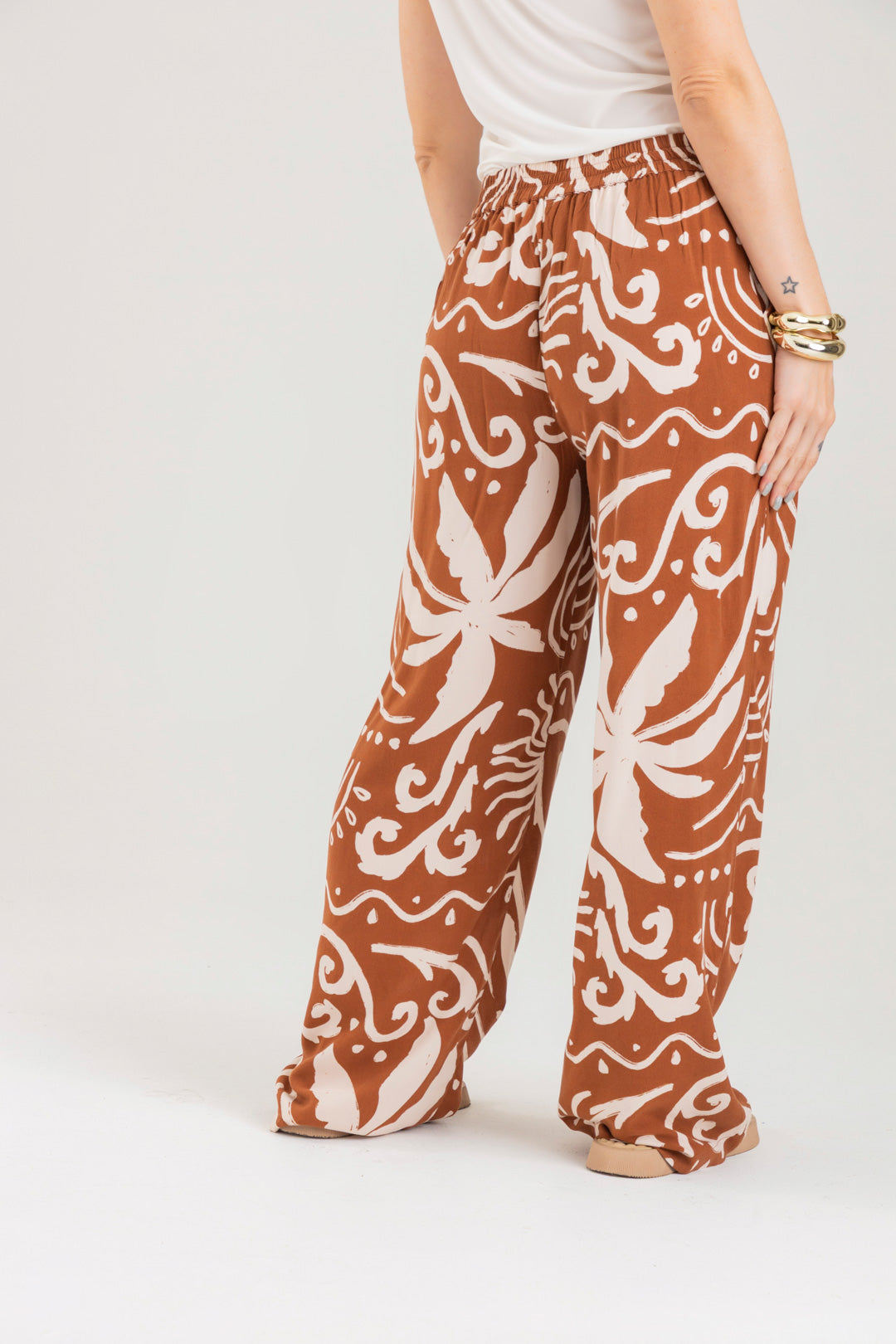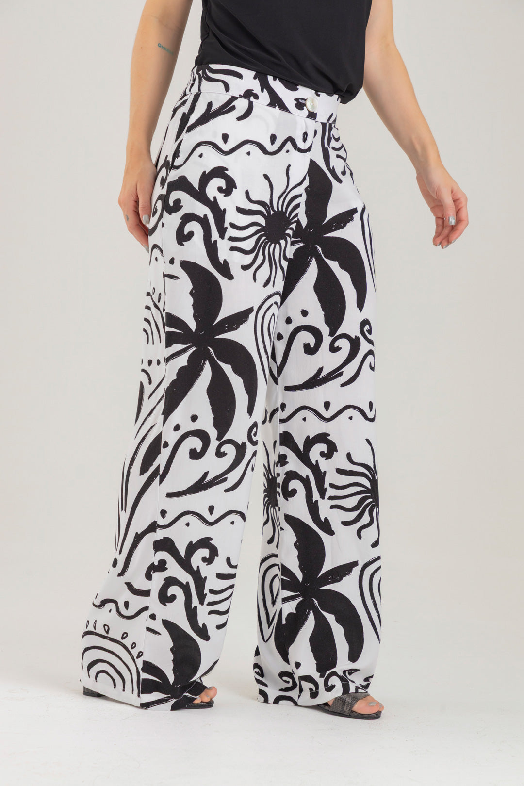 Pantalón silueta fluida con pretina y bolsillos diagonales en costado. Elaborado en Rayón estampado.