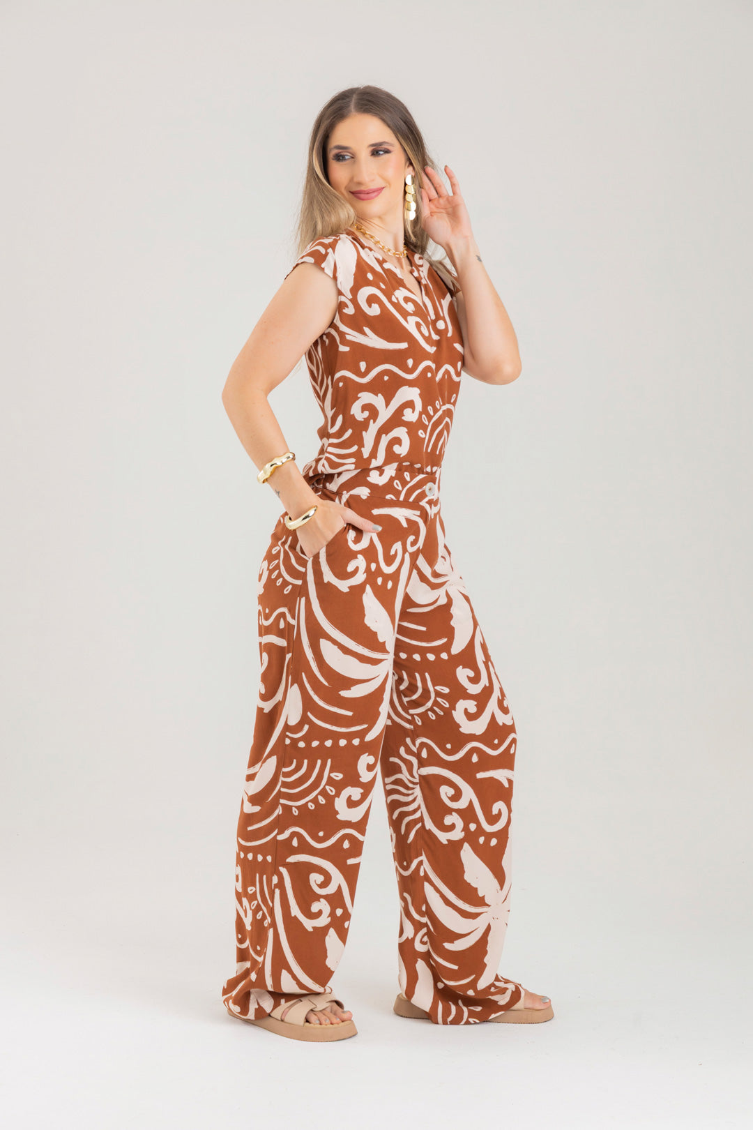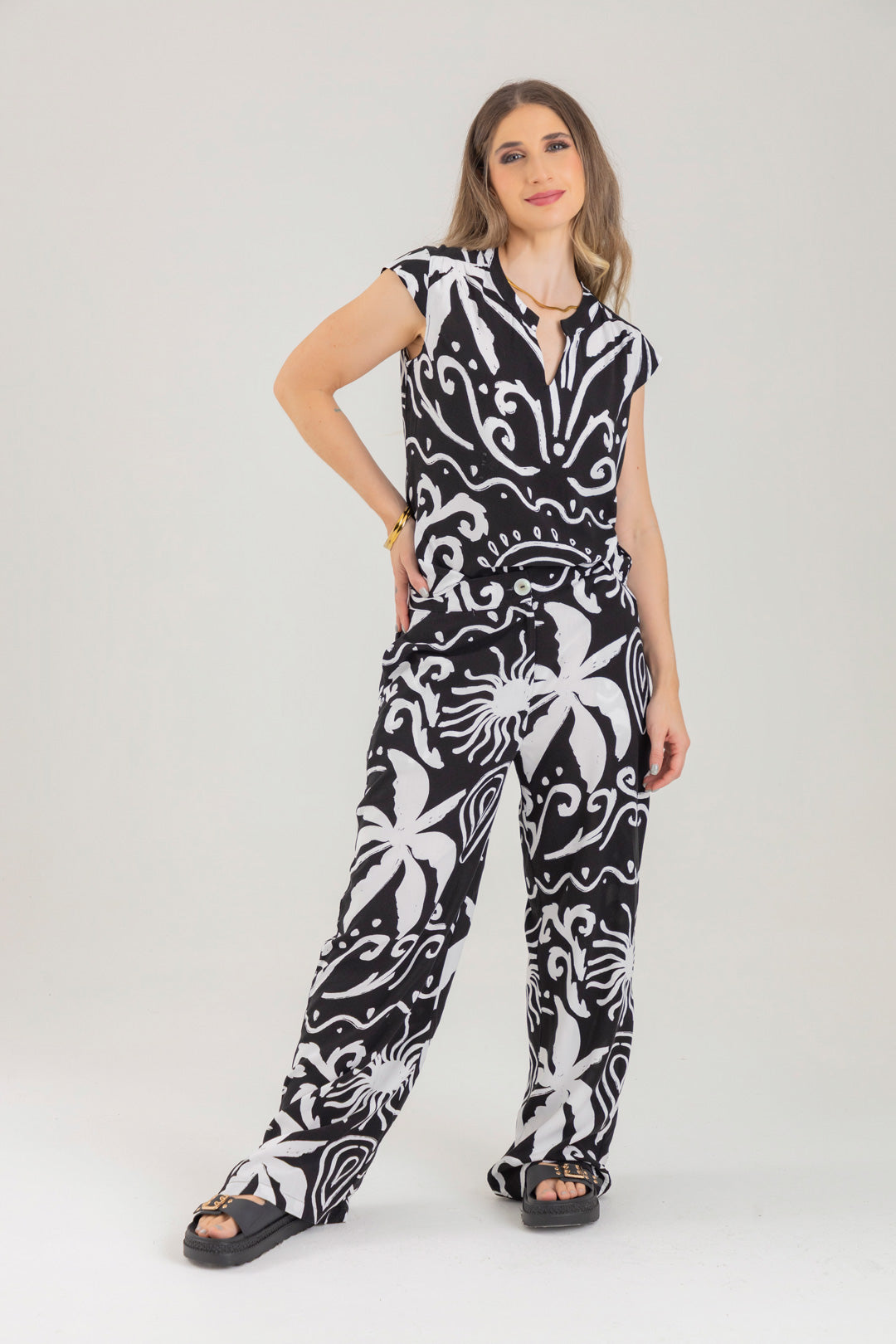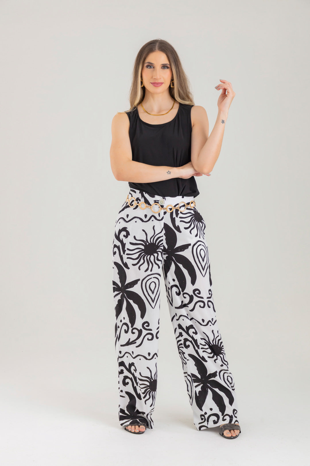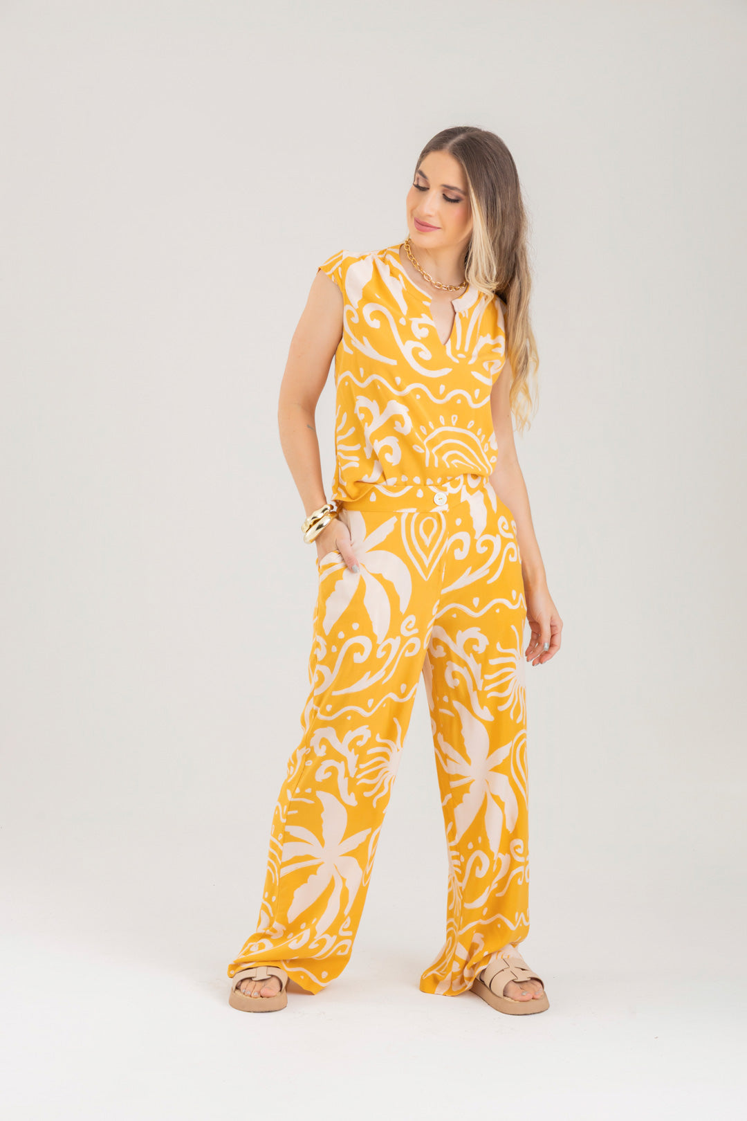 Pantalón silueta fluida con pretina y bolsillos diagonales en costado. Elaborado en Rayón estampado.