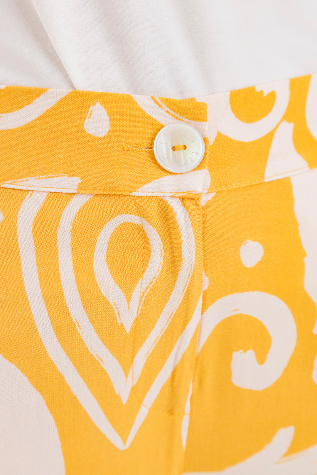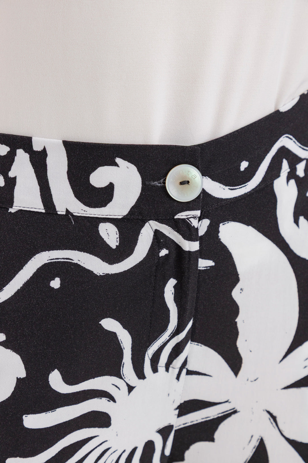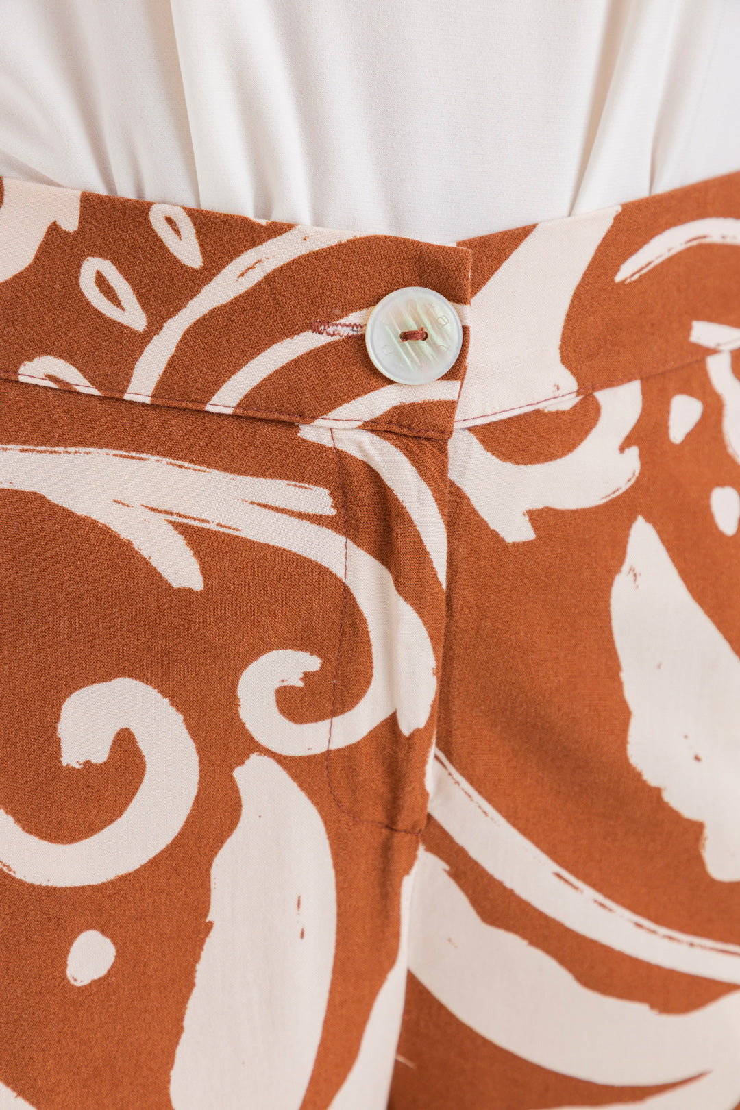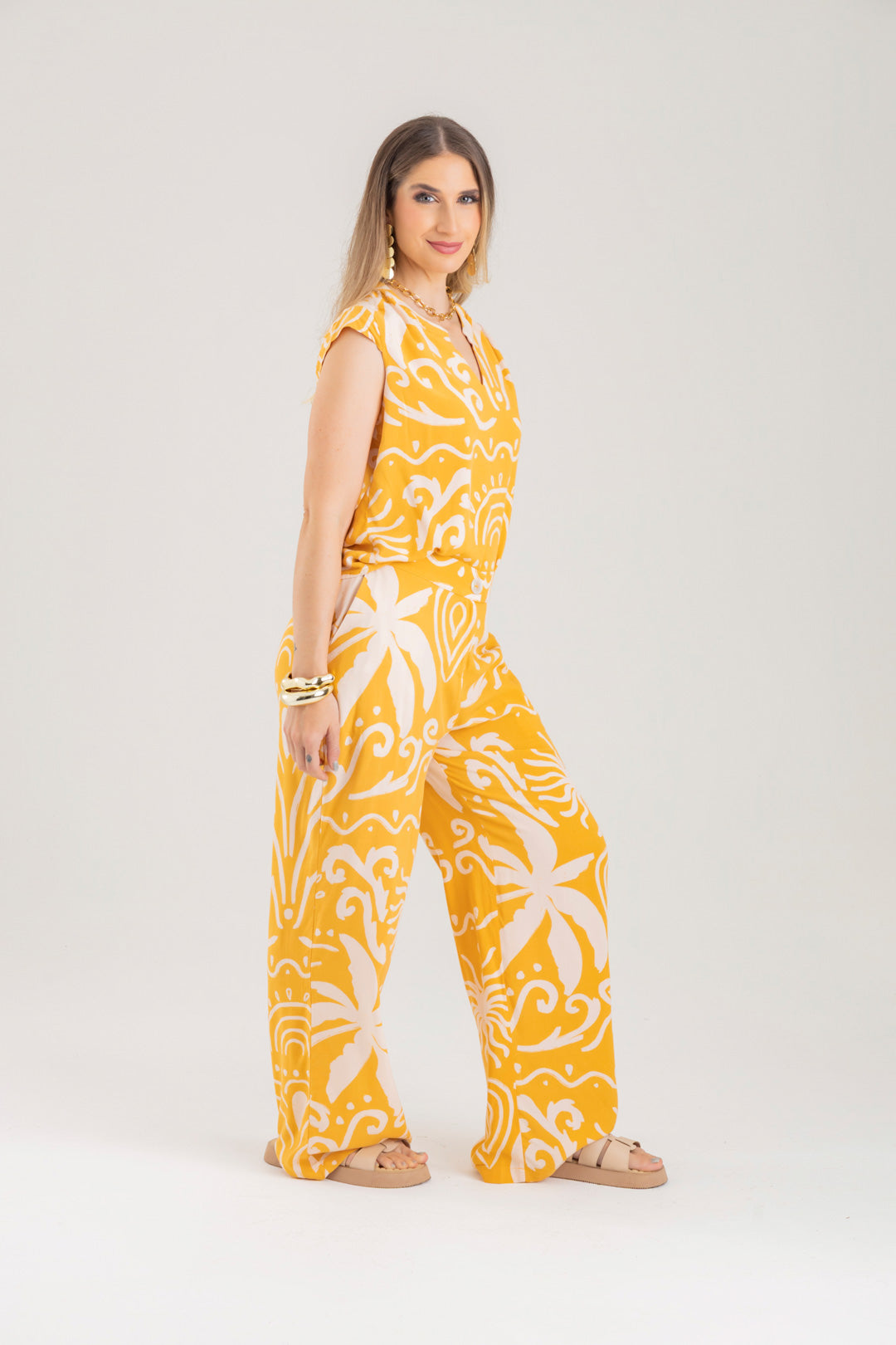 Pantalón silueta fluida con pretina y bolsillos diagonales en costado. Elaborado en Rayón estampado.