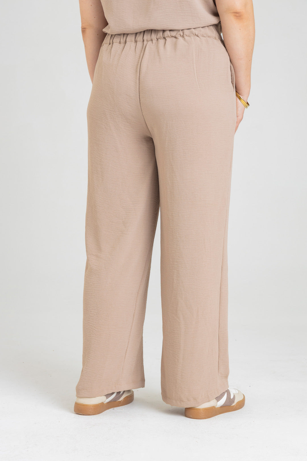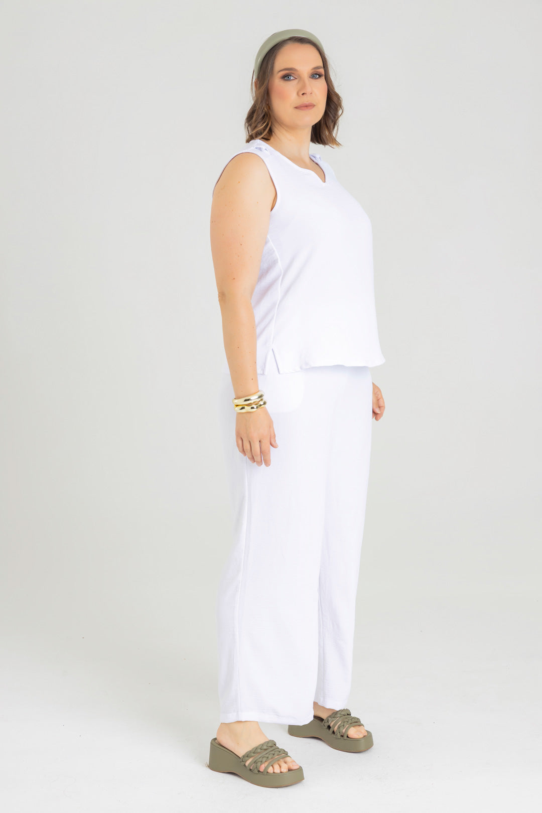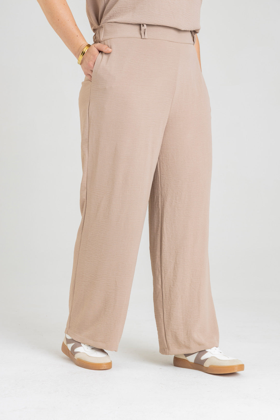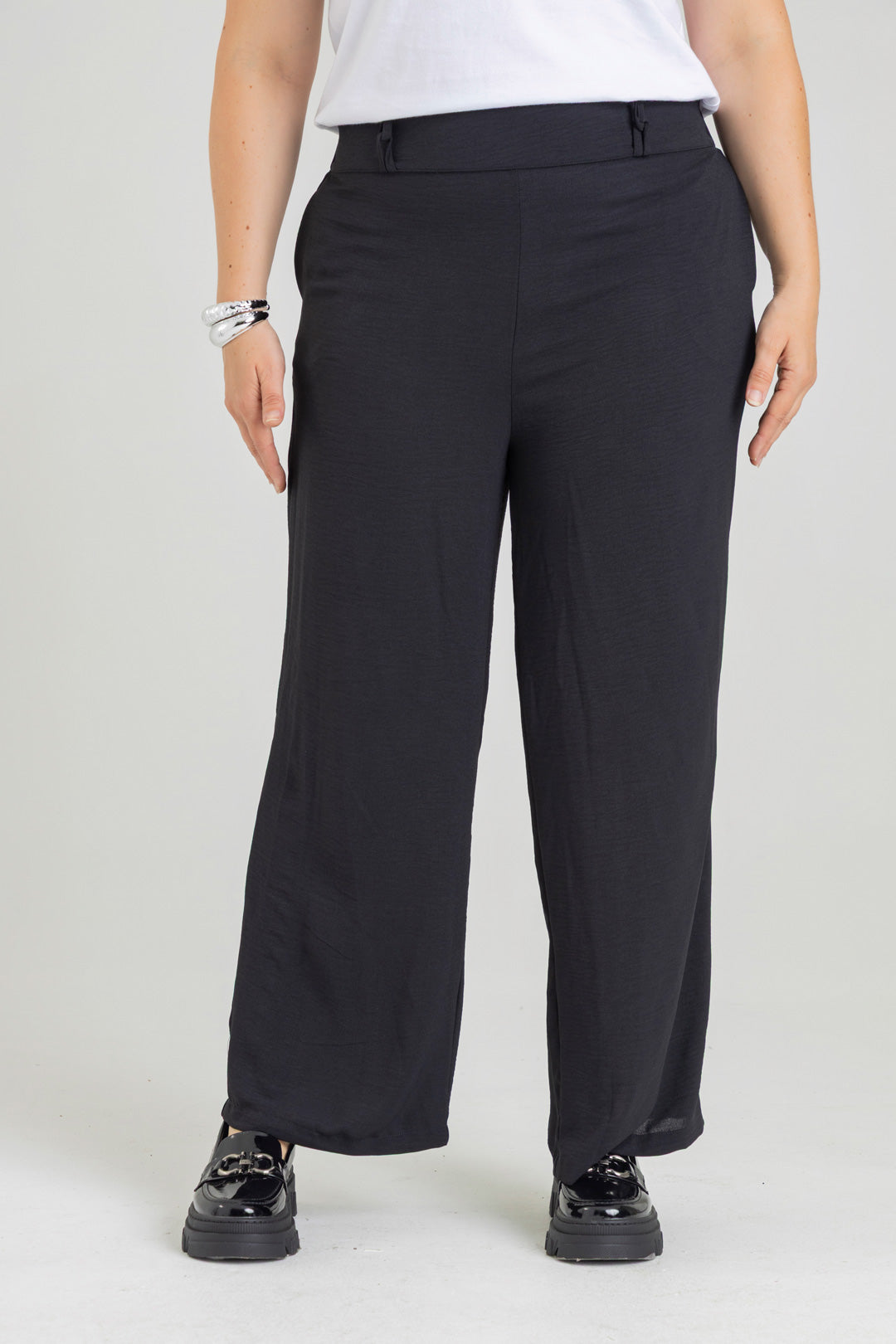 Pantalón silueta fluida con detalle de pasadores en pretina delantera y elástico en posterior. Elaborado en Poliester fondo entero.