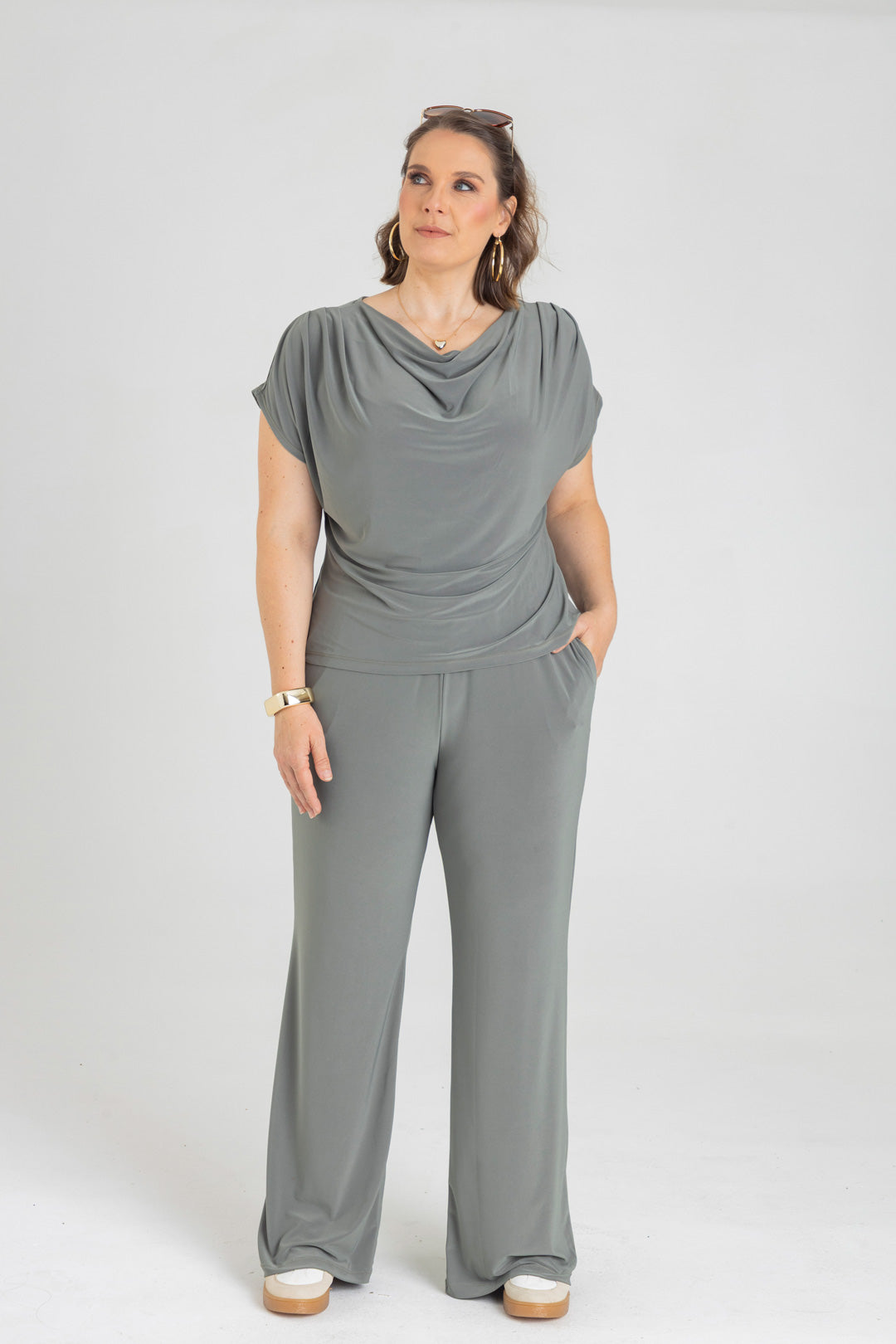 Nuestra modelo mide 1.74 y está usando talla 14.