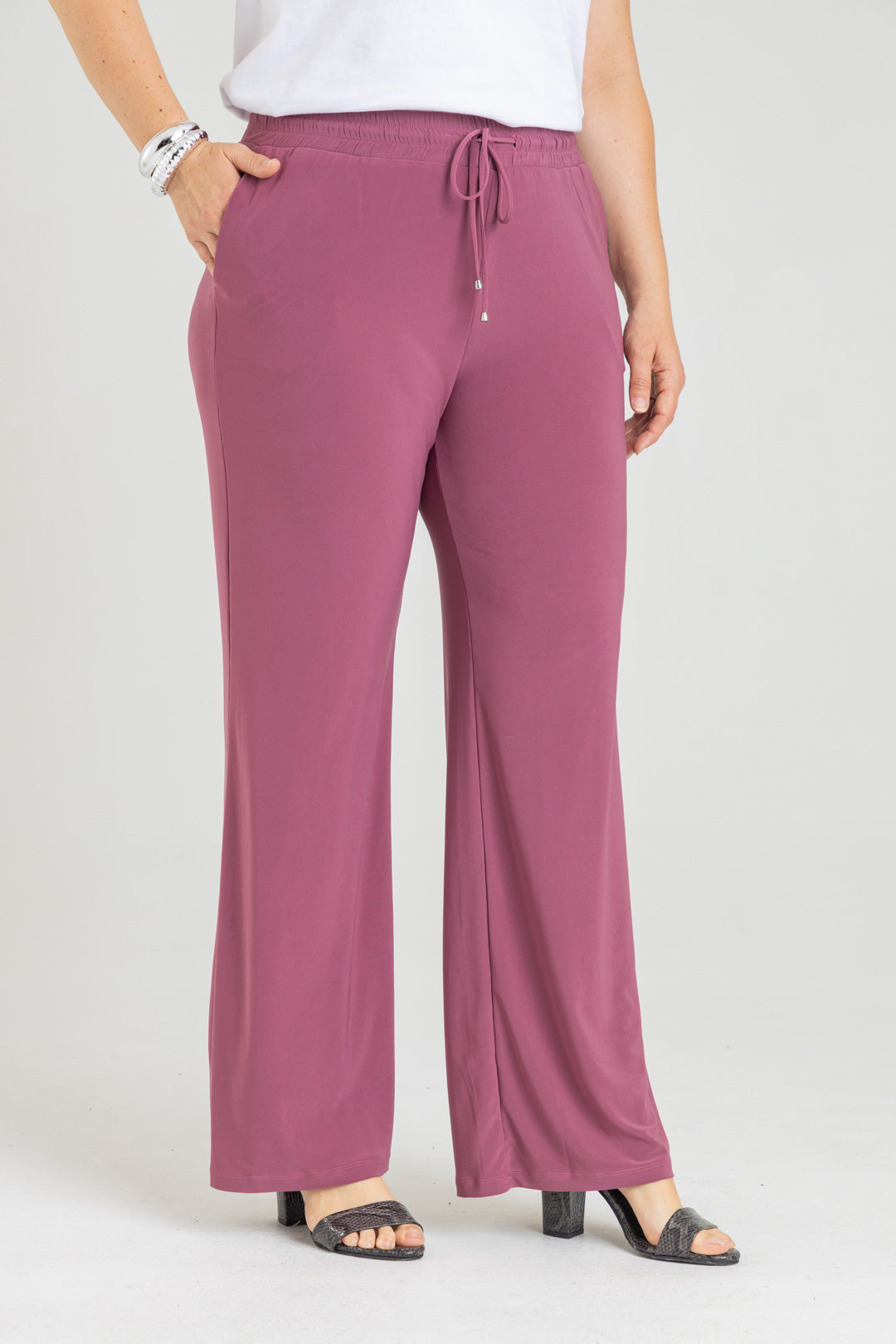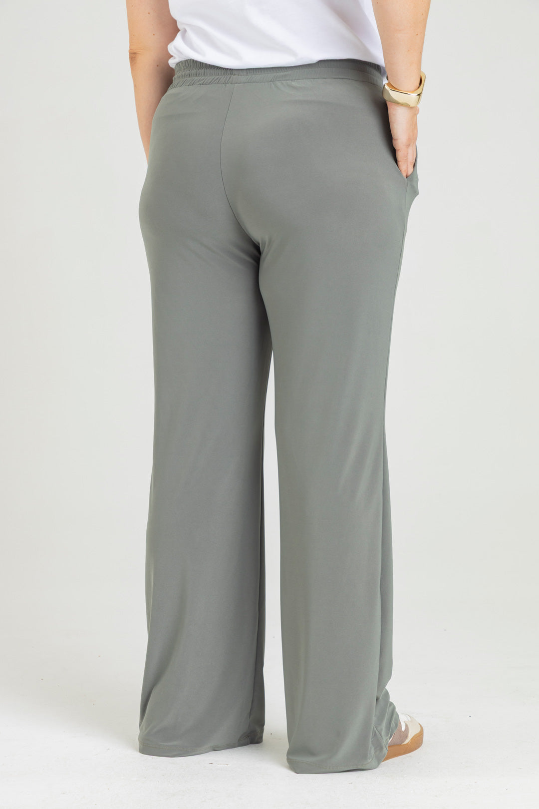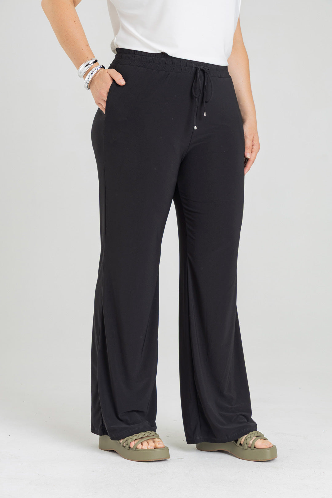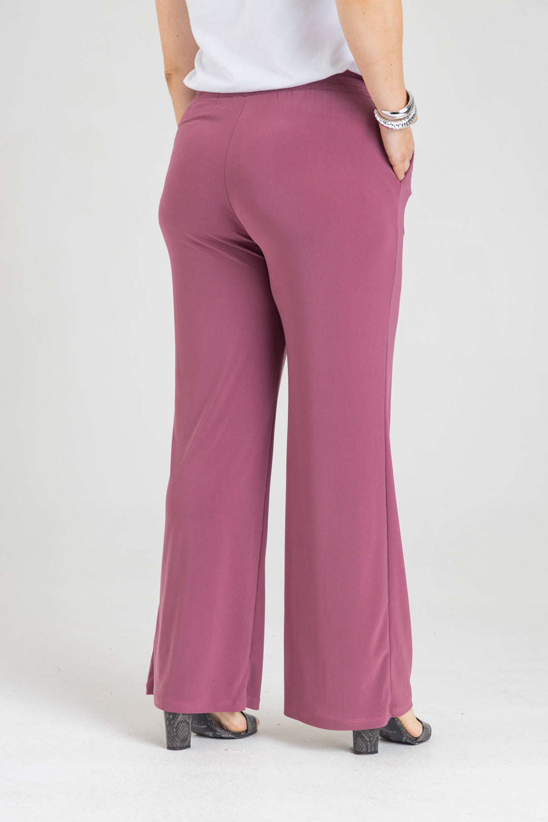 Pantalón silueta recta con bolsillos y pretina con elástico. Elaborado en Acetato fondo entero.