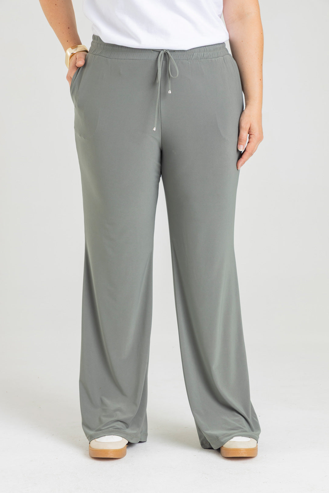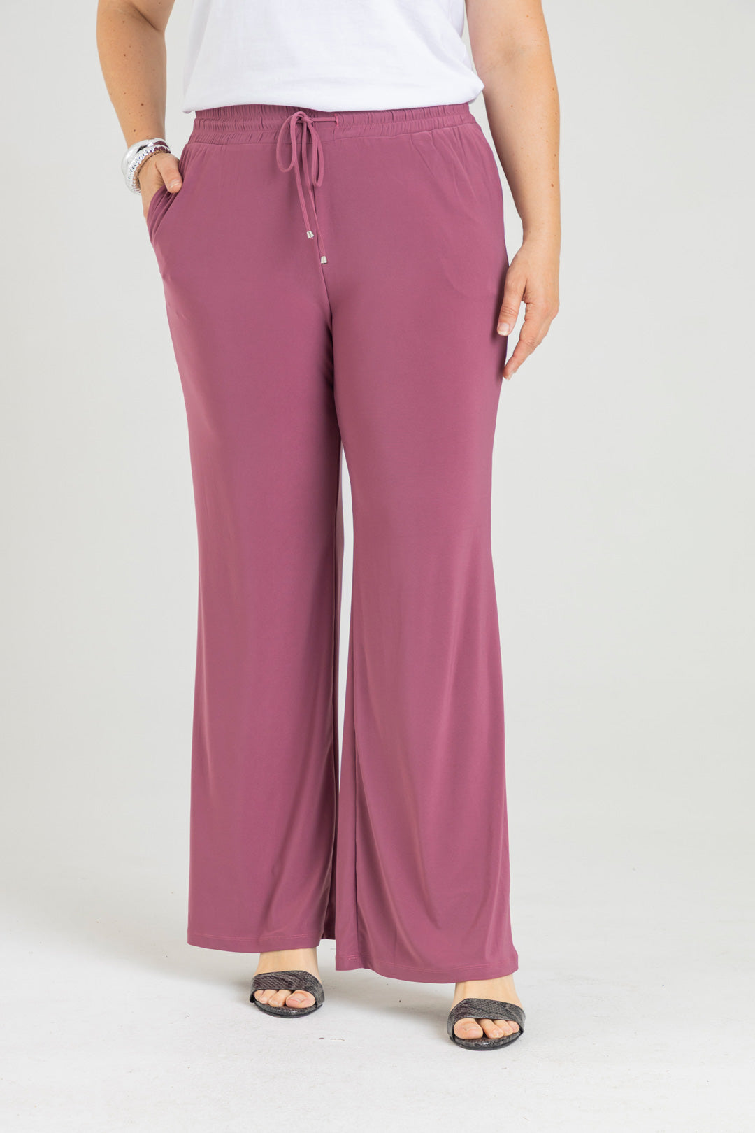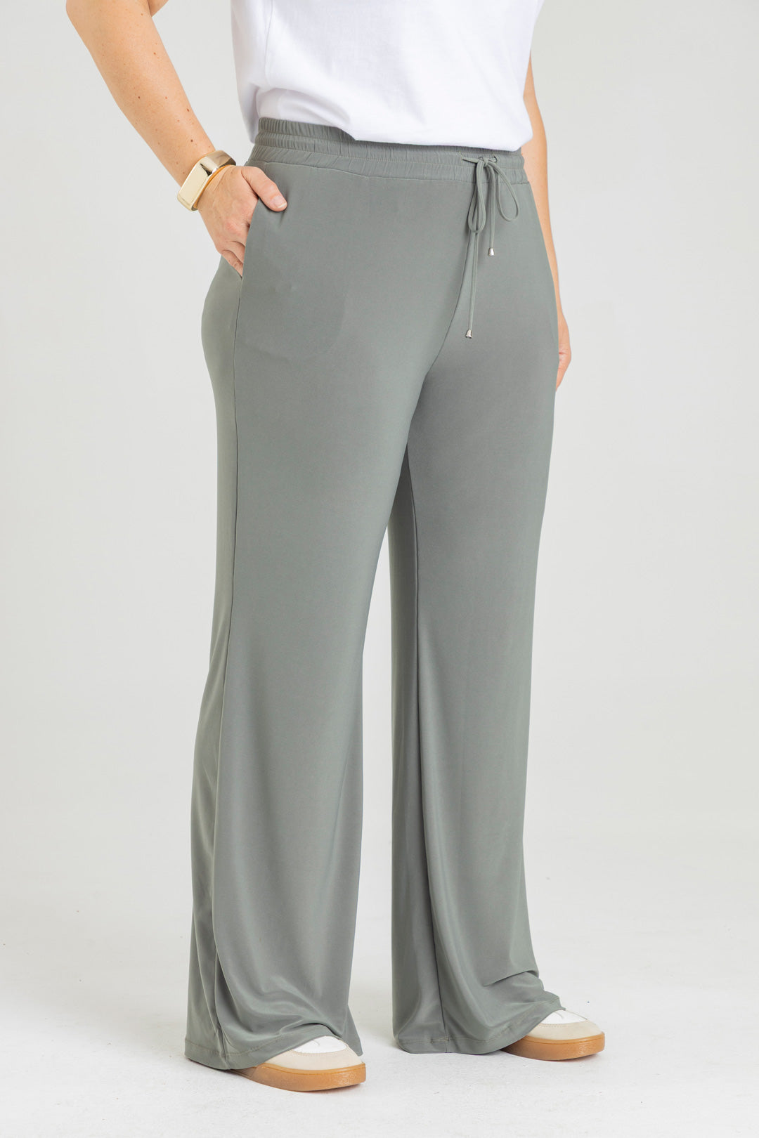 Pantalón silueta recta con bolsillos y pretina con elástico. Elaborado en Acetato fondo entero.