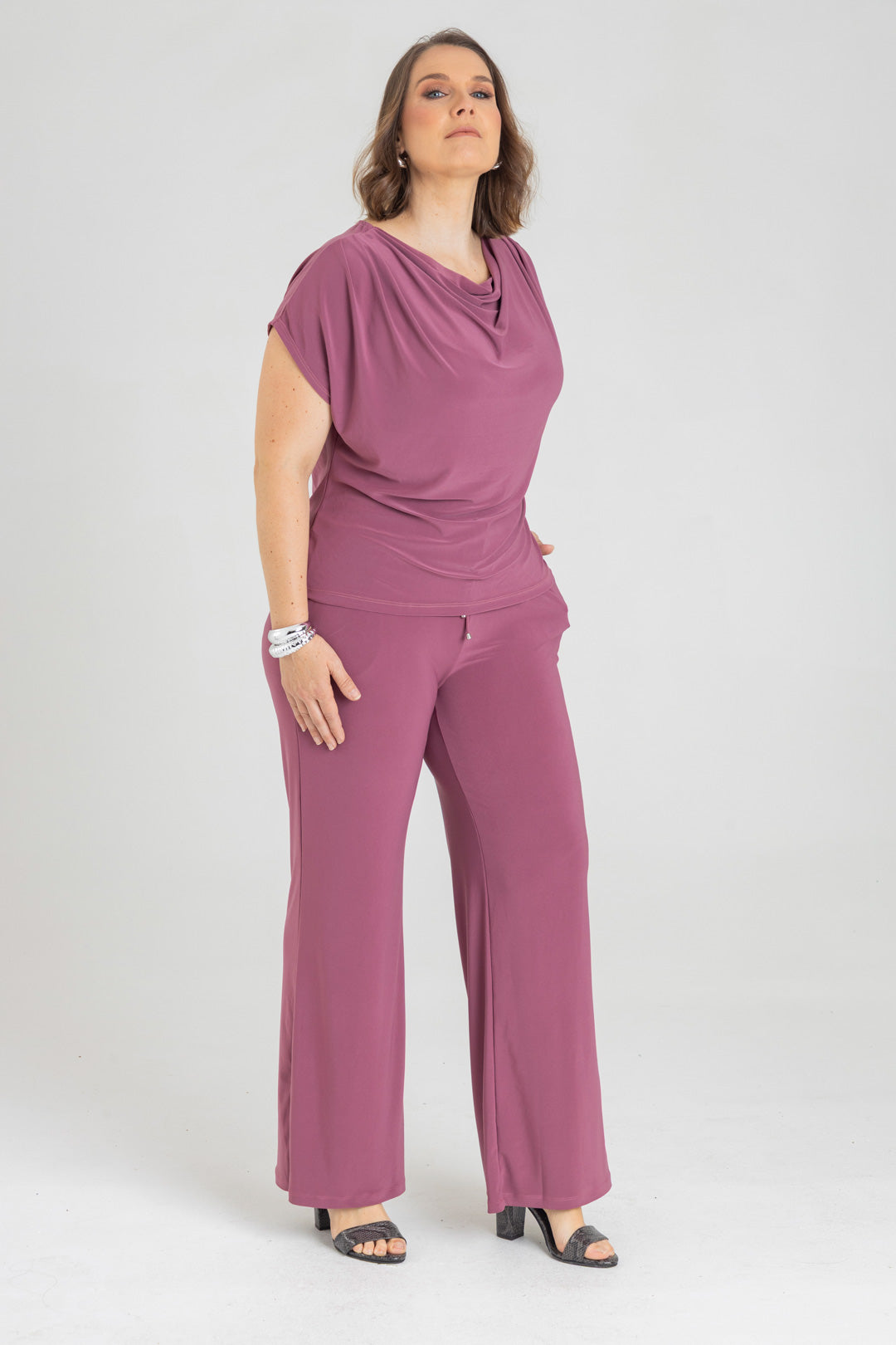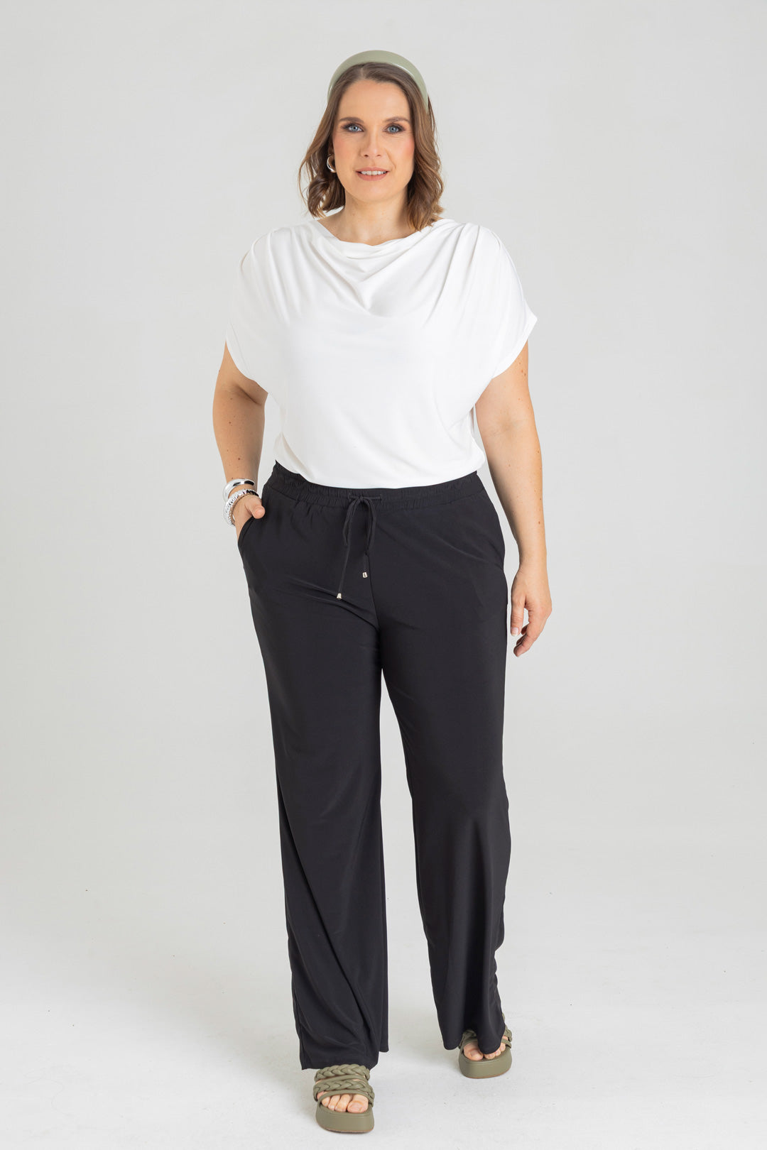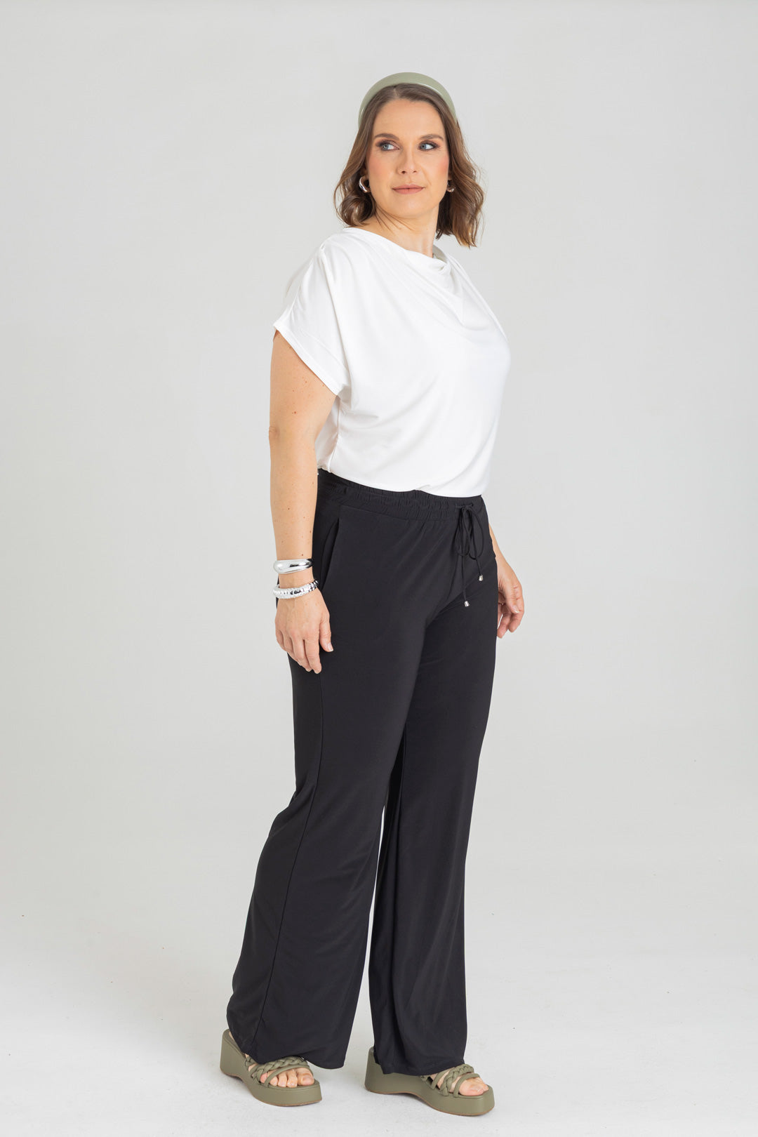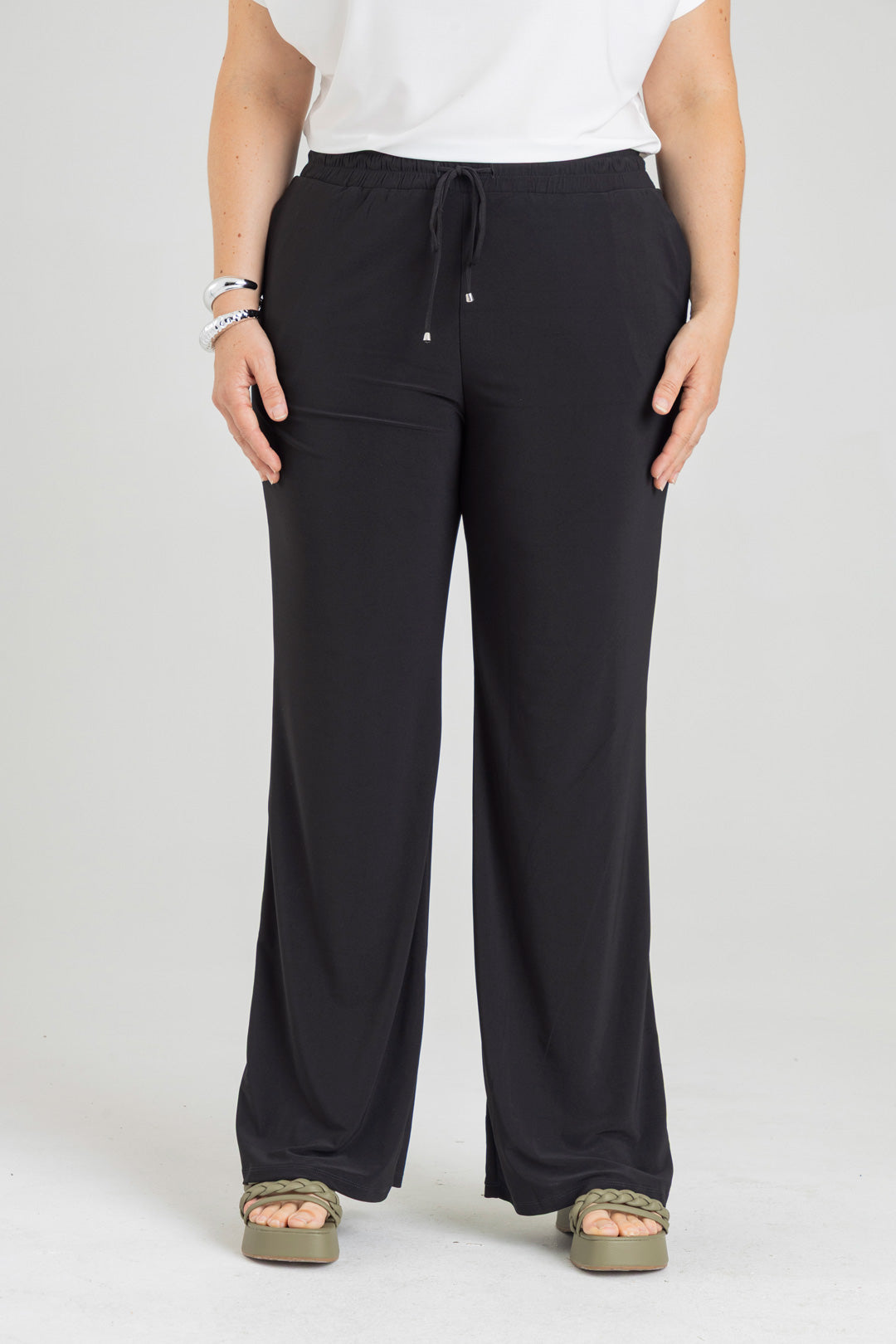 Pantalón silueta recta con bolsillos y pretina con elástico. Elaborado en Acetato fondo entero.