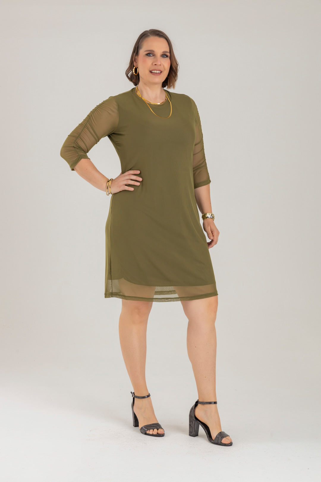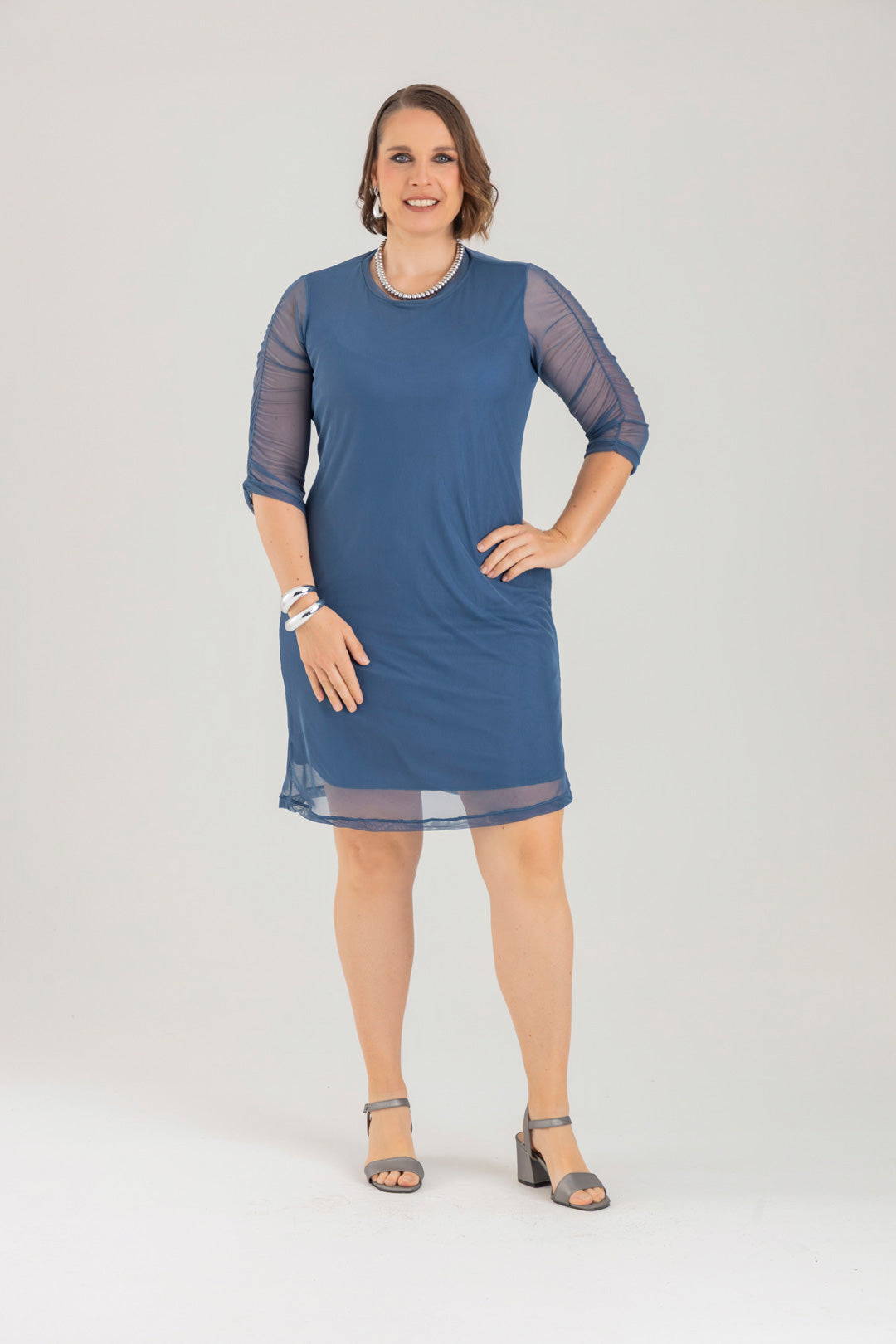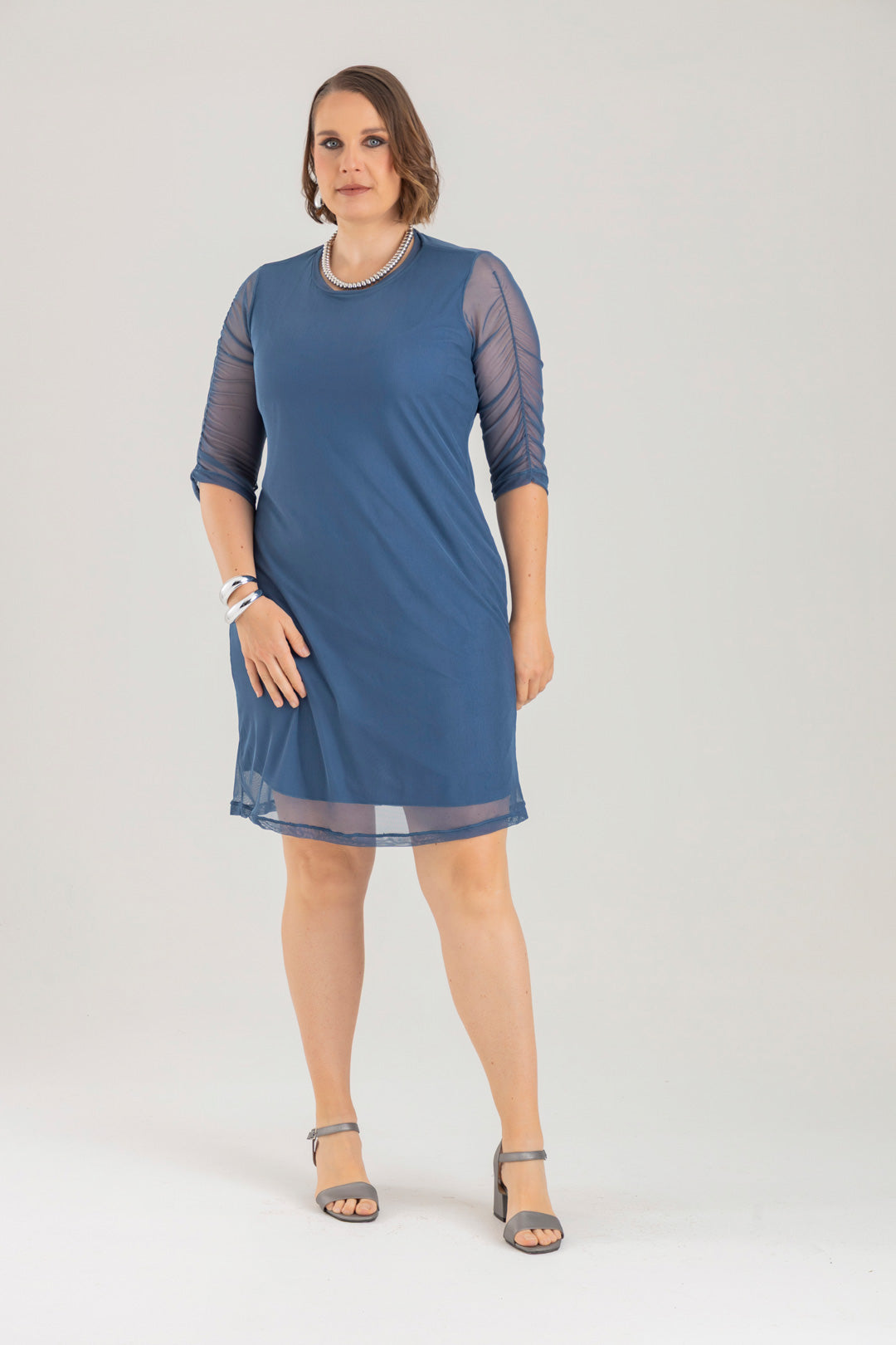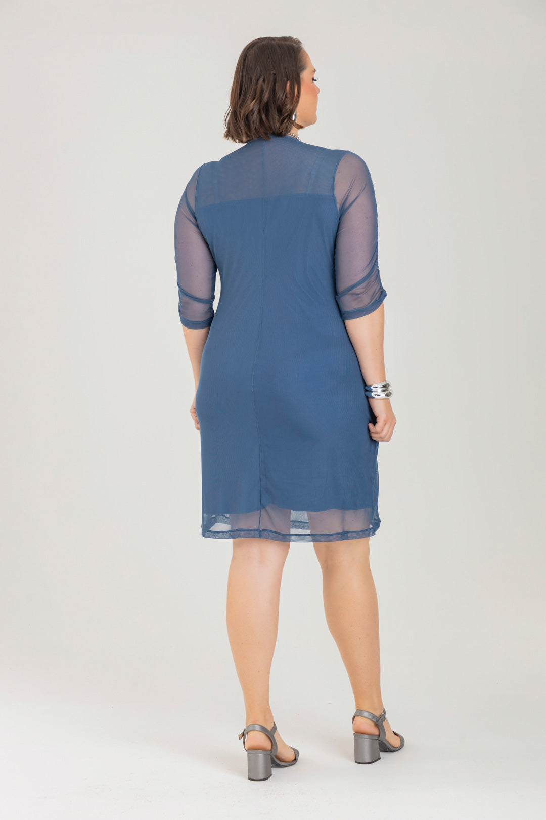 Vestido corto con cuello redondo y manga 3/4. Elaborado en Mallatex fondo entero.