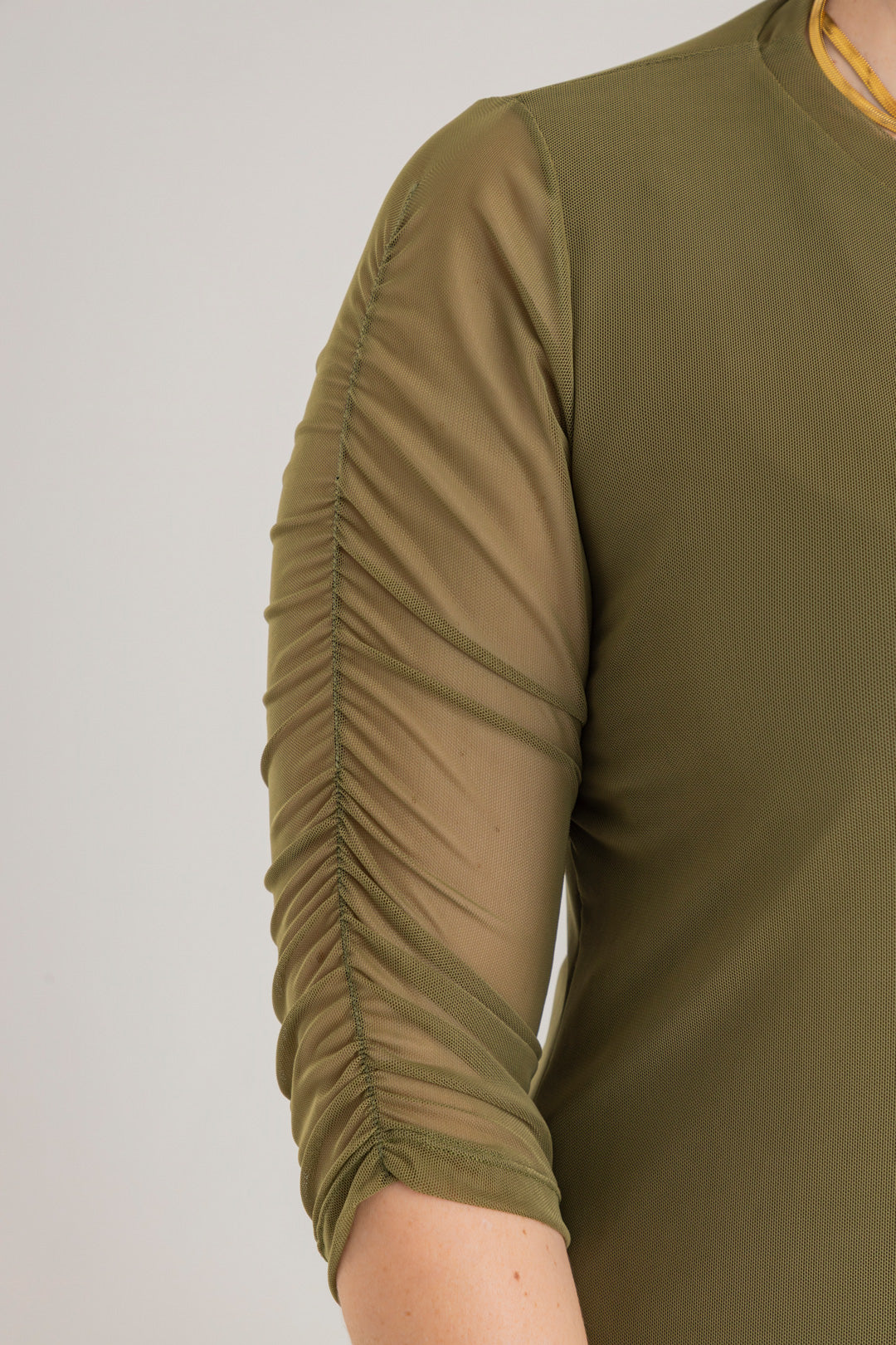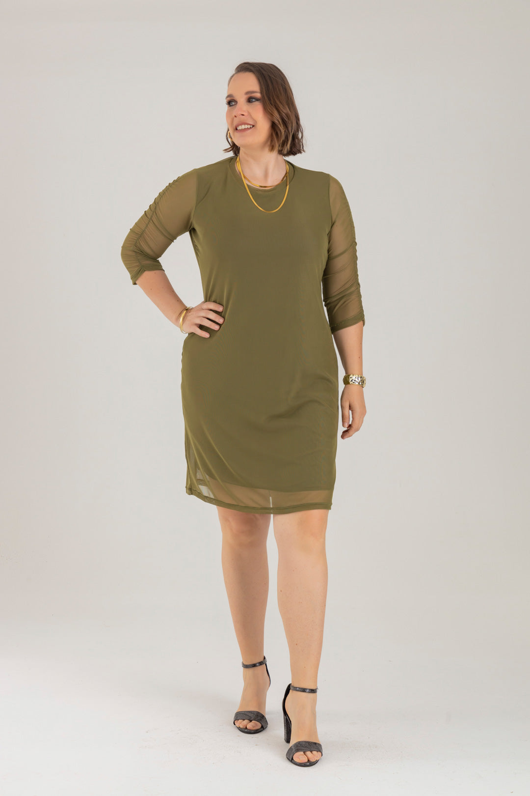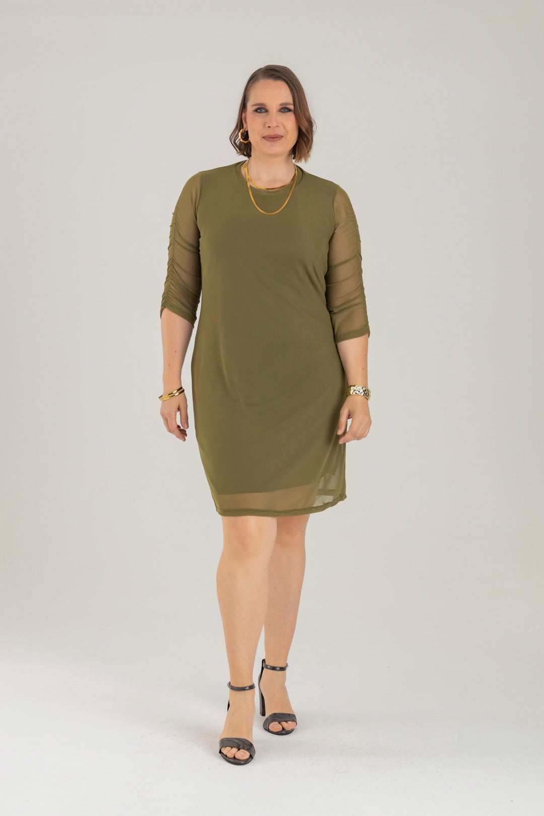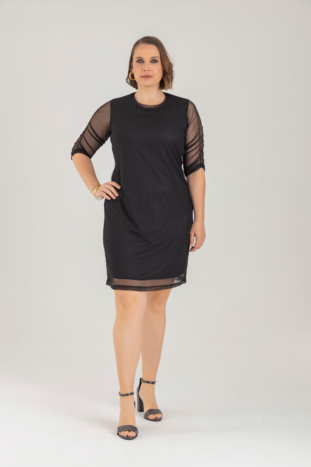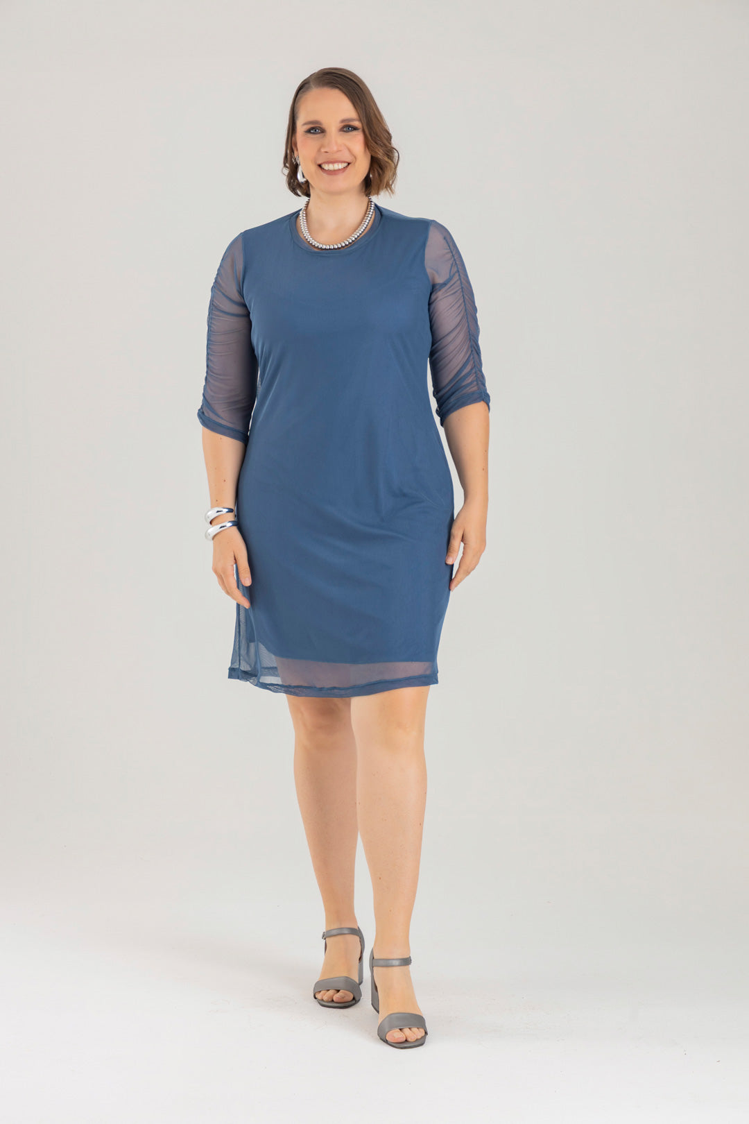 Vestido corto con cuello redondo y manga 3/4. Elaborado en Mallatex fondo entero.
