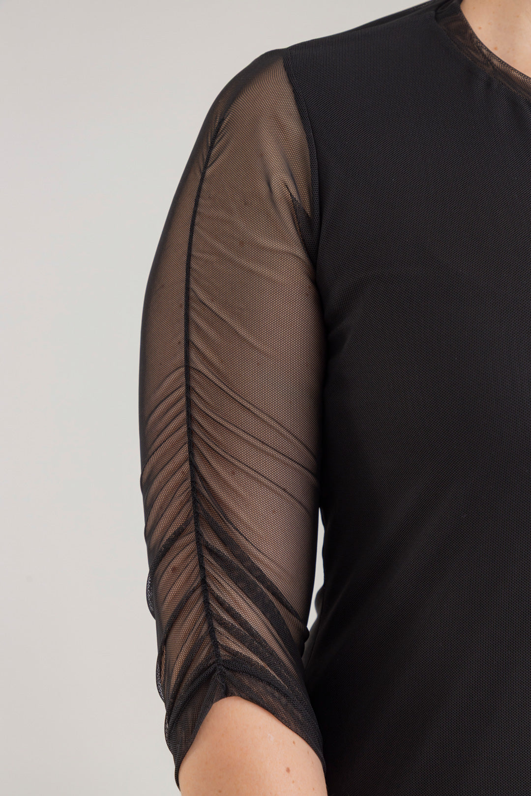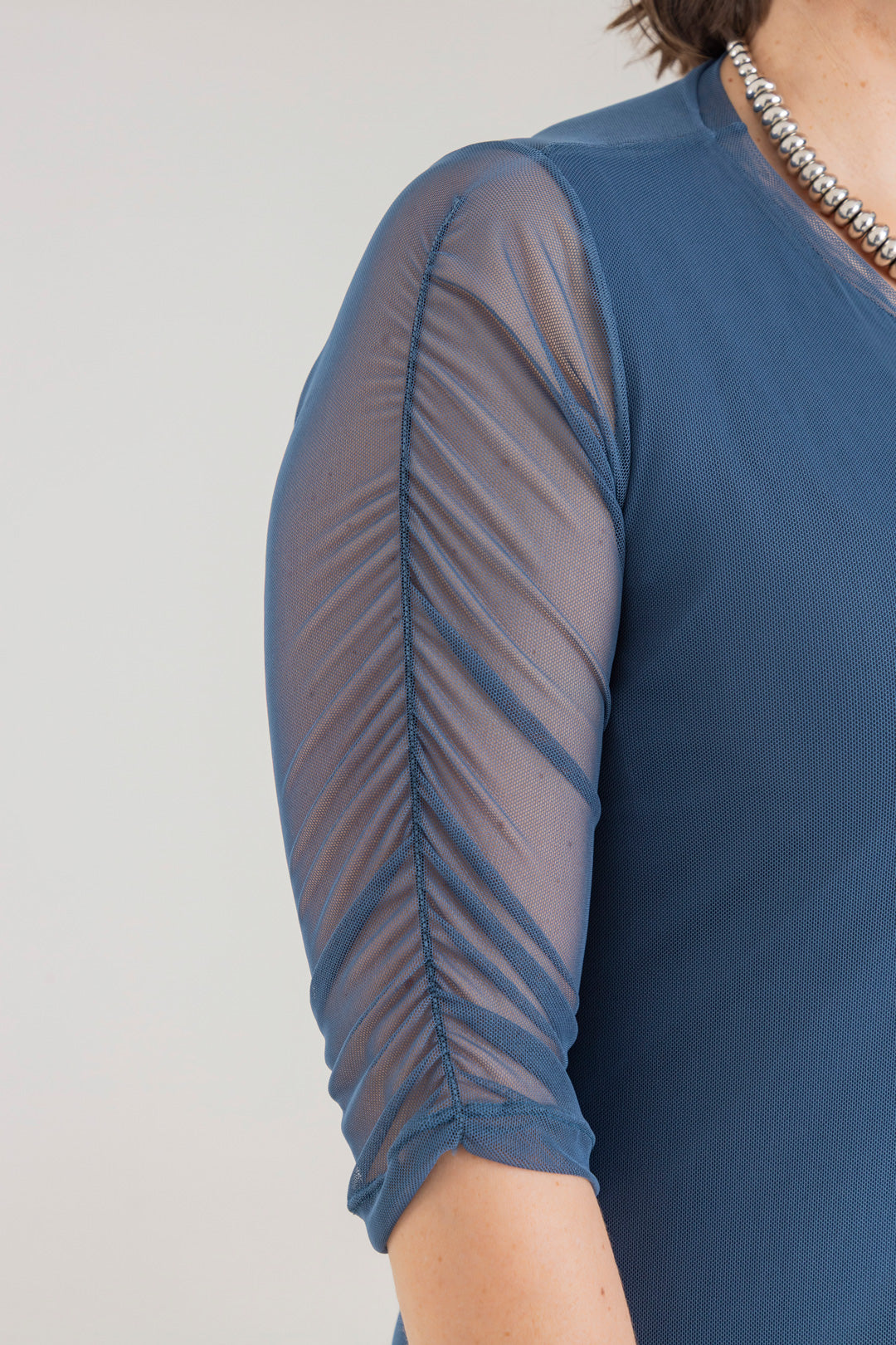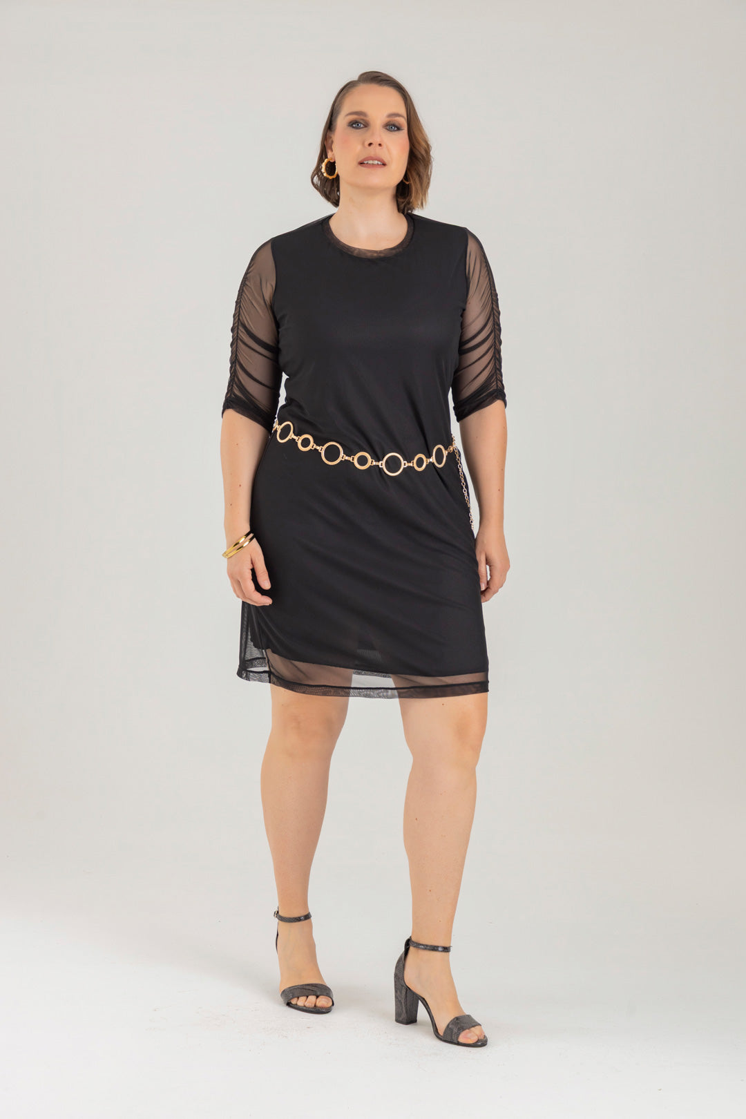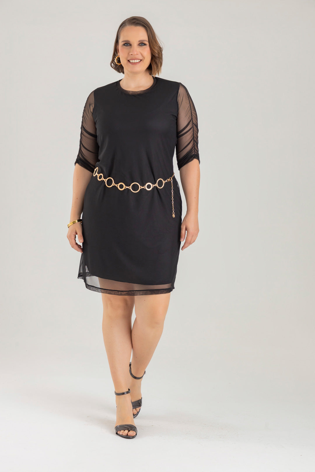 Vestido corto con cuello redondo y manga 3/4. Elaborado en Mallatex fondo entero.