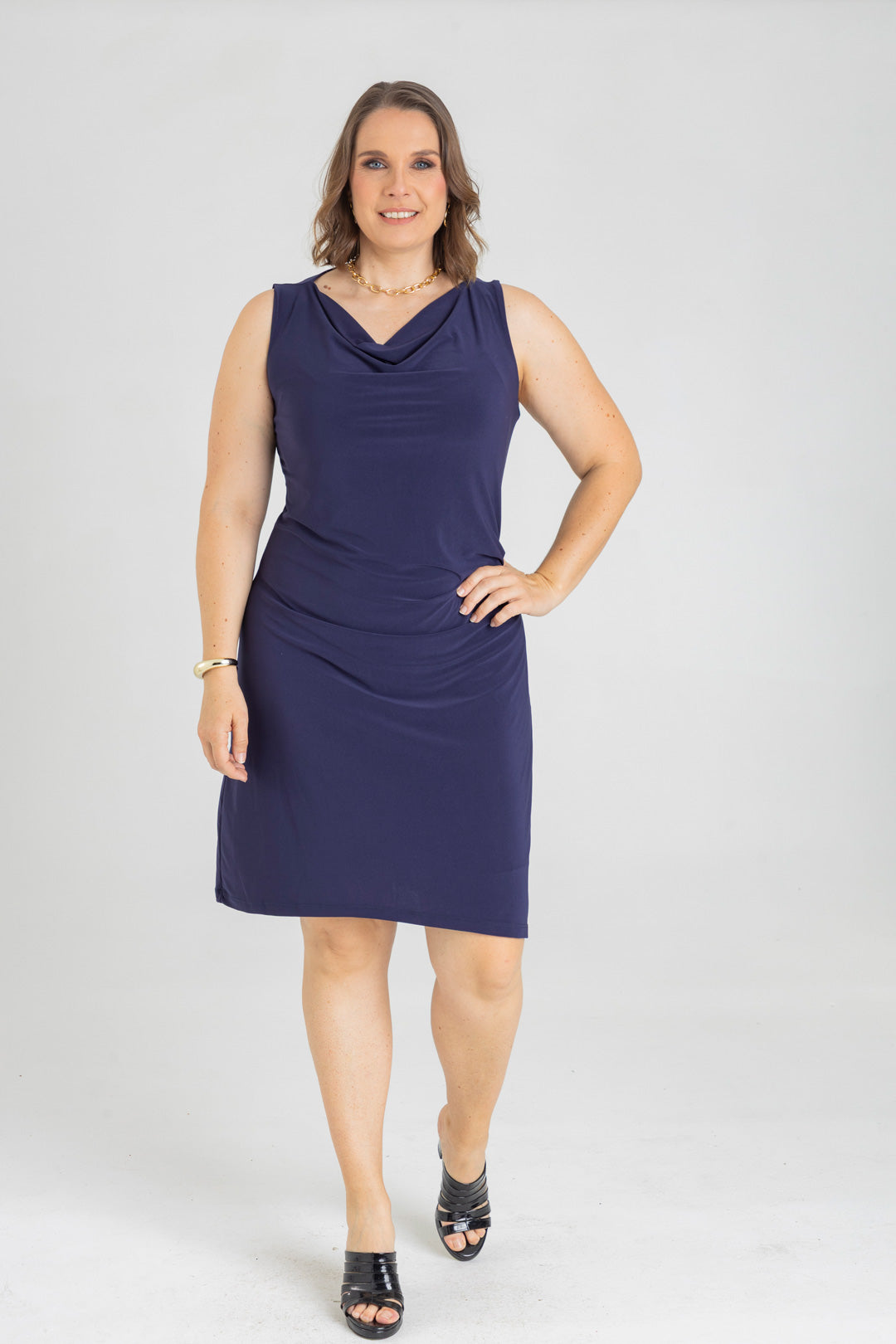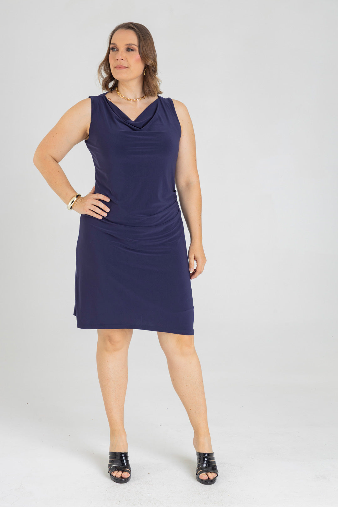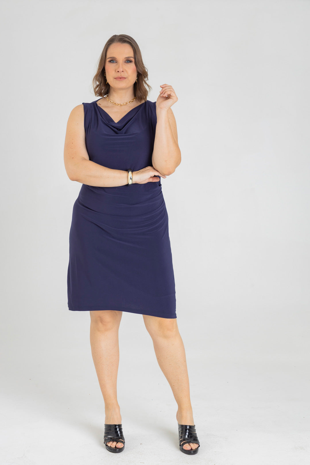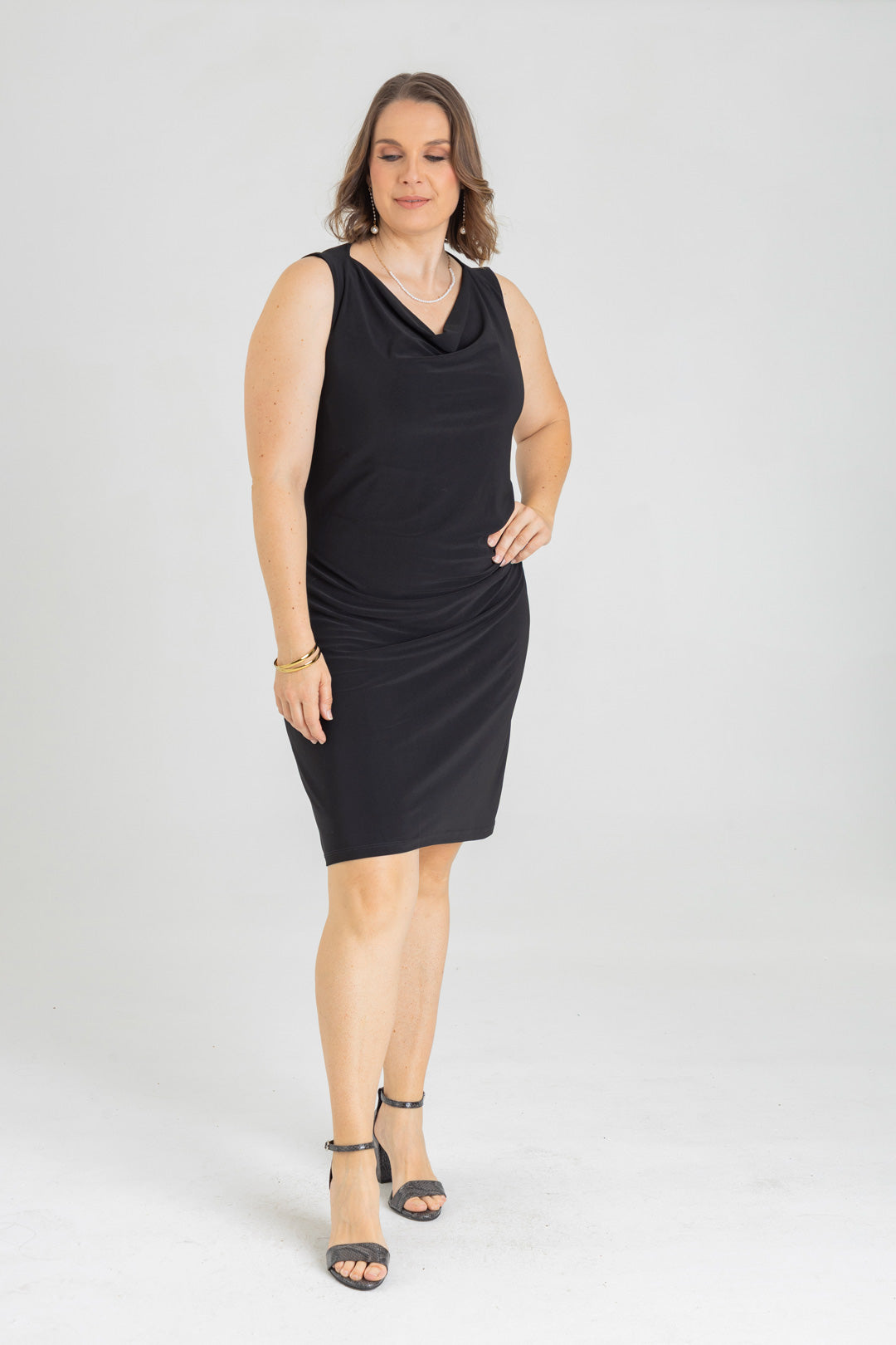 Vestido corto con escote drapeado y recogido en un costado de cintura. Elaborado en Acetato fondo entero.
