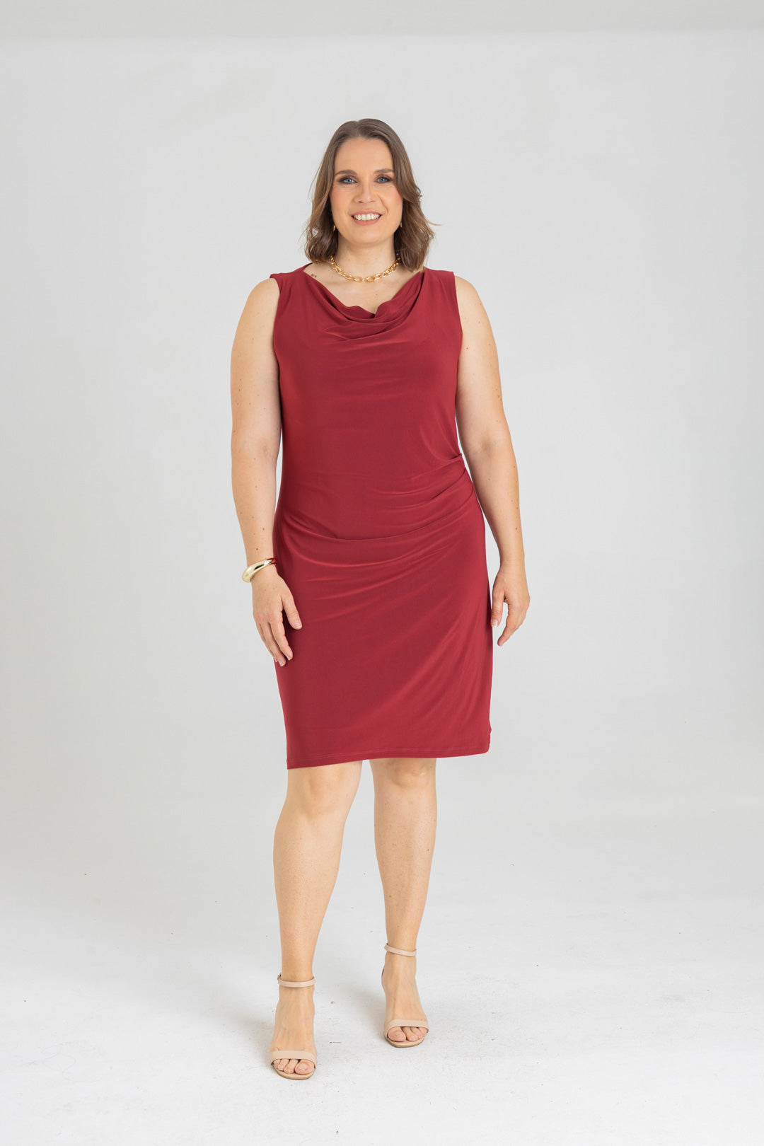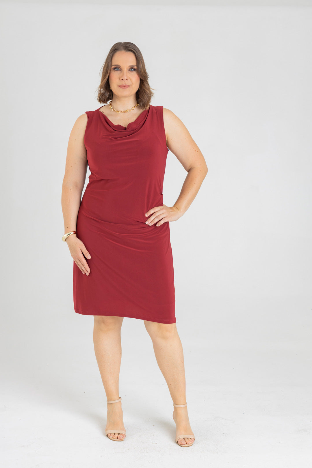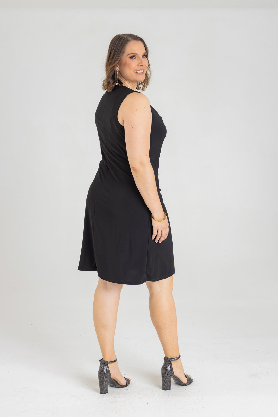Vestido corto con escote drapeado y recogido en un costado de cintura. Elaborado en Acetato fondo entero.