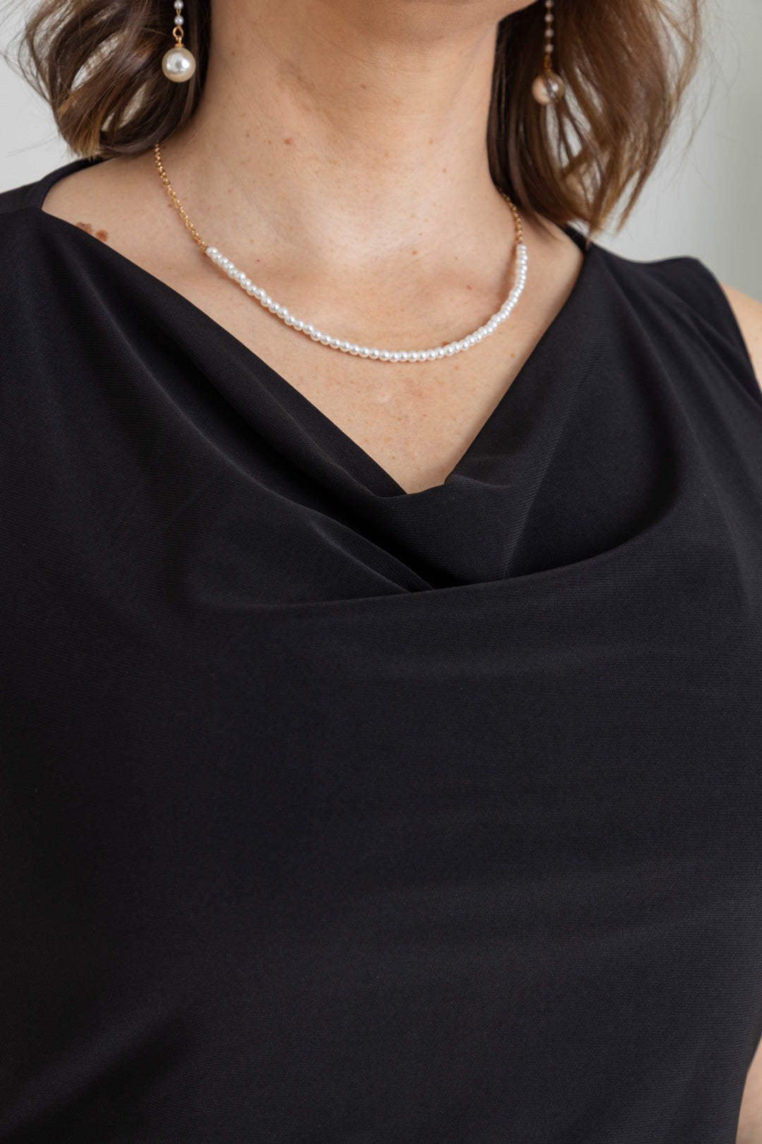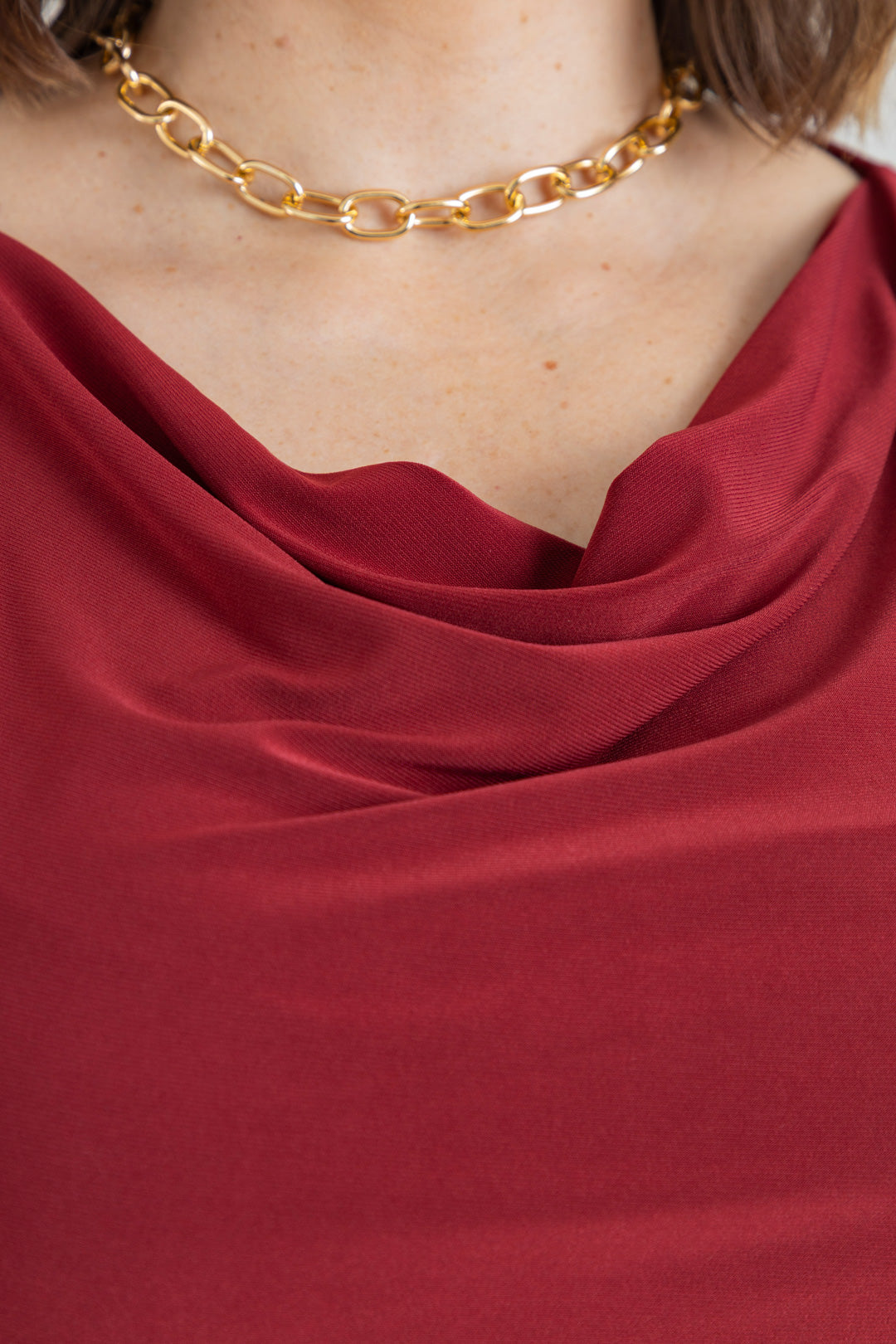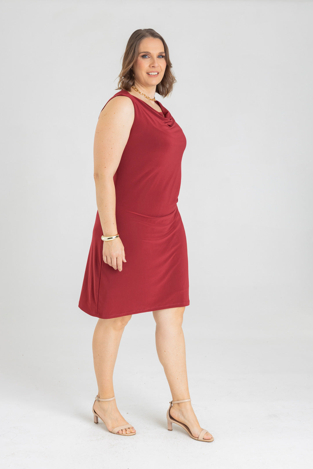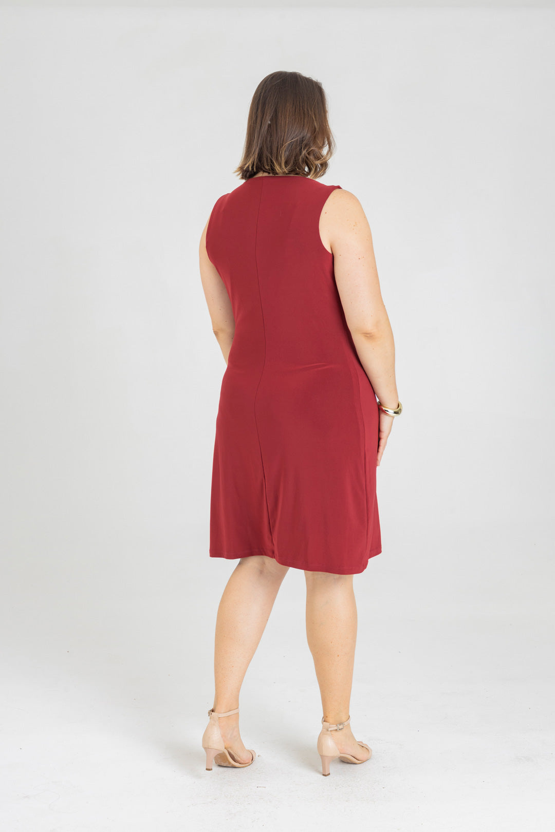 Vestido corto con escote drapeado y recogido en un costado de cintura. Elaborado en Acetato fondo entero.