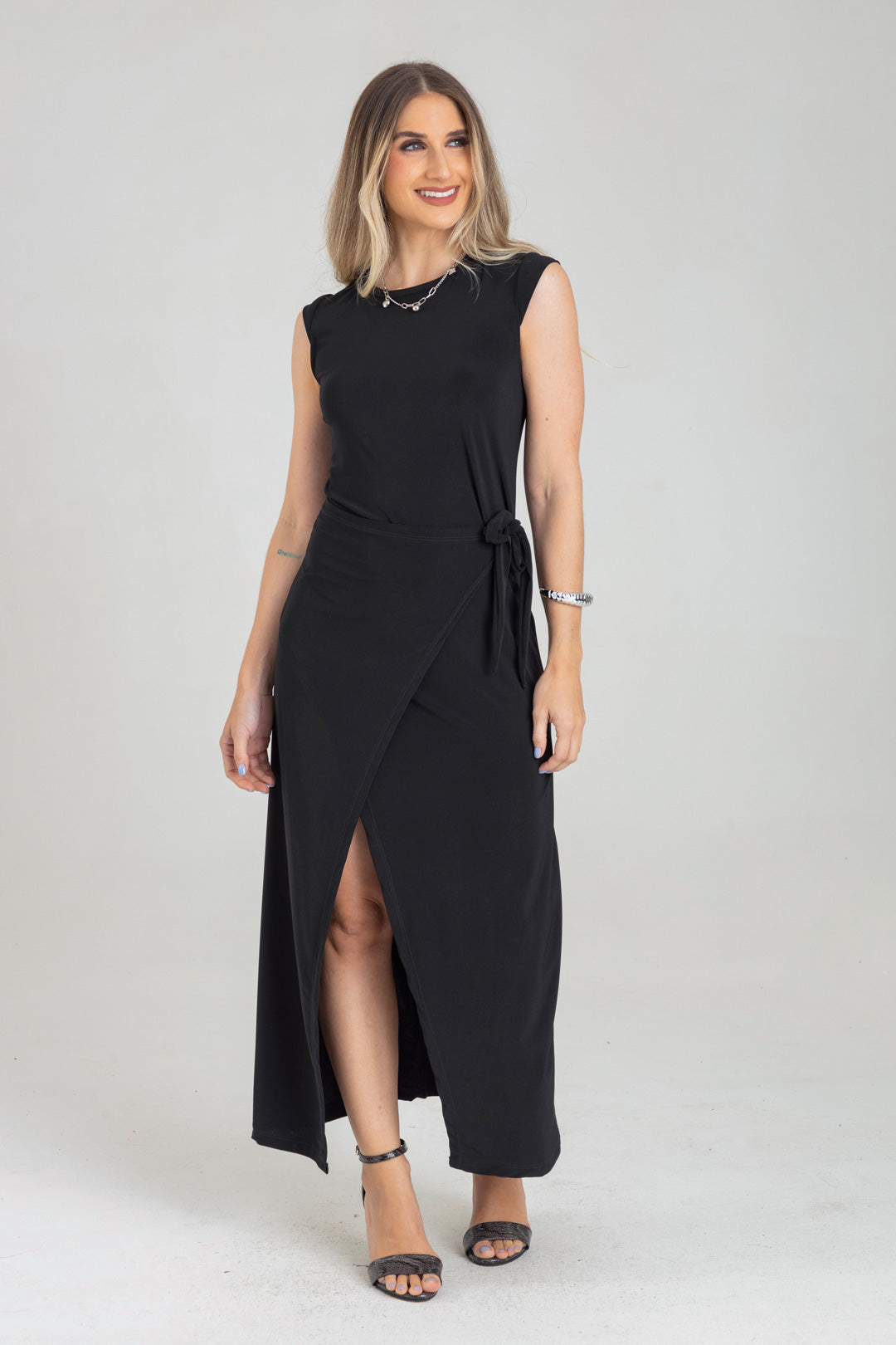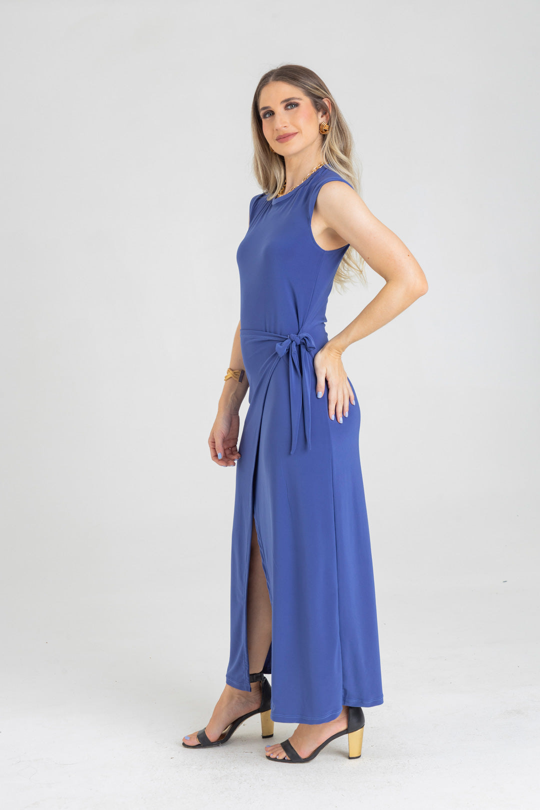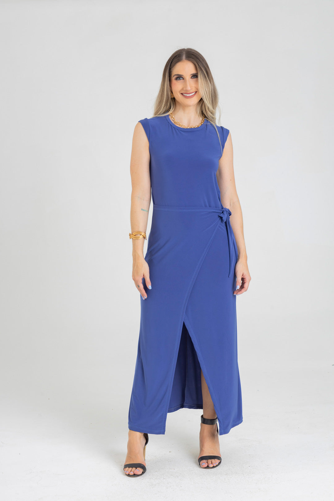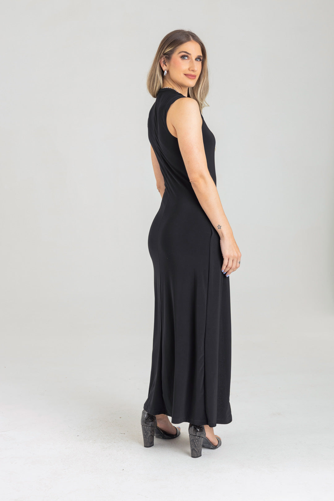 Vestido largo cuello redondo, manga "casquito" y detalle de sobrepuesto en parte inferior. Elaborado en Acetato fondo entero.