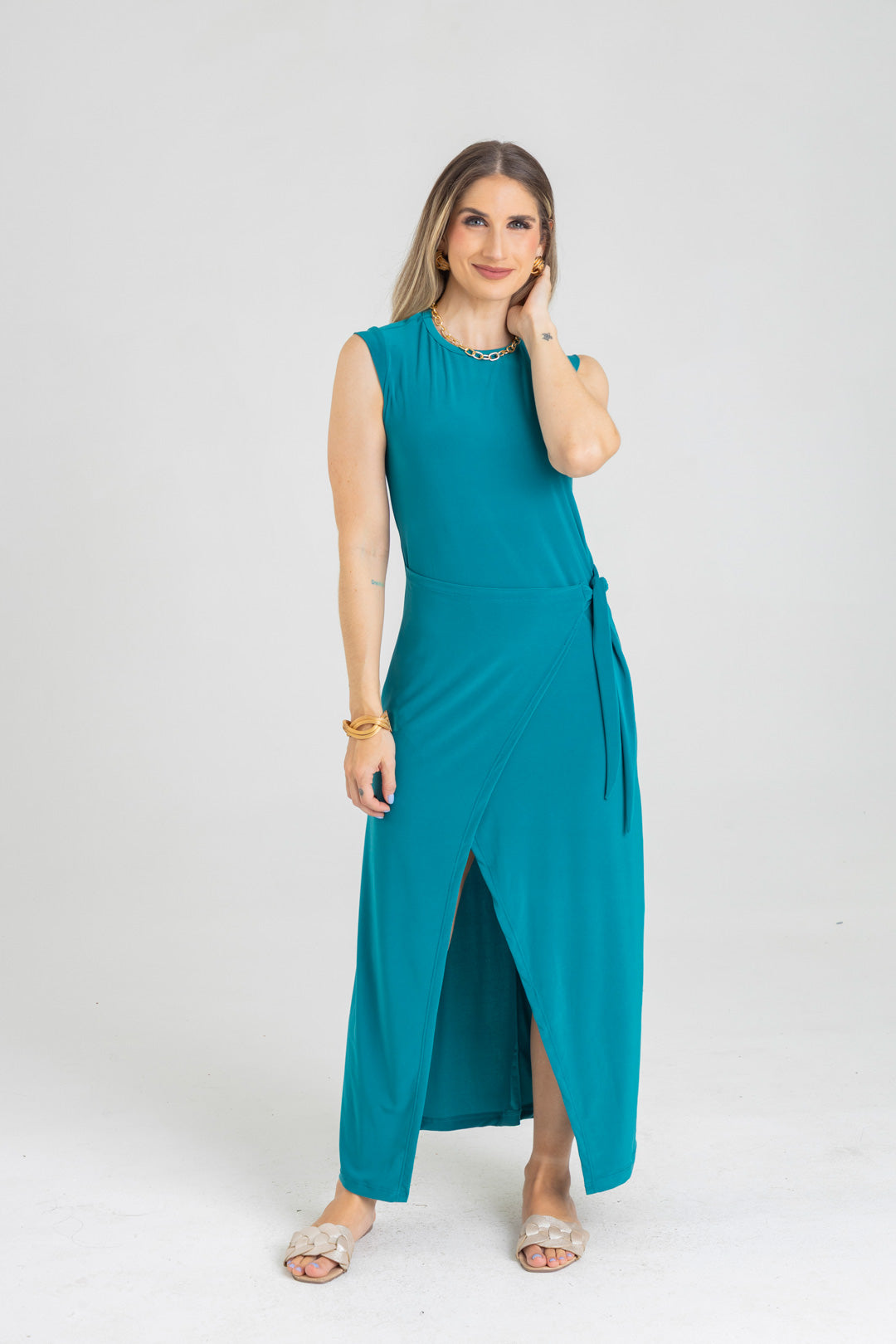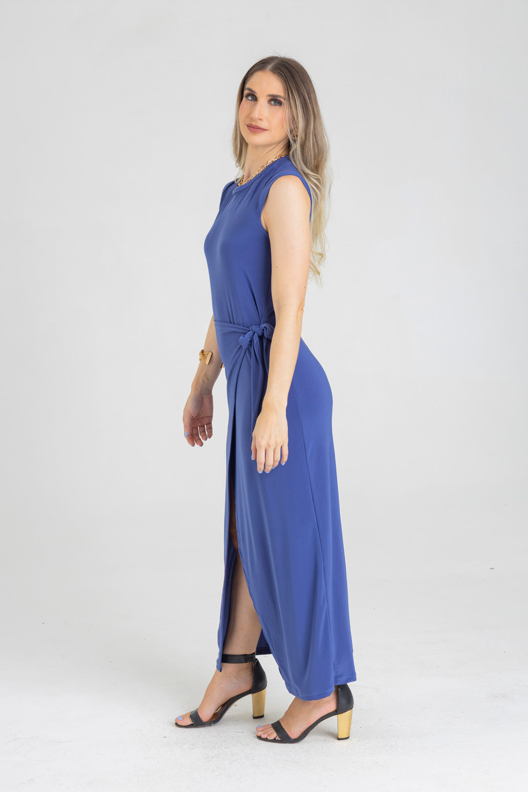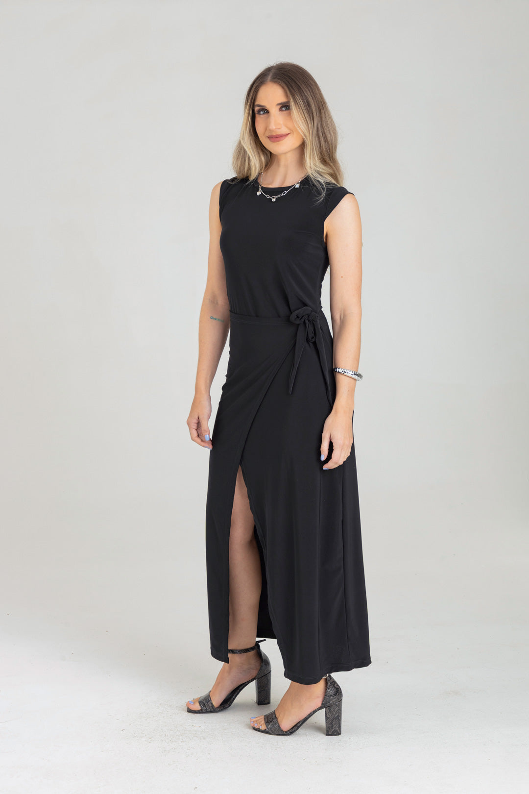 Vestido largo cuello redondo, manga "casquito" y detalle de sobrepuesto en parte inferior. Elaborado en Acetato fondo entero.