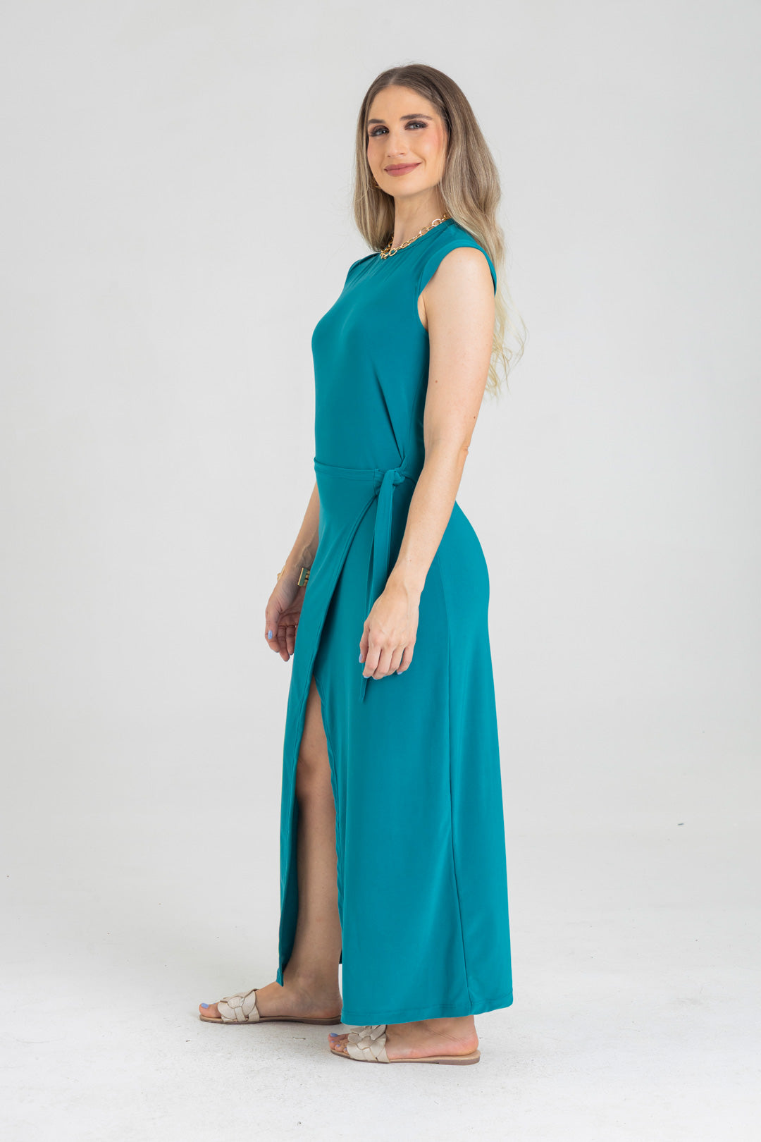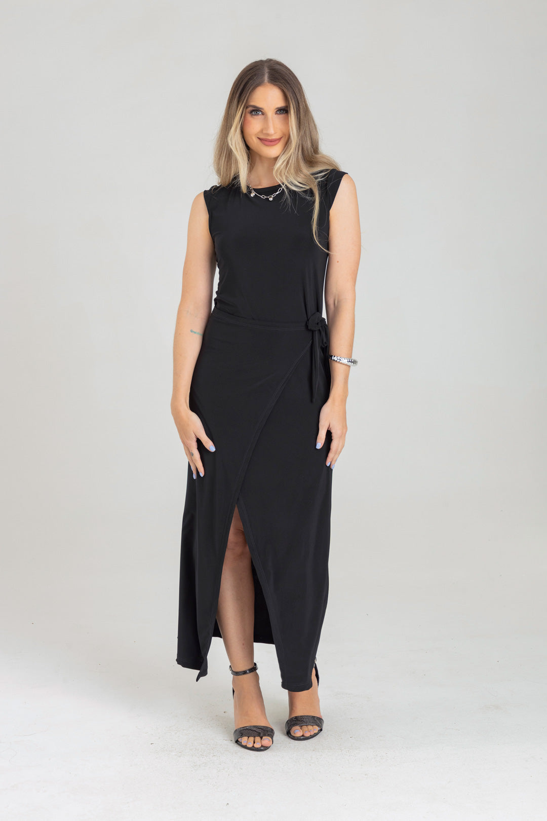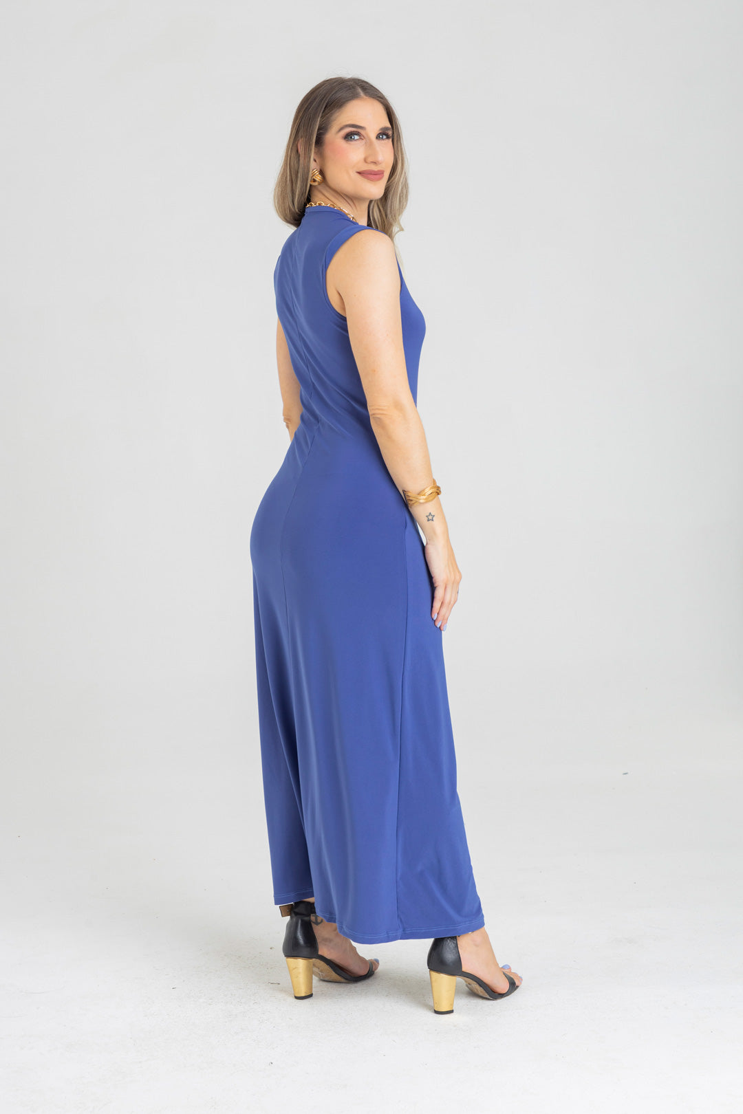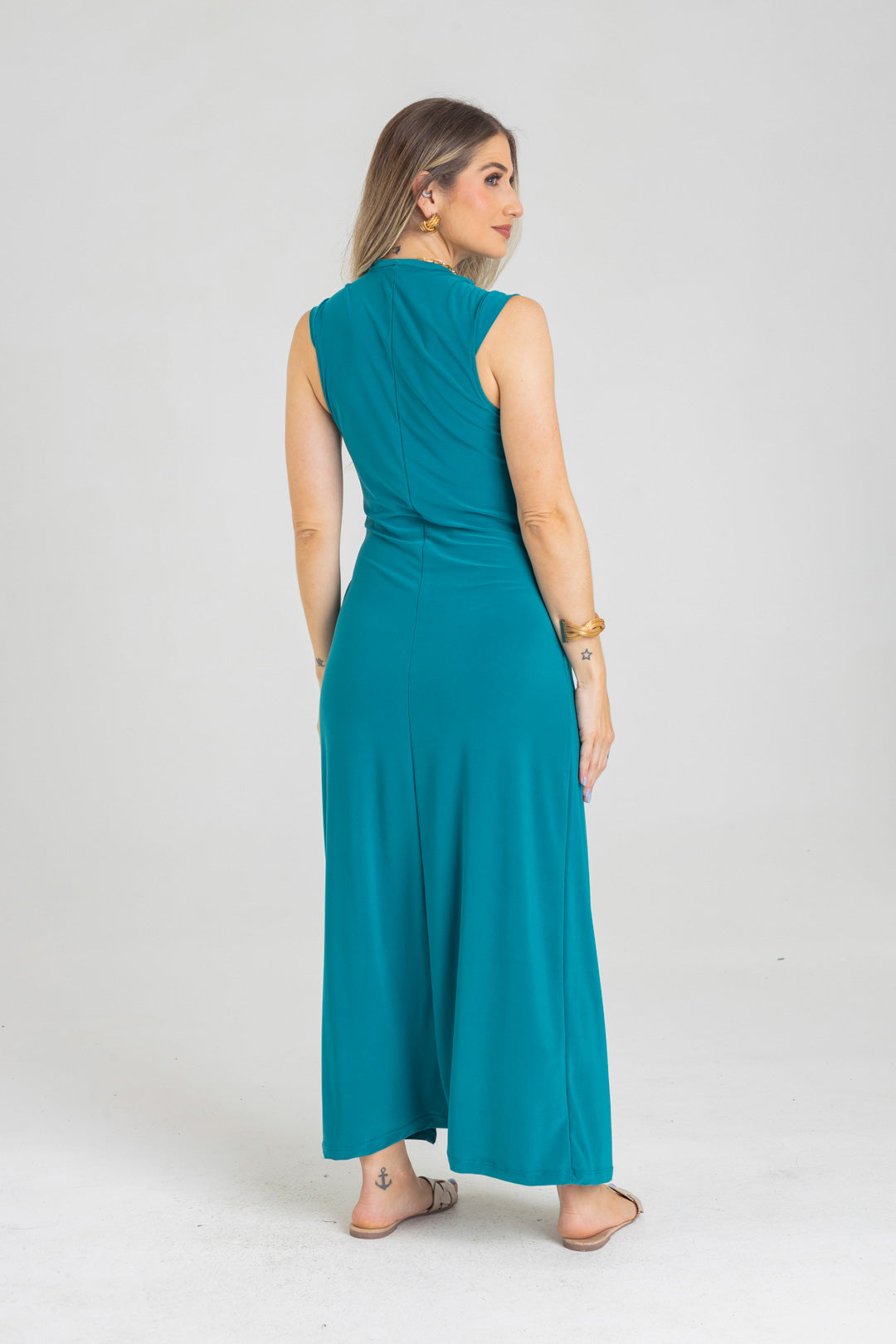 Vestido largo cuello redondo, manga "casquito" y detalle de sobrepuesto en parte inferior. Elaborado en Acetato fondo entero.